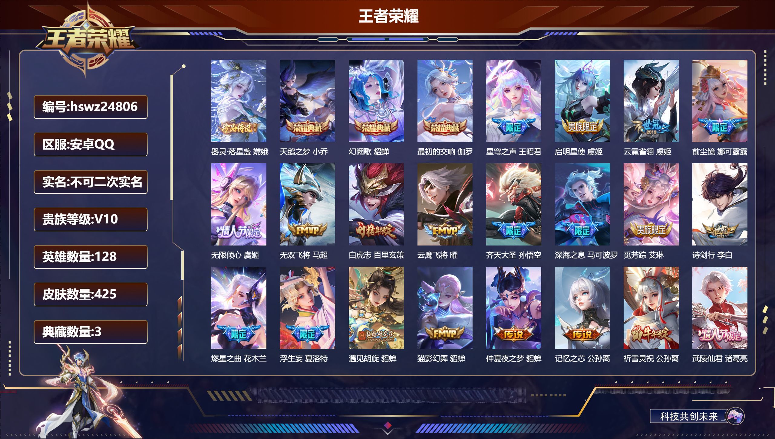 安卓QQ/永恒钻石/425皮肤/128英雄/3典藏/0珍品无双/0无双/1珍品传说/45传说/134