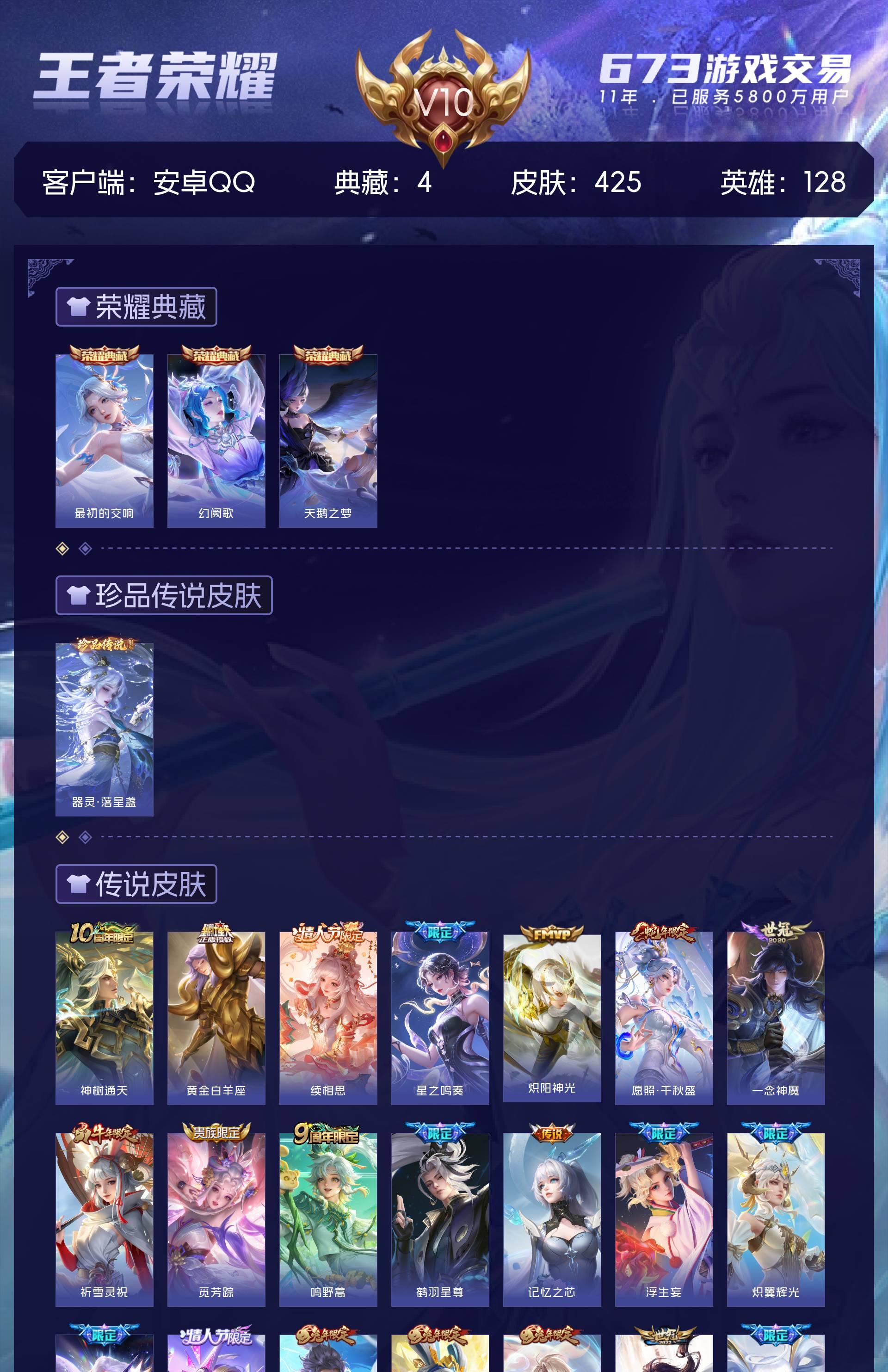 V10 皮肤425 英雄128 永恒钻石 荣耀典藏4 珍品传说1 传说44 其他皮肤382