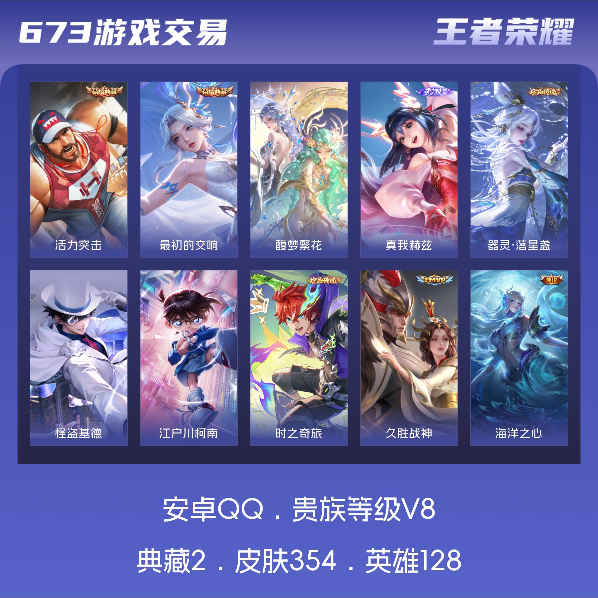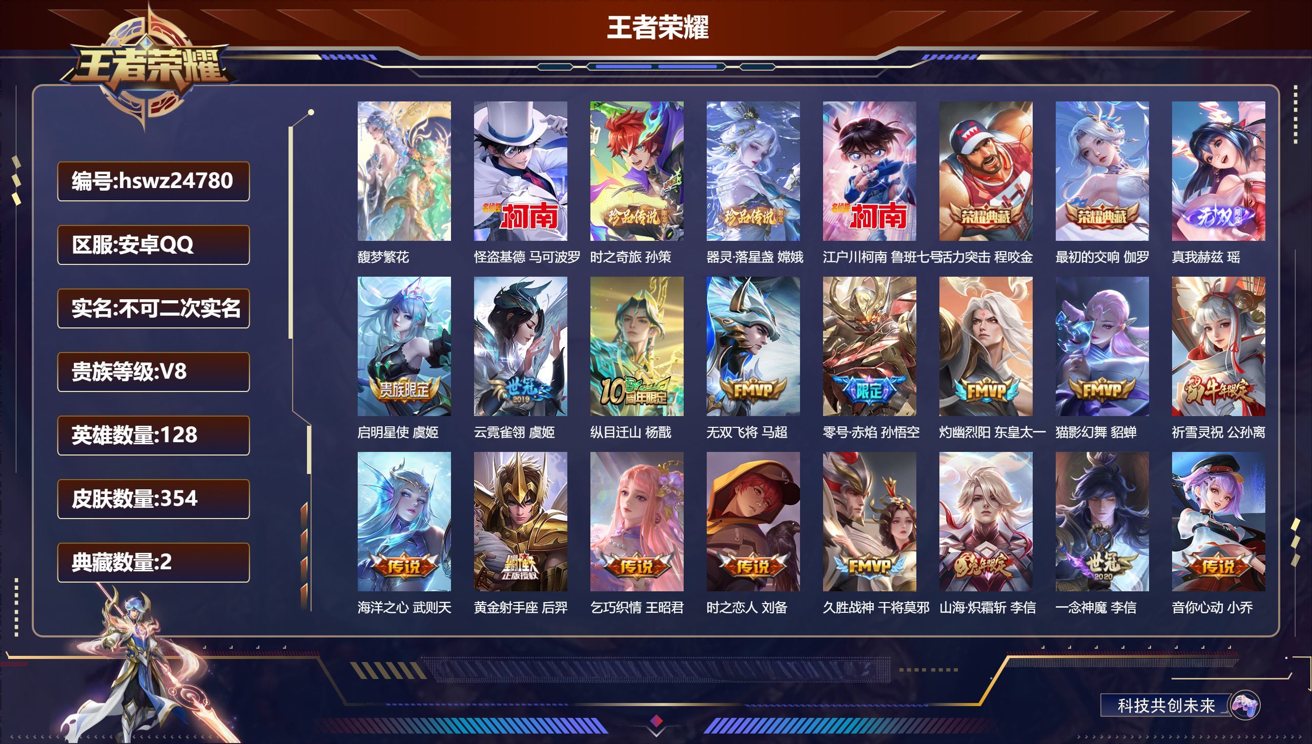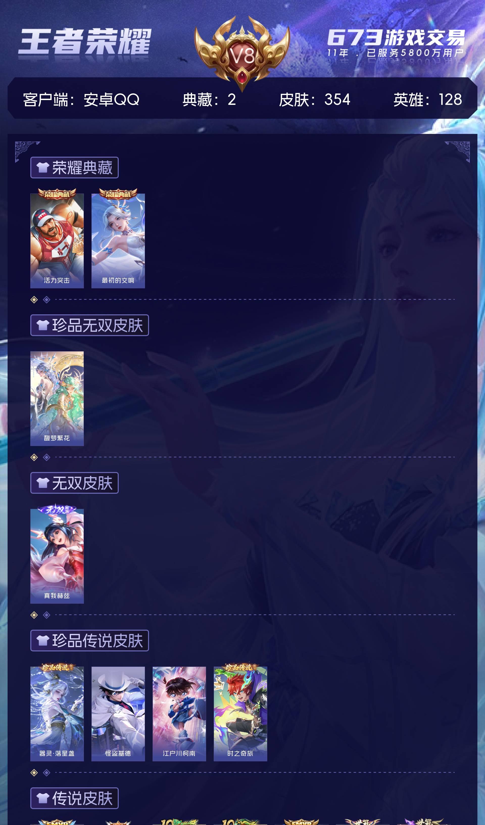 安卓QQ/至尊星耀/354皮肤/128英雄/2典藏/1珍品无双/1无双/4珍品传说/28传说/103