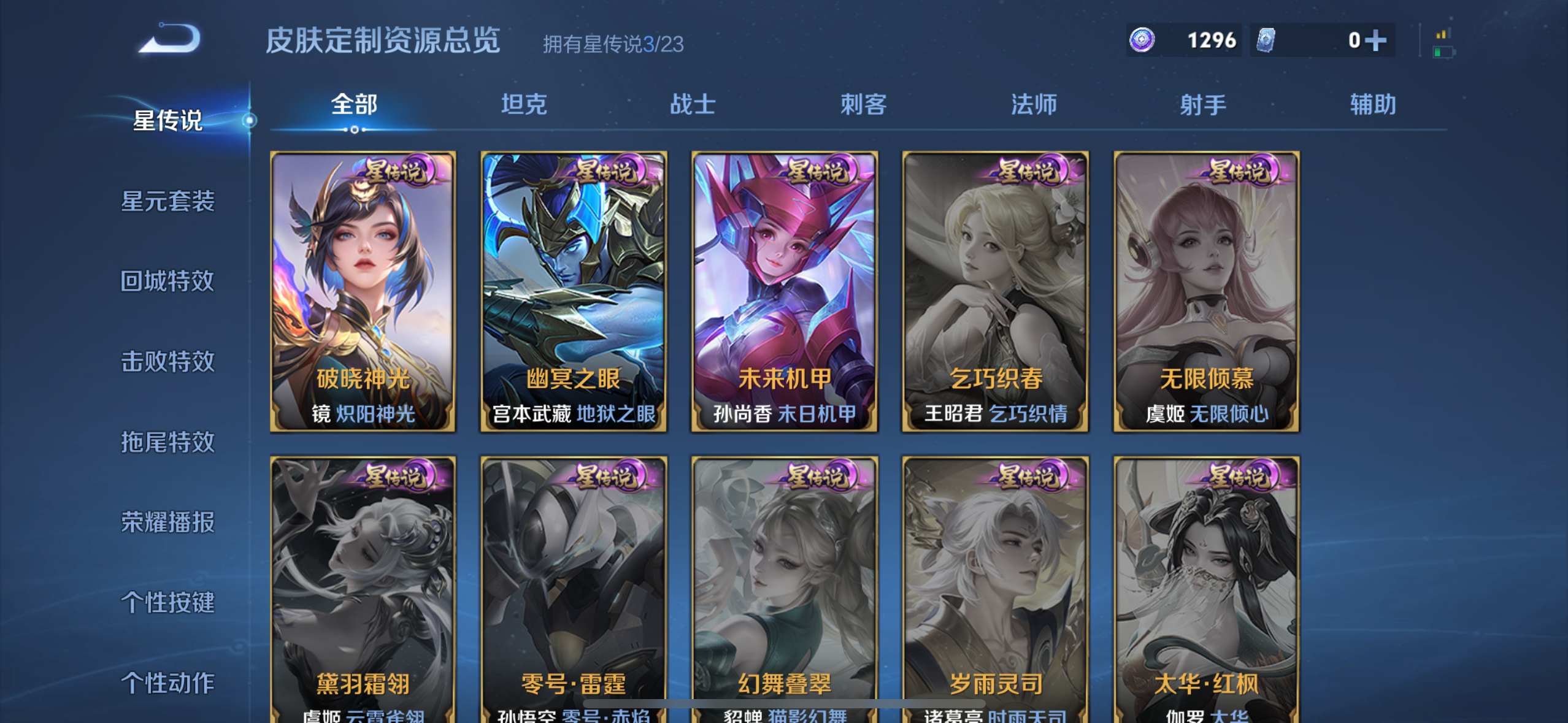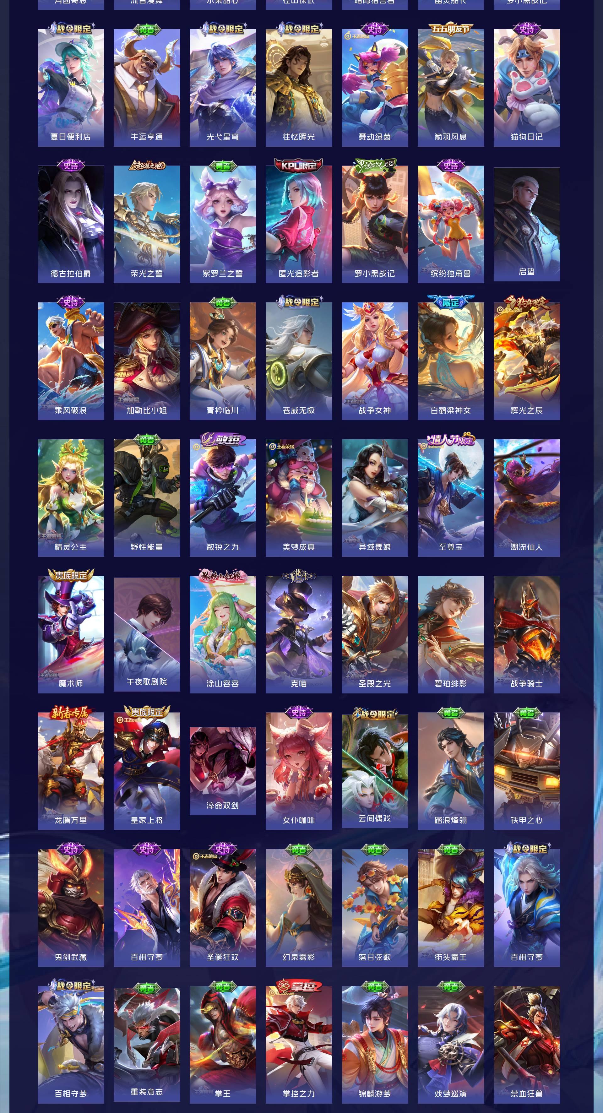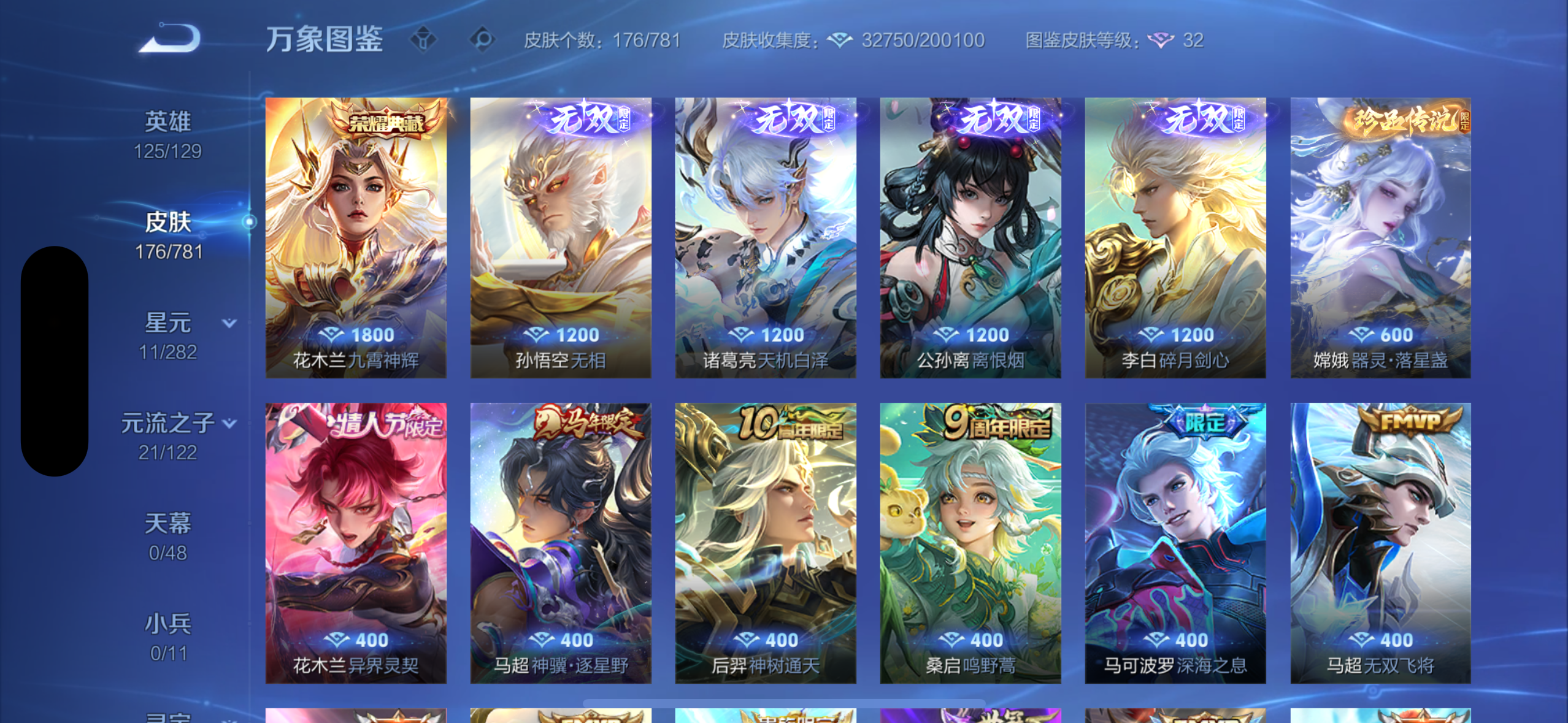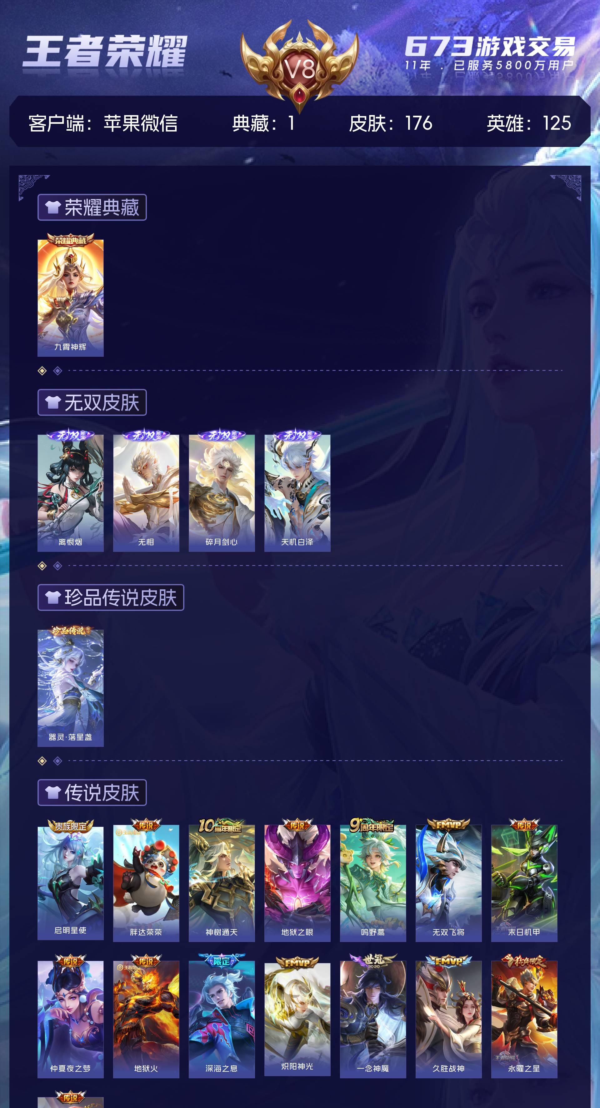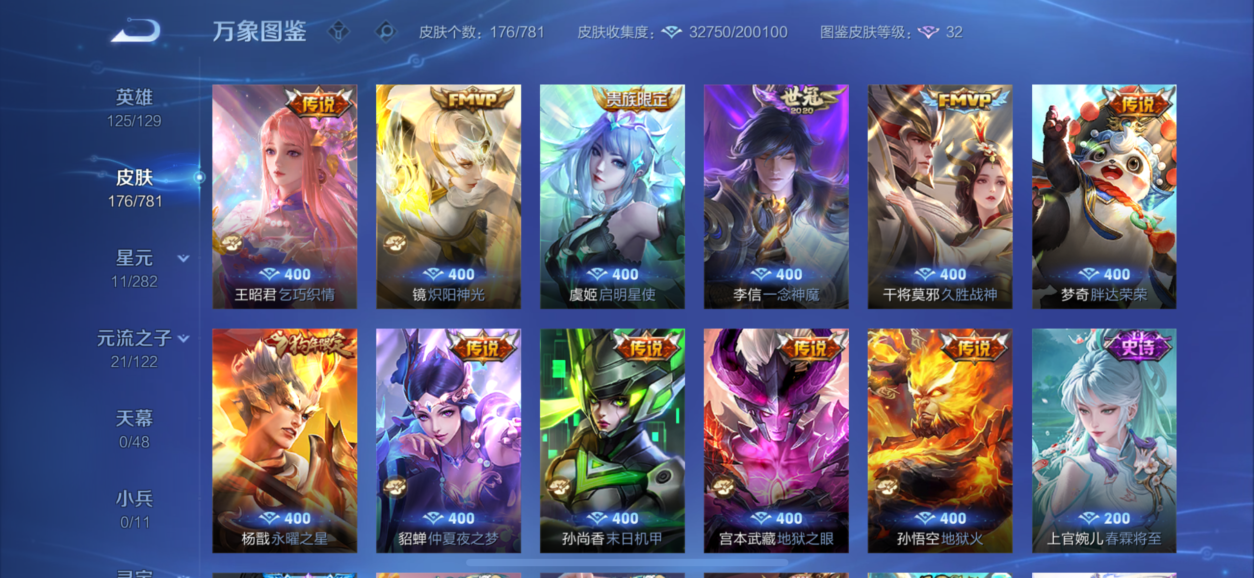 V8 皮肤176 英雄125 荣耀王者 荣耀典藏1 无双皮肤4 珍品传说1 星传说3 传说15 其他皮肤154