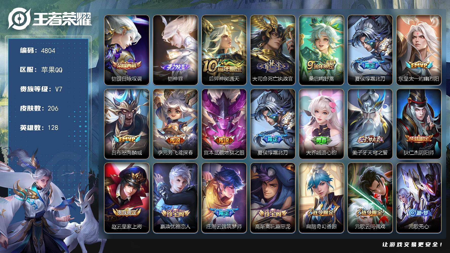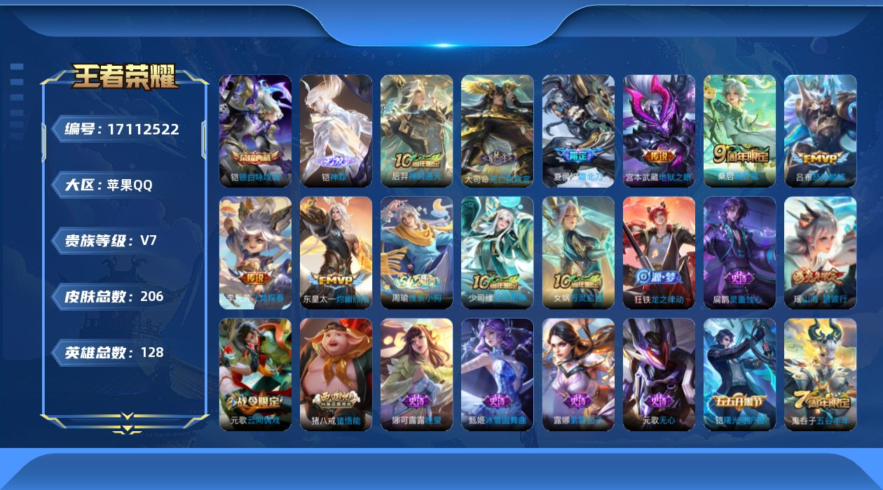 735-[17112522]贵族7-206皮1典藏8传说1无双 苹果手Q115区206皮1典藏8传说1无双V7 营地ID525762562永恒钻石III【无双皮肤】:神罪【荣耀典藏】:银白咏叹调【传说皮肤】:灼幽烈阳,霜北刀,神树通天,死亡执政官,鸣野蒿,怒海麟威,飞鸢探春,地狱之眼【史诗皮肤】:灵蛊蚀心,晚萤,雪上飞焰,巫礼祀神,万灵启世,龙之律动,节奏热浪,箭羽风息,舞动绿茵,百相守梦,圣诞恋歌,月团寄思,水晶猎龙者,紫霞仙子,猫狗日记,优雅恋人,鬼剑武藏,偶像歌手,猫狗日记,乱世虎臣,天才