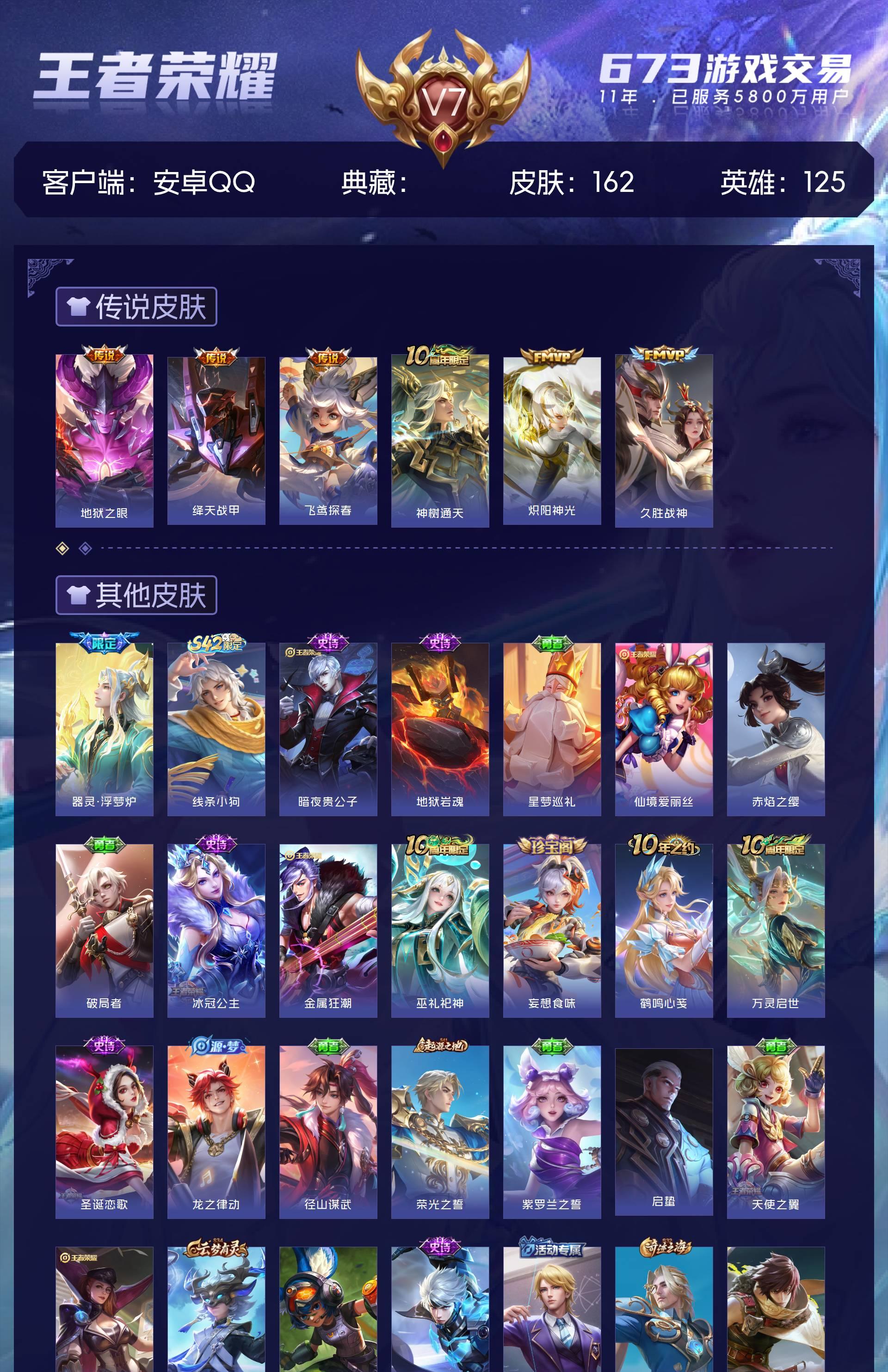 V7 皮肤162 英雄125 永恒钻石 传说6 其他皮肤161
