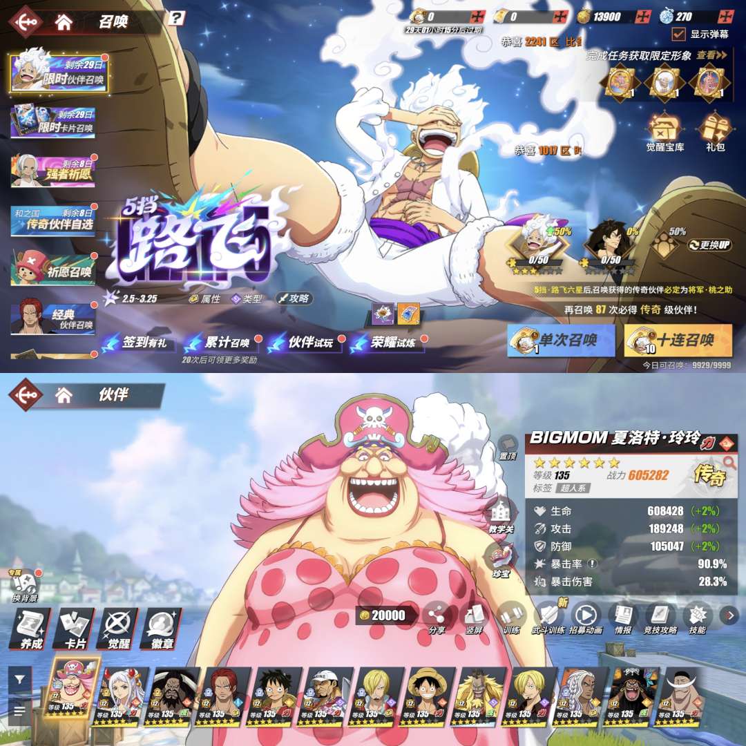 7935万战力。尼卡路飞83传奇15强者。3个98友情技。1万3金果。23艘船。单战最高60.5