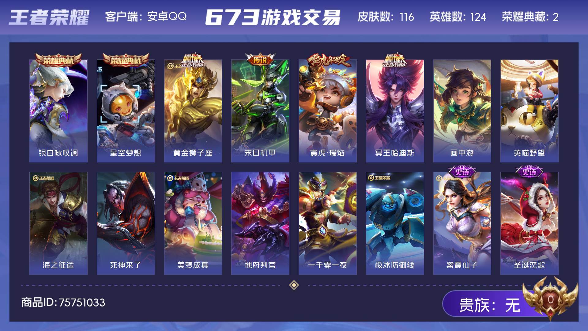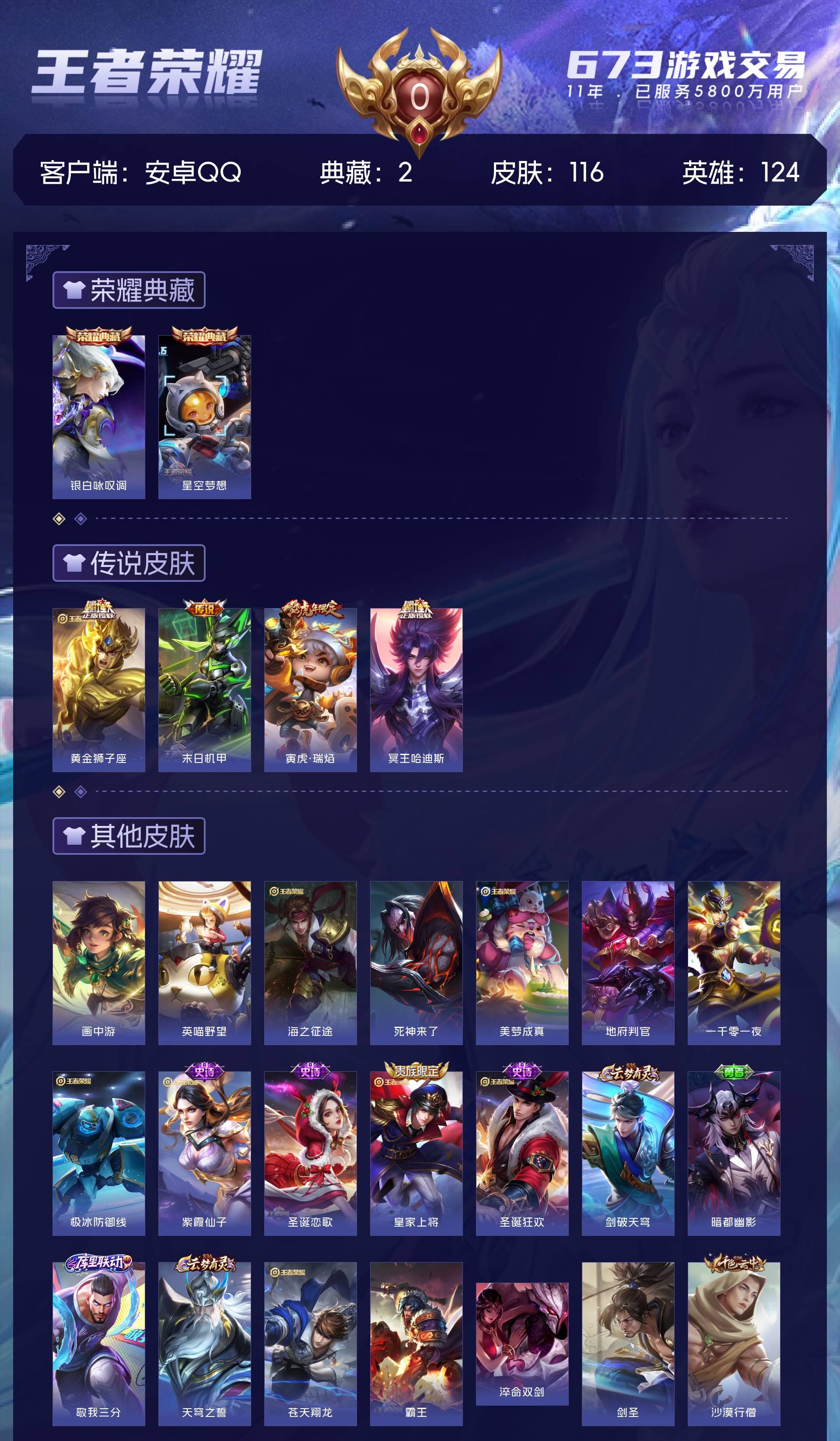 皮肤116 英雄124 尊贵铂金 荣耀典藏2 传说4 其他皮肤116