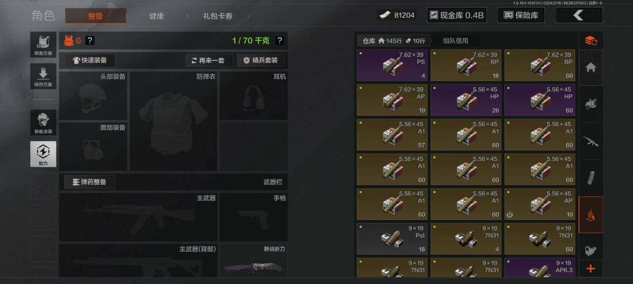仓库价值(百万):449.7/柯恩币:388200000/野战折刀