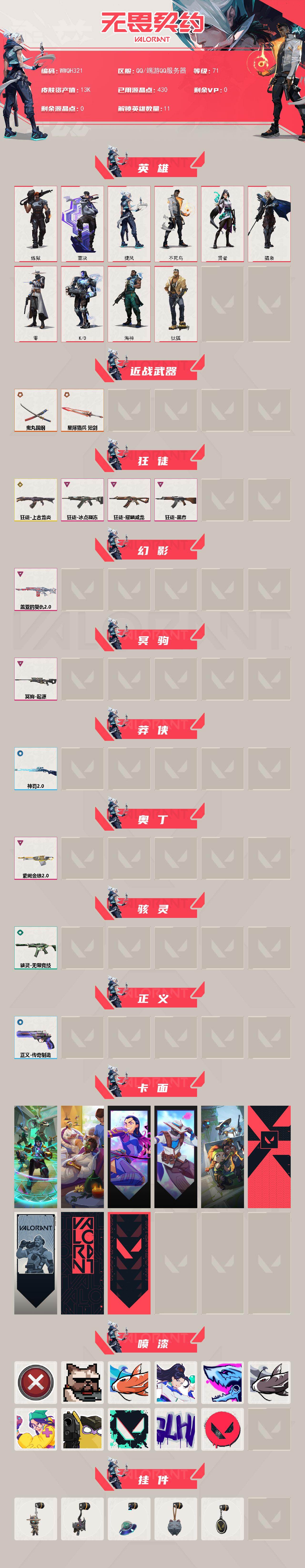 【WWQH321】终极*3/传奇*1/卓越*6/皮肤*37/等级*71/段位:白银/炼狱/钛狐/壹决/捷风/不死鸟/贤者/猎枭/零/K/O/海神/近战武器-鬼丸国纲/近战武器-星际猎兵 短剑/狂徒-上古龙炎/狂徒-冰点凝冻/狂徒-黑市/狂徒-耀鳞威龙/幻影-盖亚的复仇//2.0/冥驹-起源/莽侠-神罚//2.0/奥丁-紫阙金琅//2.0/骇灵-无限竞技/正义-传奇制造/哨卫者之领域 卡面/源能者美容 卡面/无畏契约GO!第一卷:芮娜 卡面/无畏契约GO!第一卷:零 卡面/别冒尖 卡面/代号红色