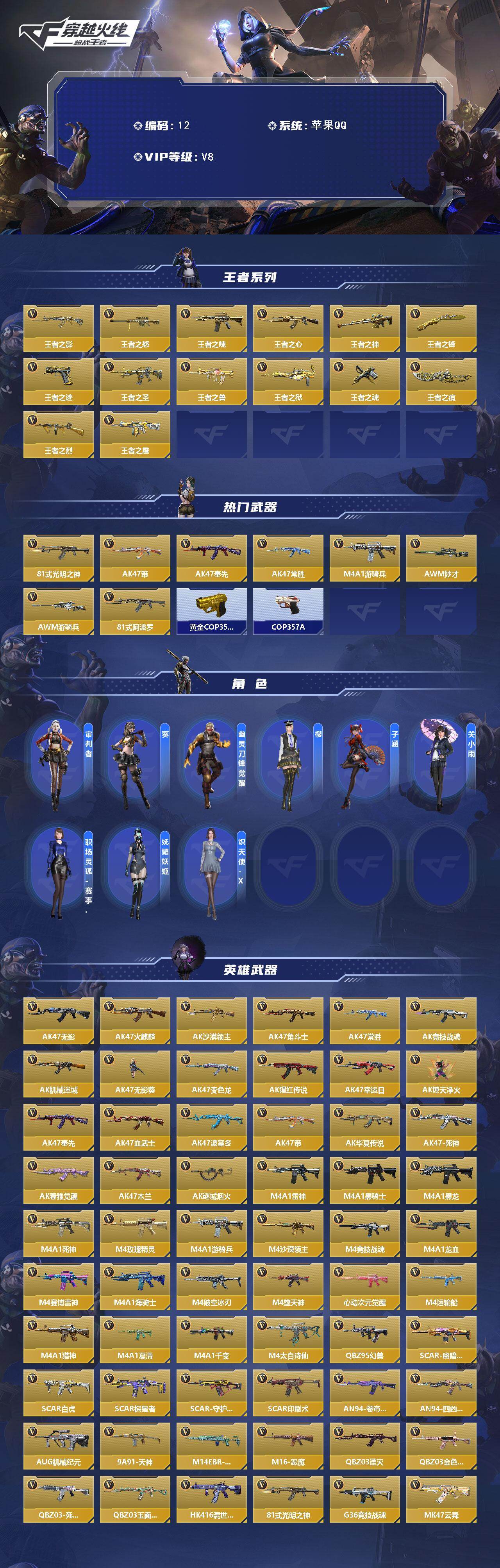 WLQZ508【V8 292V 335金V 5至尊2同框 心至尊 魄至尊 怒至尊 圣至尊 狱至尊 冰皮王圣 冰皮王迹 冰片王痕 王魄HS 王魂HS 王锋HS 奉先 AK47策 m4游骑兵套带皮 AWM游骑兵带皮 cop飞龙在天 黄金cop 王影 王兽 王尊 王神 王烈 王霆 常胜 妙才 】【等级】150【区服】手Q-苹果【金角色数】10【金武器数】292【金V角色】 樱 审判者 幽灵刀锋-觉醒 葵 关小雨 职场灵狐-赛事经理 子涵 妩媚妖姬 炽天使-X 救世主-X 复仇者 复仇者 【金V武器】