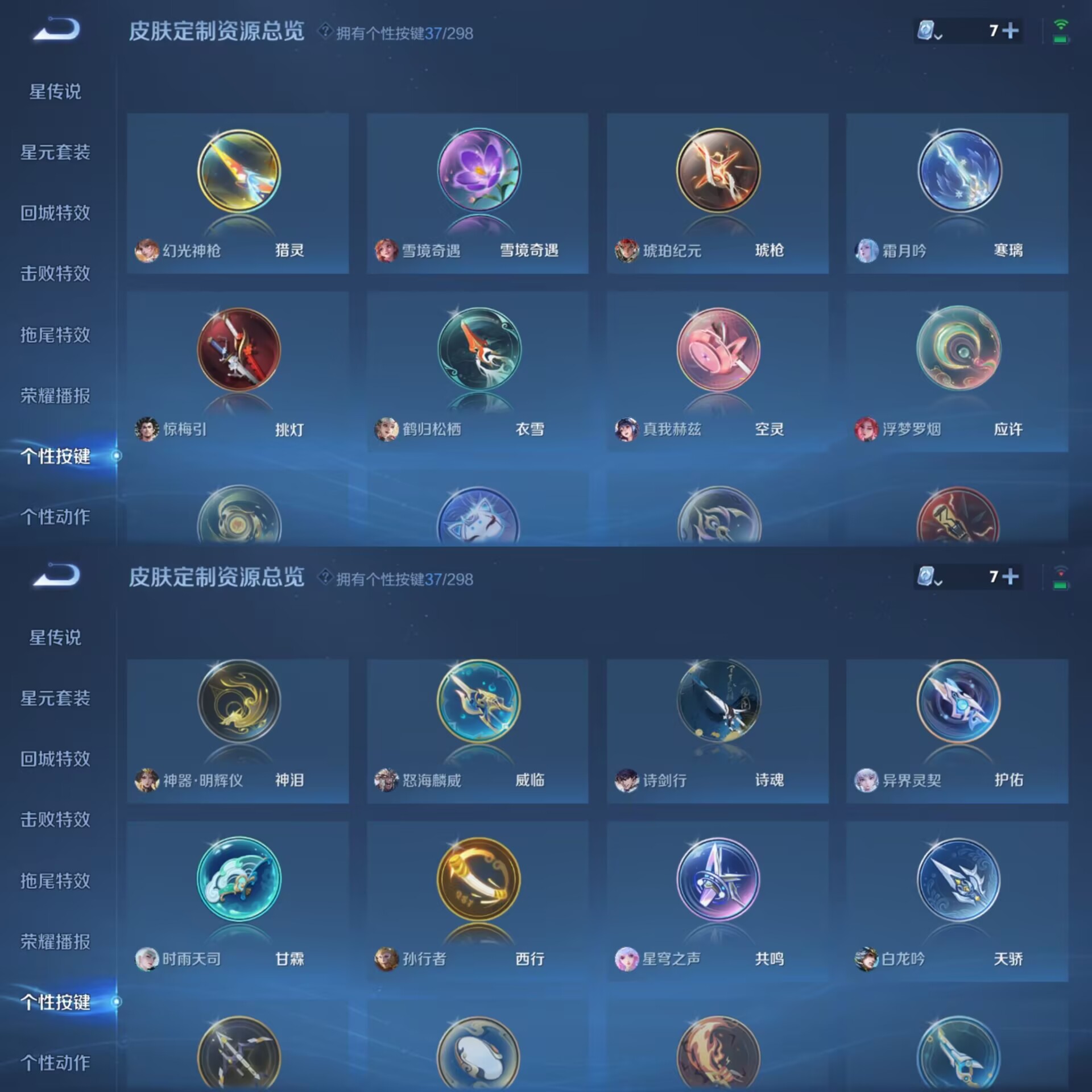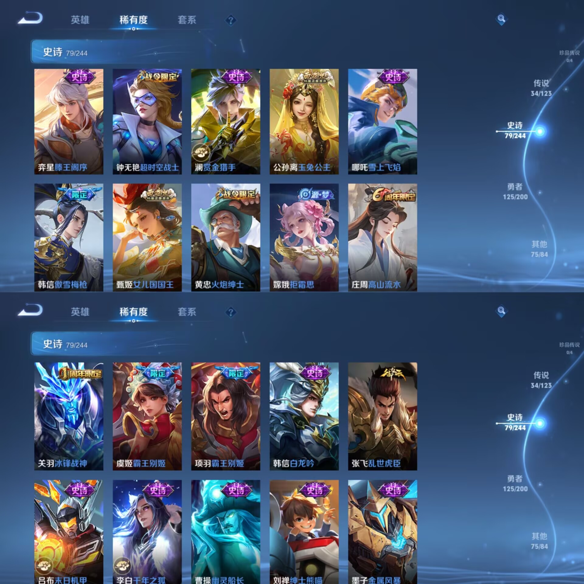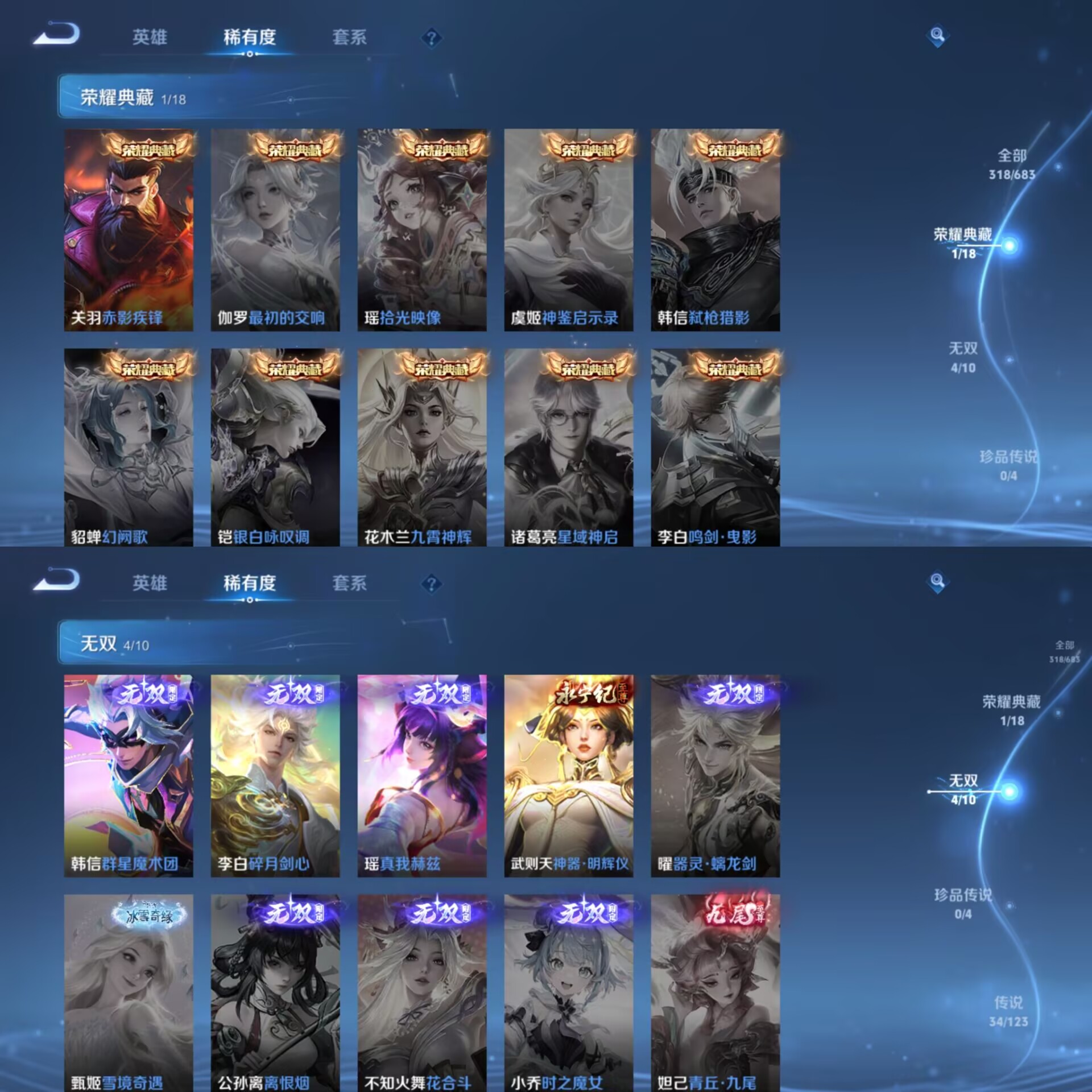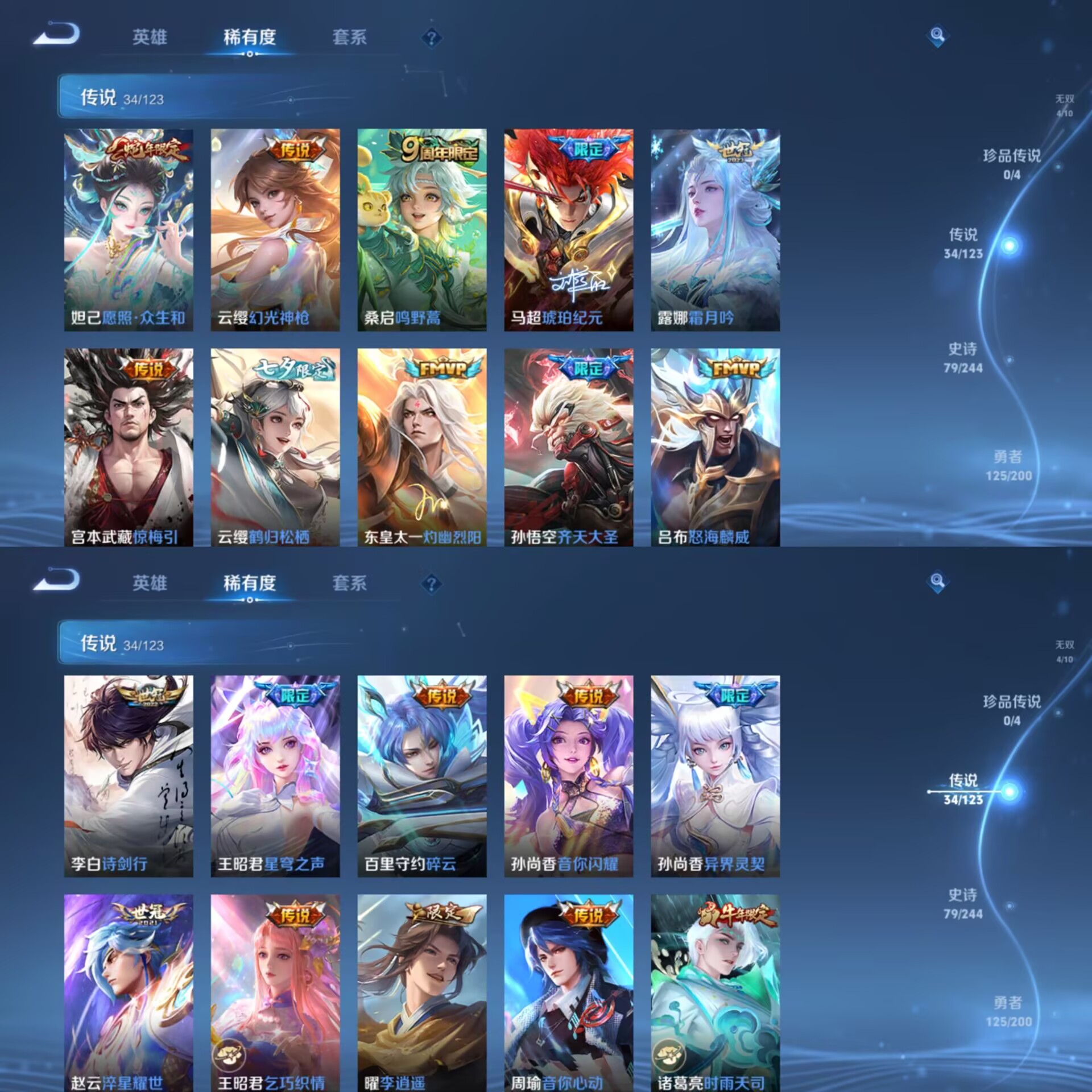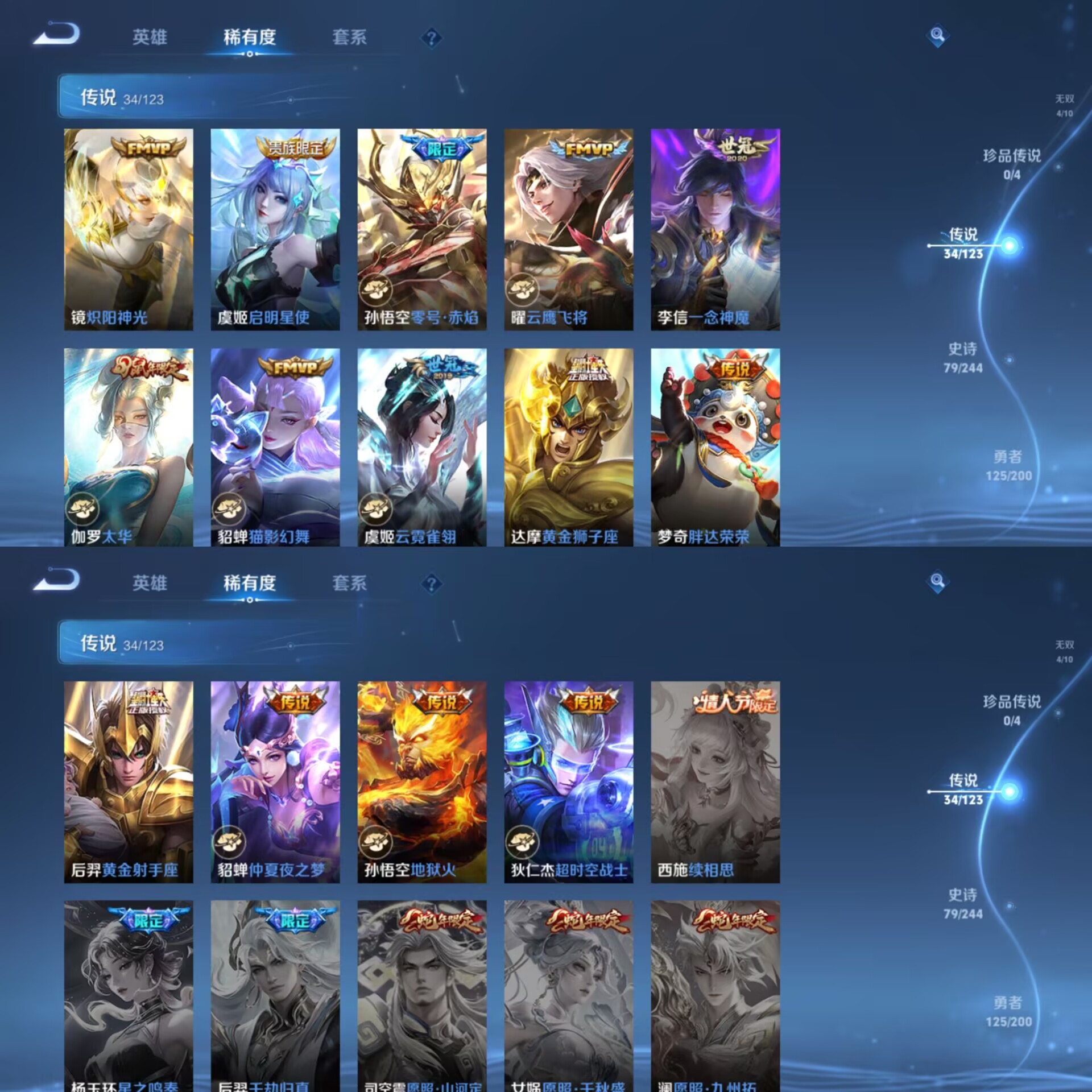 【传说皮肤】 灼幽烈阳 鸣野蒿 鹤归松栖 惊梅引 霜月吟 琥珀纪元 幻光神枪 愿照·众生和 齐天大圣 诗剑行 星穹之声 碎云 音你闪耀 黄金狮子座 超时空战士 仲夏夜之梦 猫影幻舞 太华 黄金射手座 炽阳神光 一念神魔 胖达荣荣 异界灵契 地狱火 零号·赤焰 乞巧织