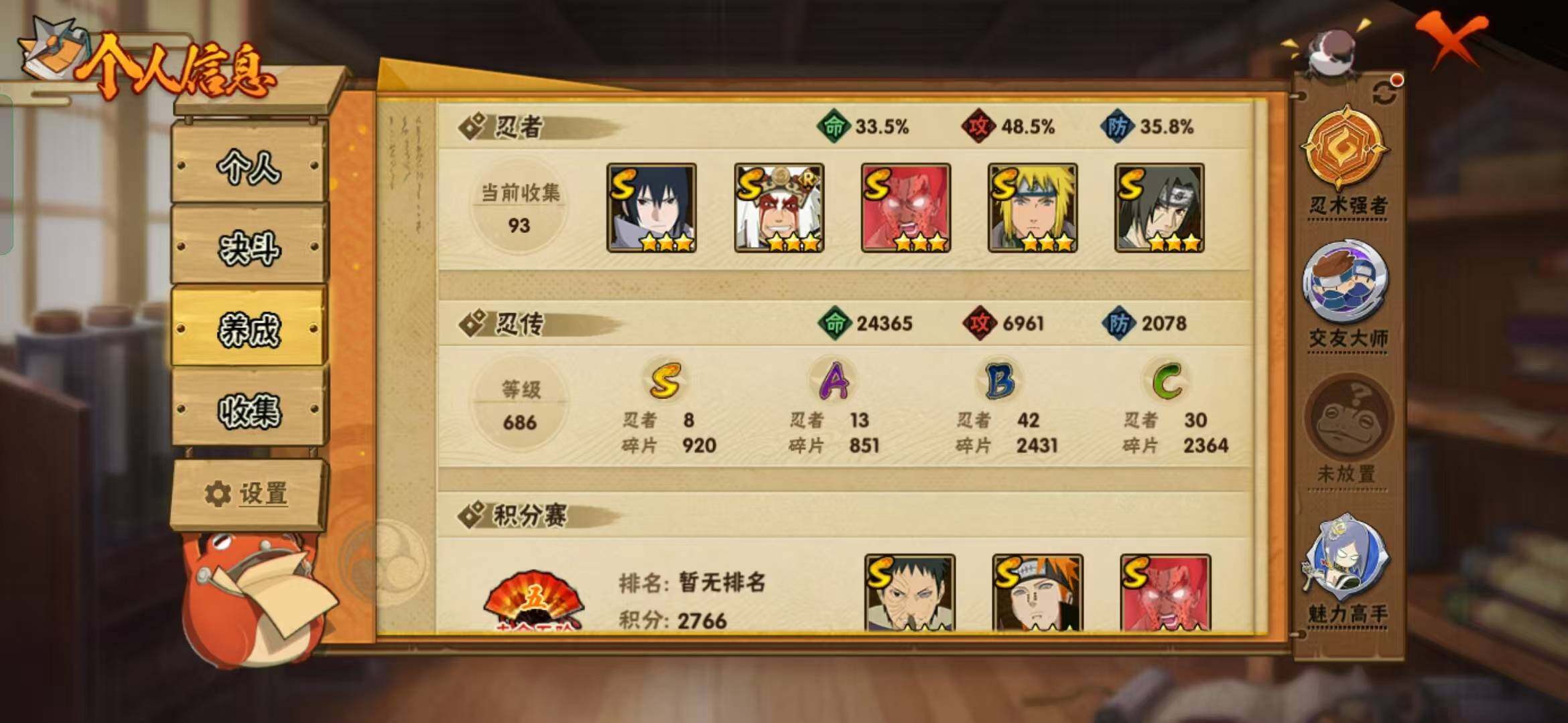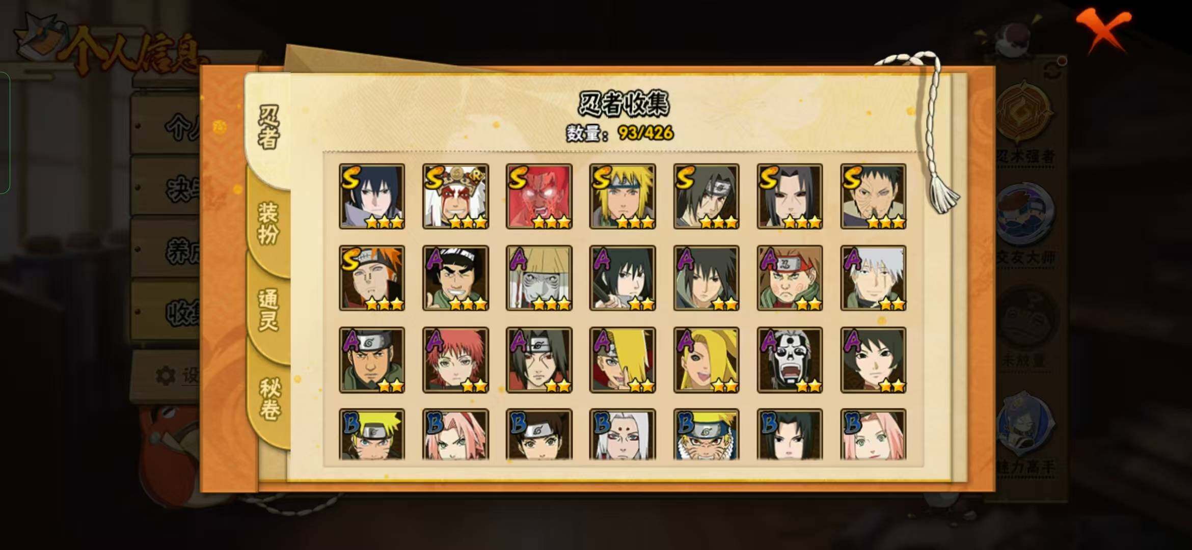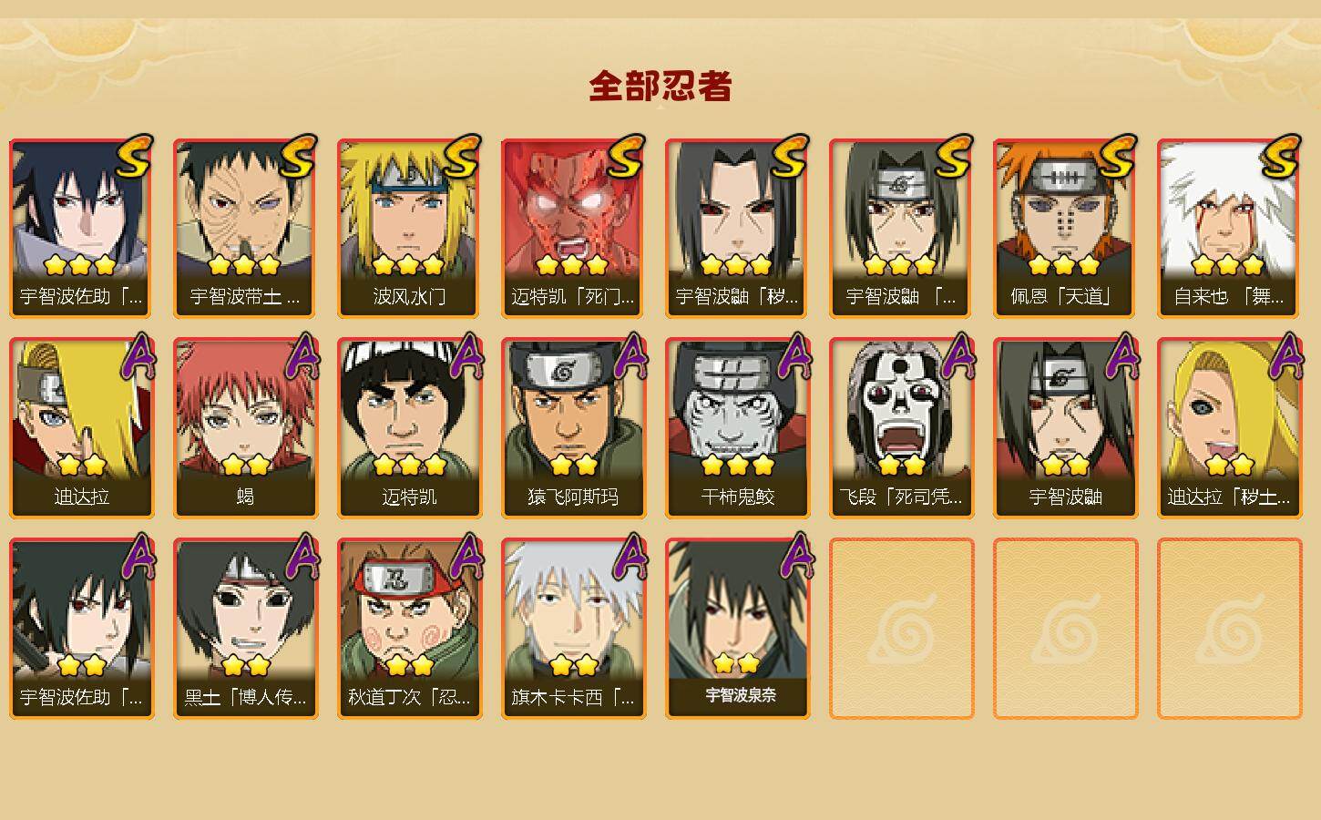 【S级忍者】:宇智波鼬「秽土转生」(3星),宇智波带土「忍界大战」(3星),宇智波鼬「须佐能乎」(3星),自来也「舞之豪杰」(3星),波风水门(3星),迈特凯「死门」(3星),佩恩「天道」(3星),宇智波佐助「永恒万花筒」(3星)