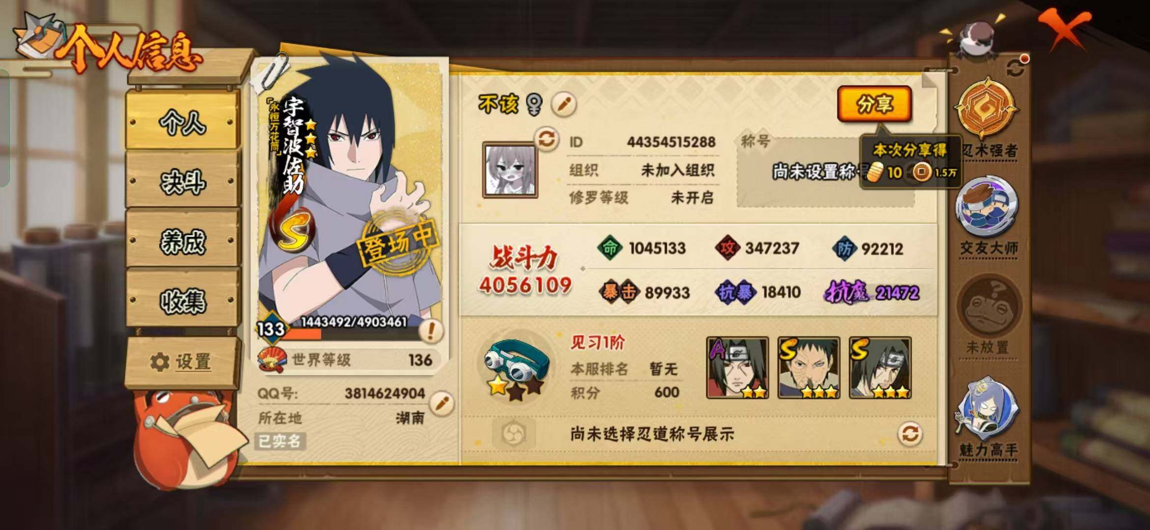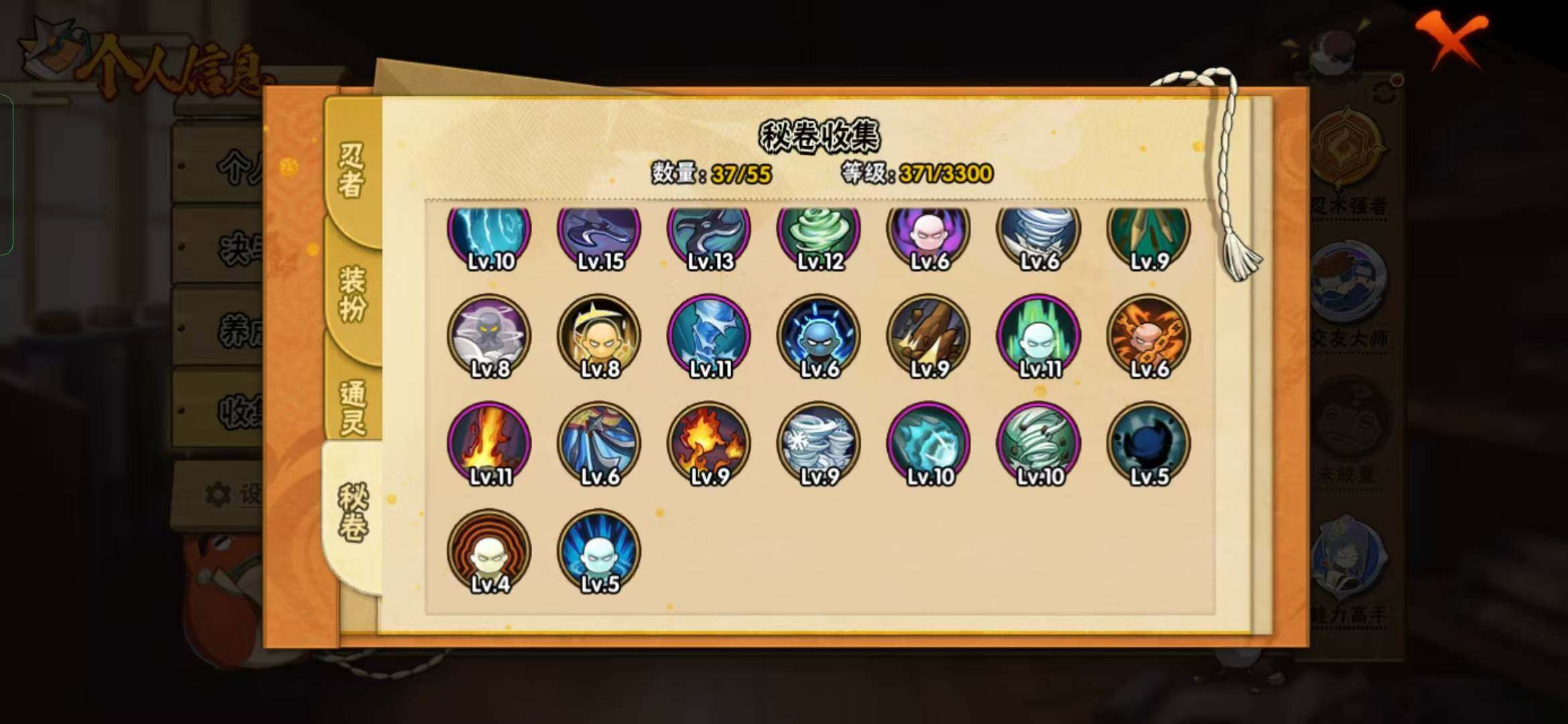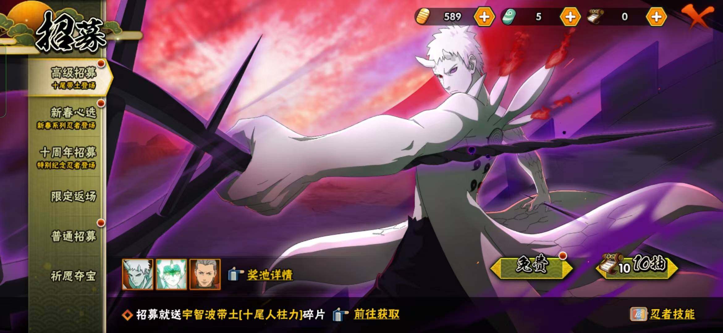 【S级忍者】:宇智波鼬「秽土转生」(3星),宇智波带土「忍界大战」(3星),宇智波鼬「须佐能乎」(3星),自来也「舞之豪杰」(3星),波风水门(3星),迈特凯「死门」(3星),佩恩「天道」(3星),宇智波佐助「永恒万花筒」(3星)