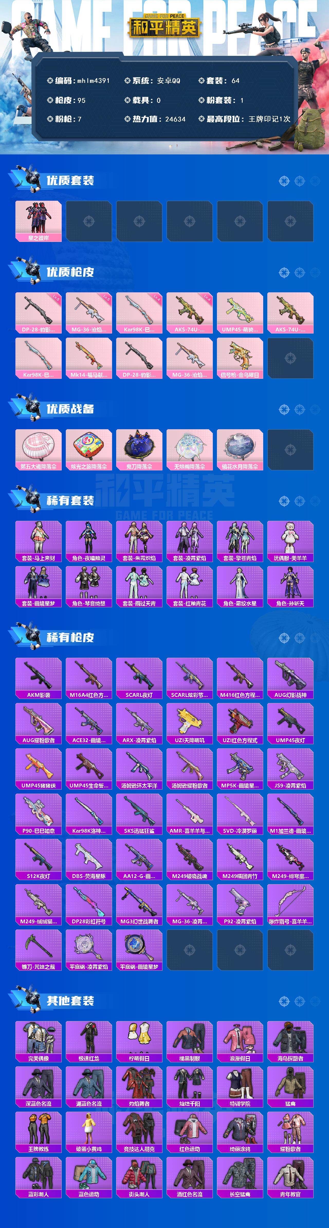 【mhlm4391】安卓 手Q-1粉装-7特效枪-0载具-1粉色飞行器-24634热力值-1王牌印记-64套装-95枪皮