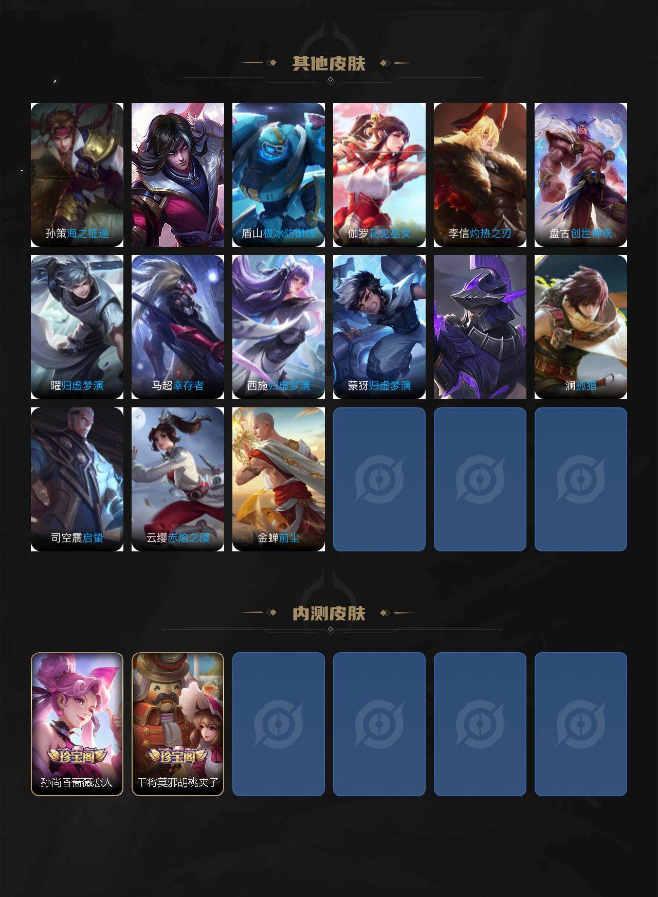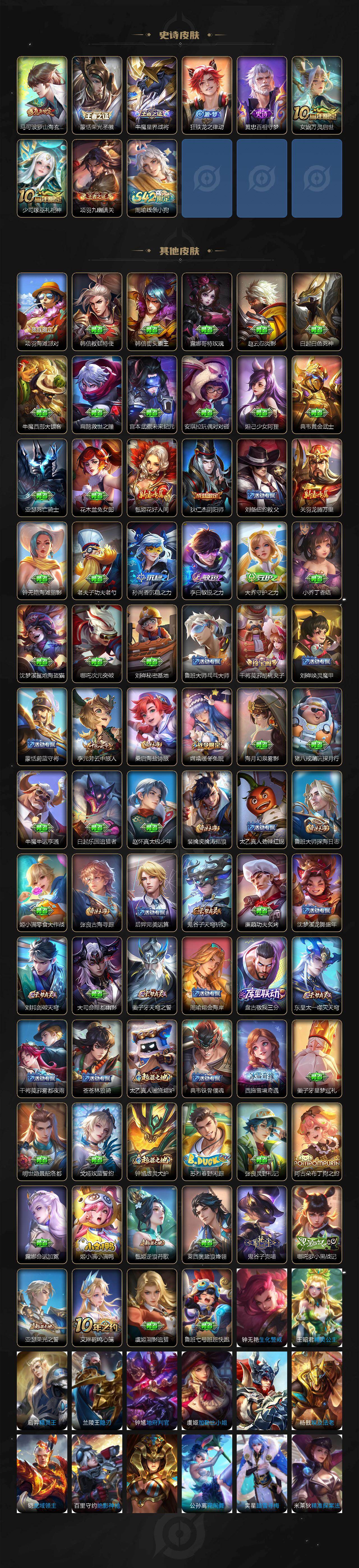 【限定皮肤】:姜子牙天穹之誓,狄仁杰阴阳师,赵云皇家上将,赵云百木心枪,孙尚香蔷薇恋人,元歌无心,马可波罗山海玄木吟,狄仁杰魔术师,项羽海滩派对,孙悟空齐天大圣,李元芳云中旅人,干将莫邪胡桃夹子,百里玄策原初追逐者,裴擒虎擒涛扼浪,嫦娥暖冬兔眠,鲁班大师探海日志,桑启海盐