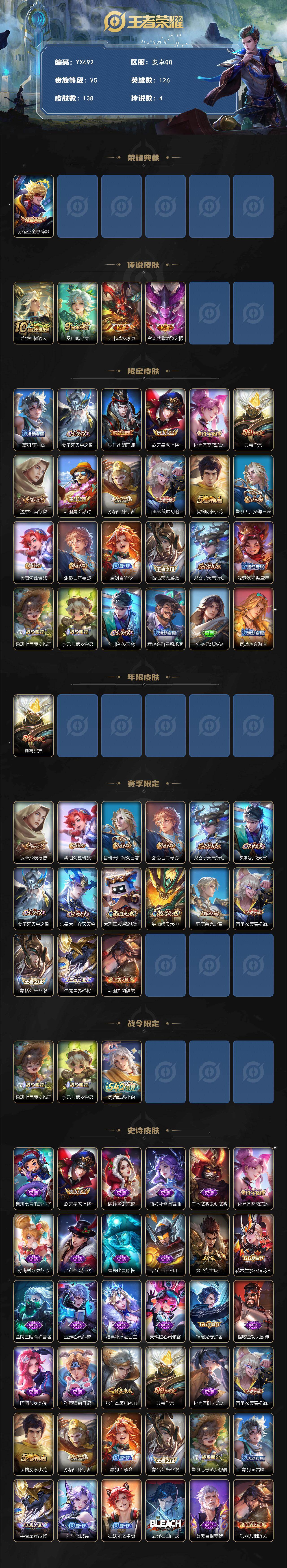 【送和平1粉2特效】138皮肤1典藏4传说/岱宗/孙行者/全息碎影/战鼓燎原/地狱之眼/神树通天/鸣野蒿