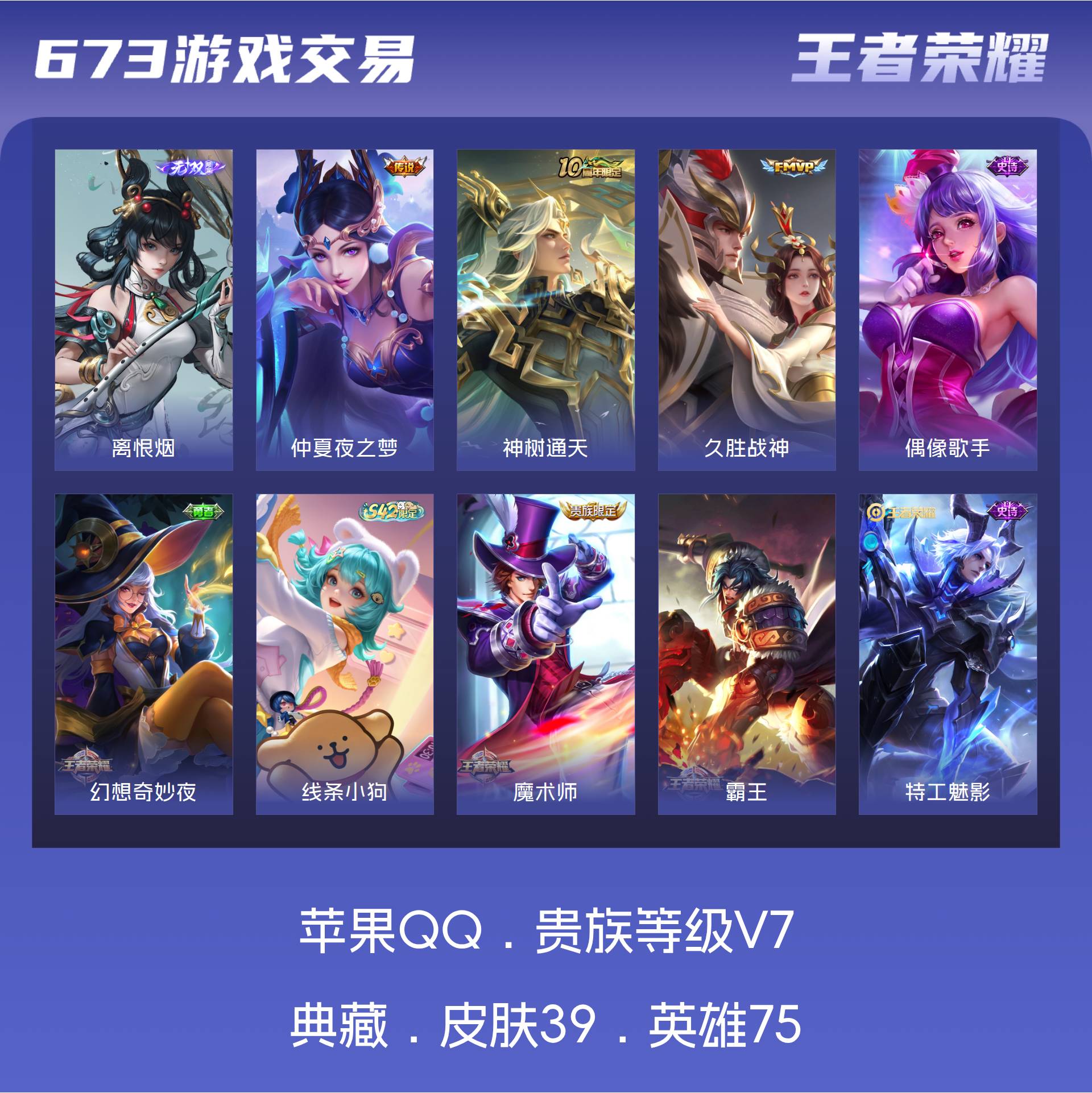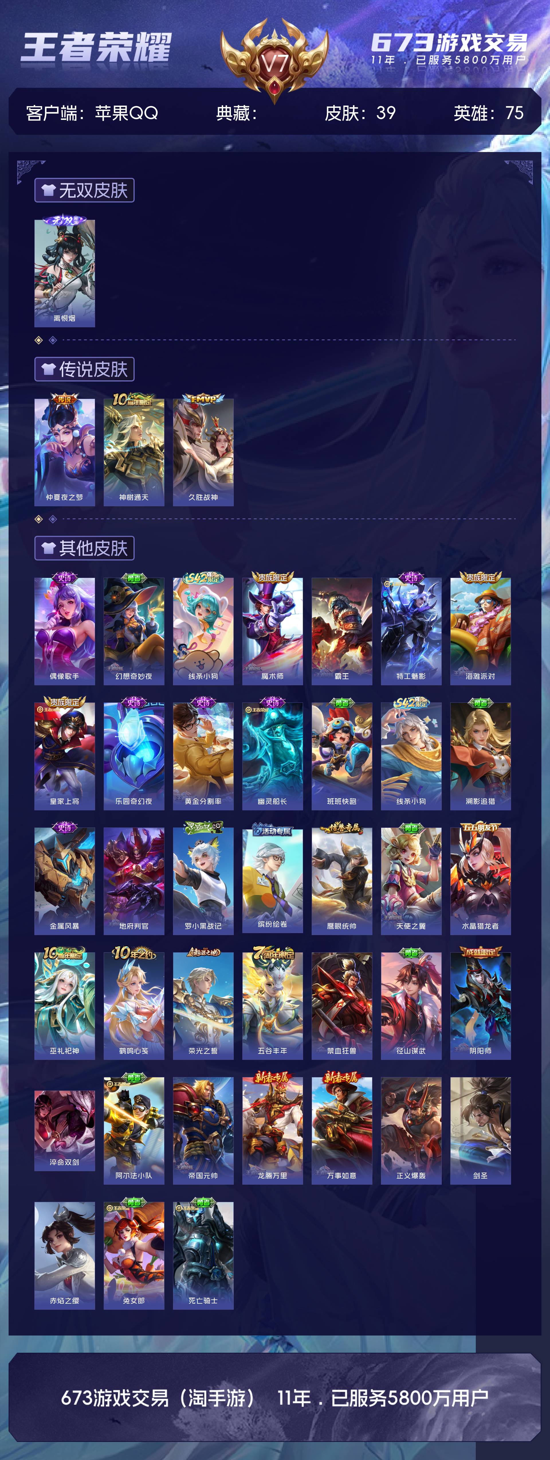 V7 皮肤39 英雄75 无双王者 无双皮肤1 传说3 其他皮肤38