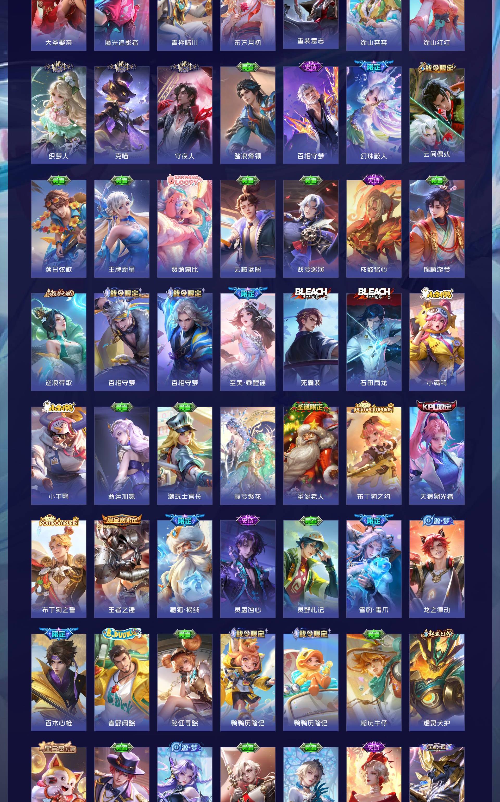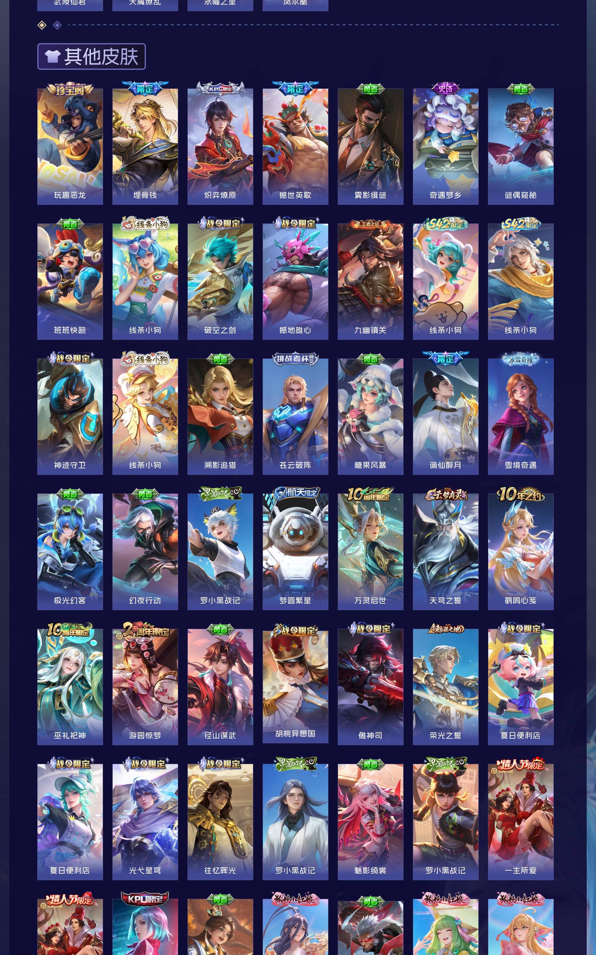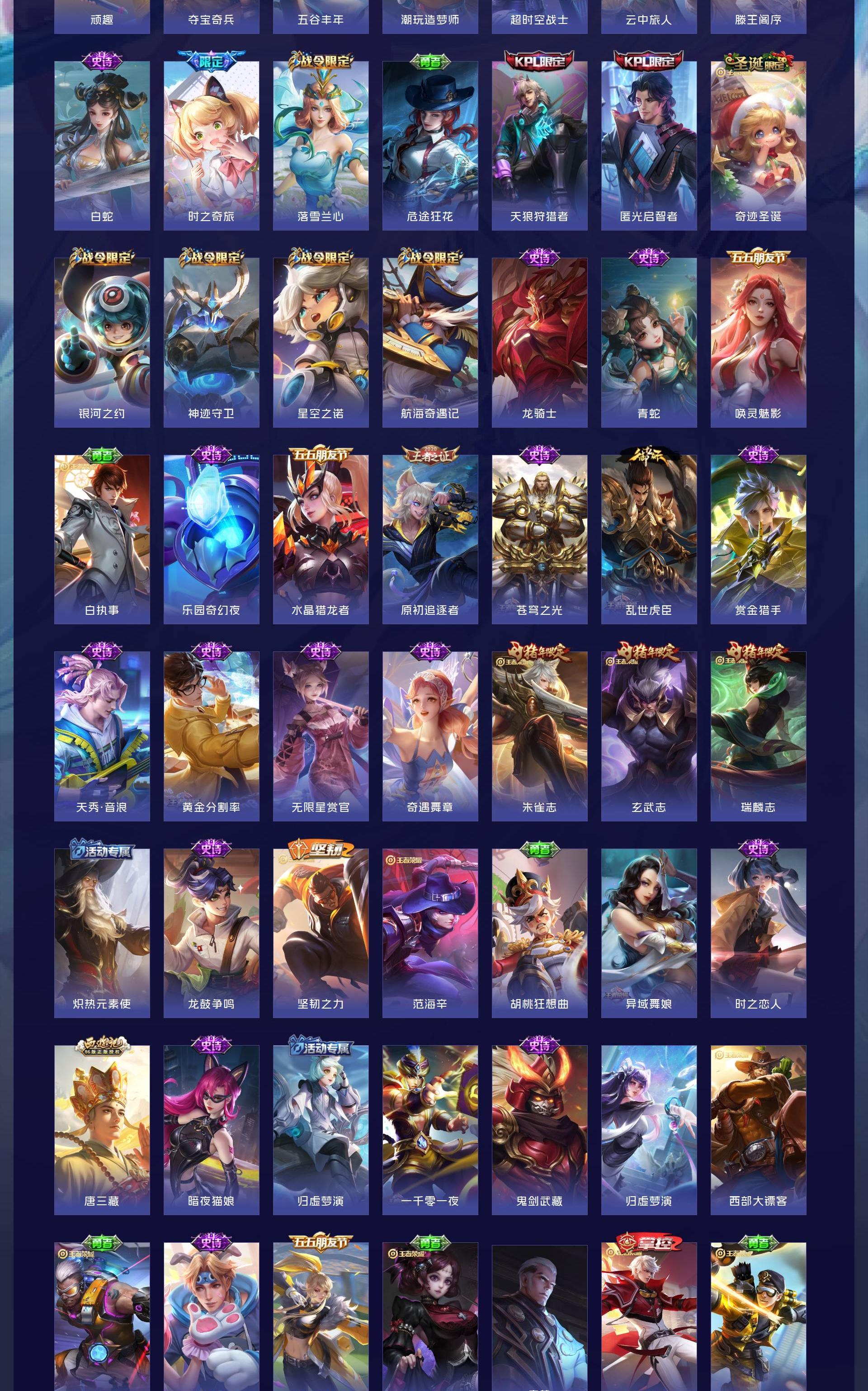荣耀贵族 皮肤708 英雄129 荣耀王者 荣耀典藏20 珍品无双1 无双皮肤13 珍品传说7 星传说12 传说124 其他皮肤532