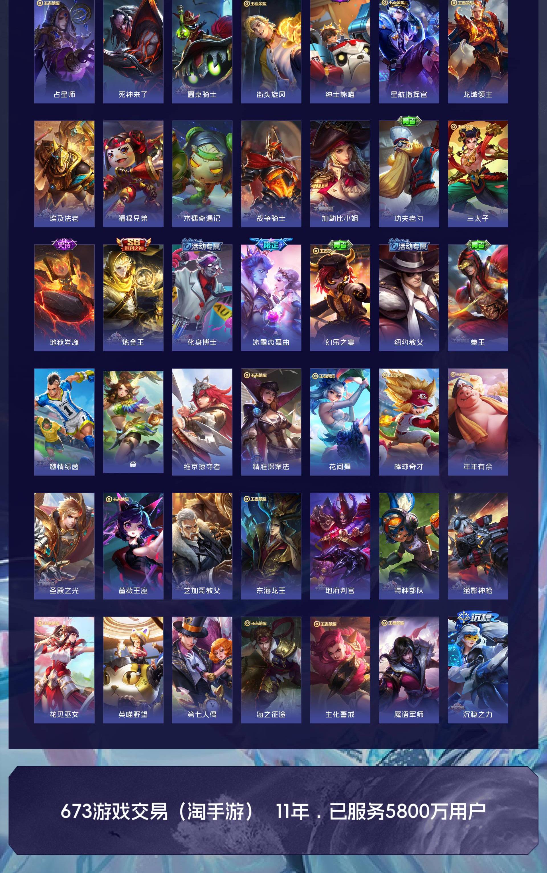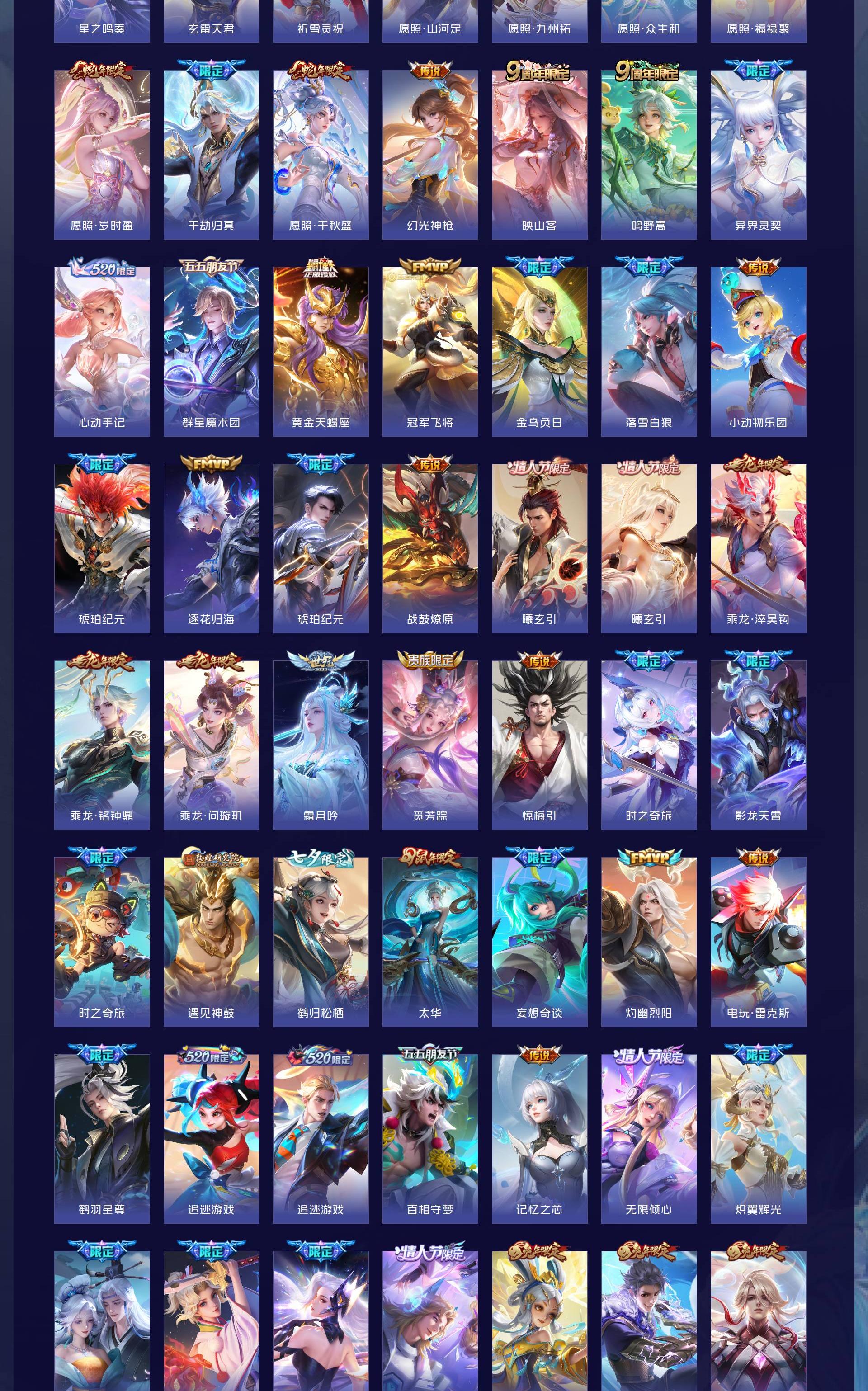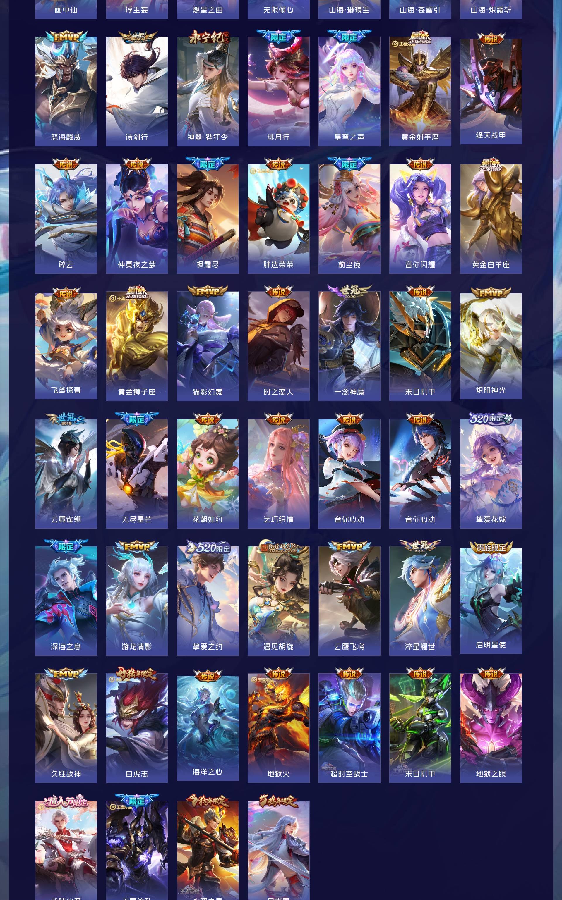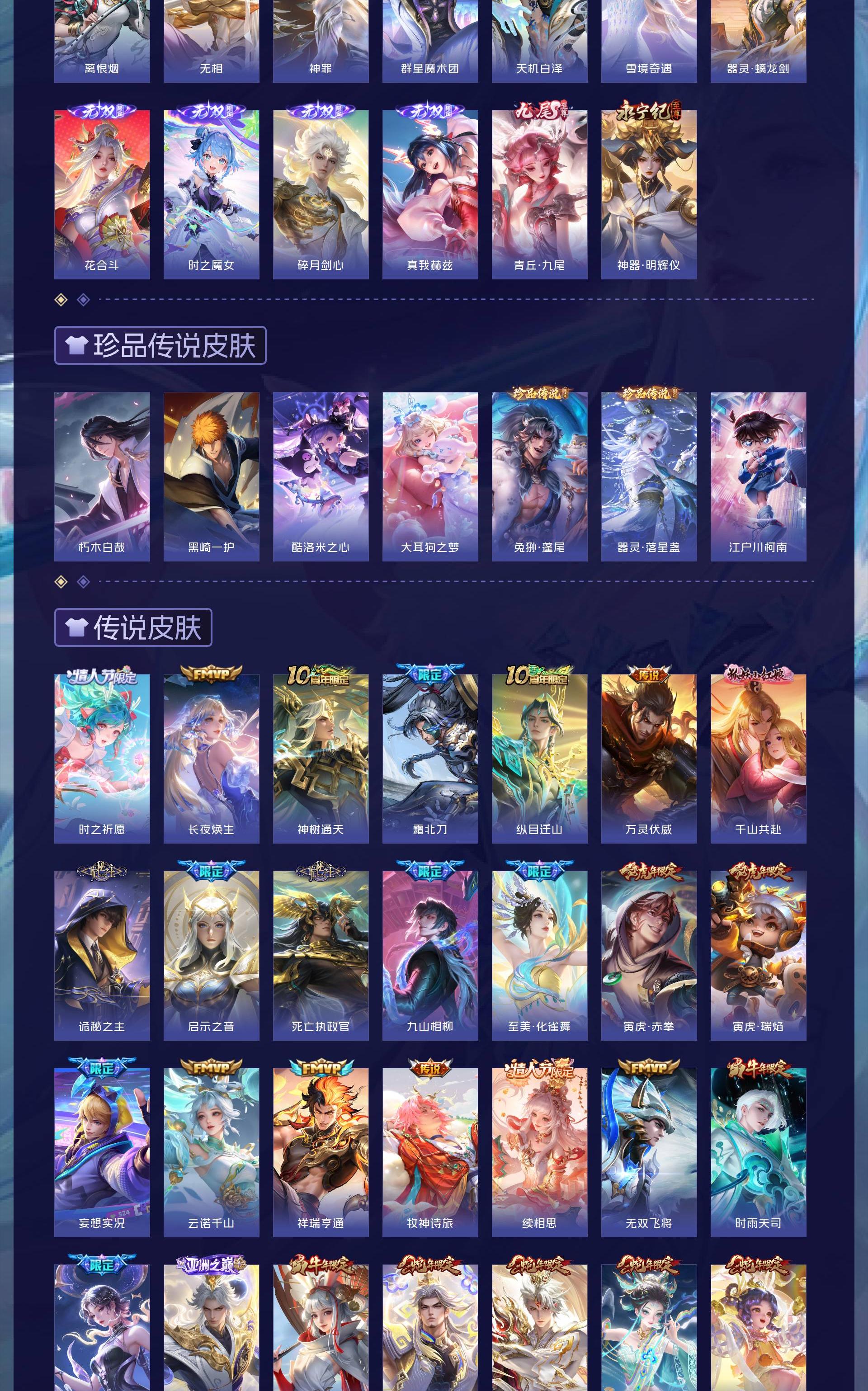 荣耀贵族 皮肤708 英雄129 荣耀王者 荣耀典藏20 珍品无双1 无双皮肤13 珍品传说7 星传说12 传说124 其他皮肤532