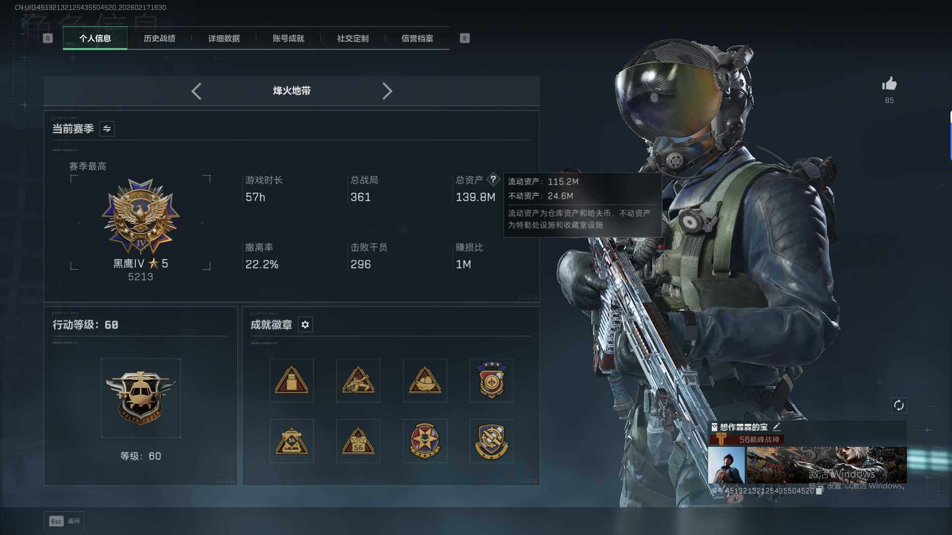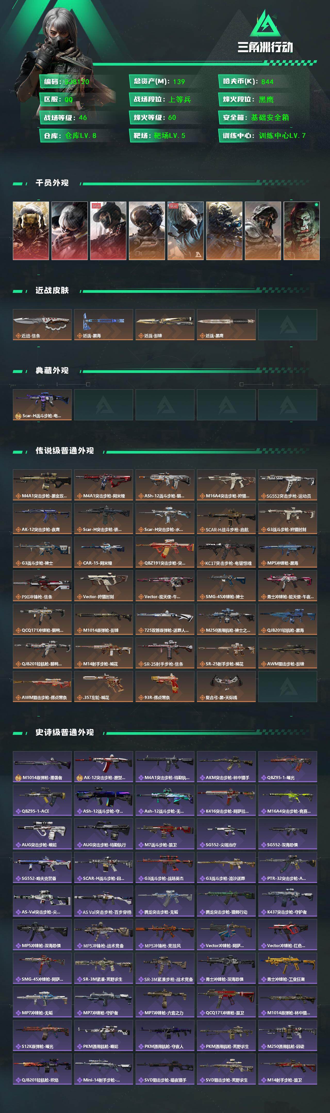 【SJ8120】总资产(M):139M/哈夫币(K):844K/哈夫币(K):844K/传说枪皮数:35/全面战场等级:46_段位:上等兵/烽火地带等级:60_段位:黑鹰/红狼-蚀金玫瑰/骇爪-水墨云图/露娜-黑·天际线/威龙-壮志凌云/蜂医-送葬人·无题密令/无名-夜鹰/深蓝-不破誓约/红狼-电锯惊魂/近战-信条/近战-黑海/近战-影锋/近战-黑鹰/SCAR-H战斗步枪-电玩高手/SCAR-H战斗步枪-电玩高手(优品S)/M4A1突击步枪-蚀金玫瑰/M4A1突击步枪-阿米娅/ASh-12战斗步