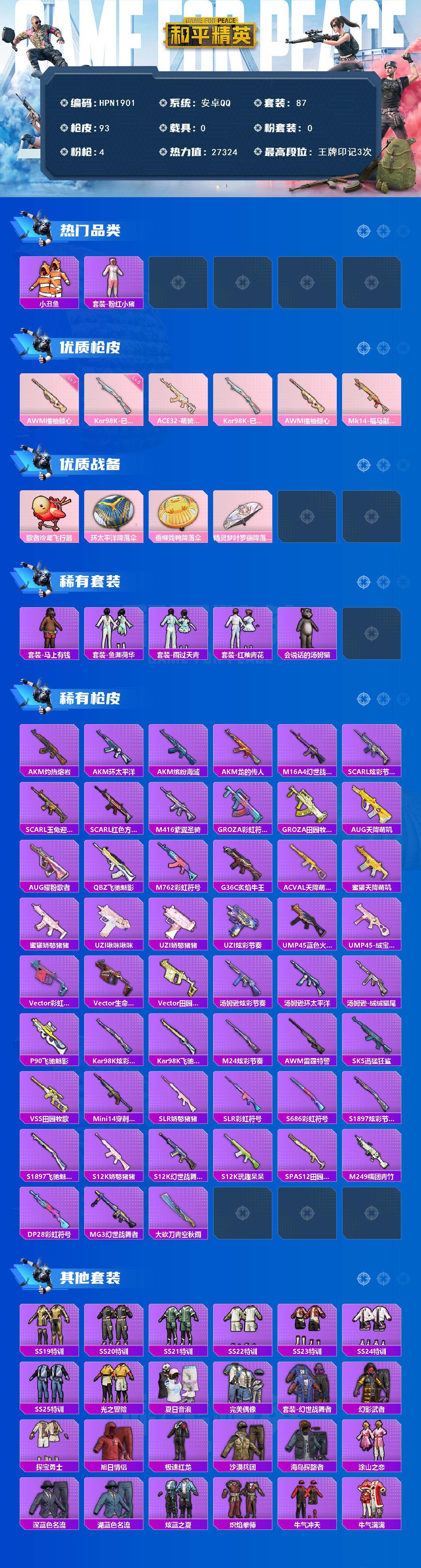 【HPN1901】87套装/枪械4/装备89/战备62/王牌印记3/热力值27324/五级Kar98K-巳巳如意/七级AWM-橘柚倾心/小丑鱼/套装-粉红小猪/ACE32-萌骑漫游/Kar98K-巳巳如意/AWM-橘柚倾心/Mk14-福马献瑞/歌者泠鸢飞行器/环太平洋降落伞/垂柳戏鸭降落伞/精灵梦叶罗丽降落伞/套装-马上有钱/套装-鱼渊荷华/套装-雨过天青/套装-红釉青花/玩偶服-会说话的汤姆猫/AKM-灼热熔岩/AKM-环太平洋/AKM-缤纷海域/AKM-龙的传人/M16A4-幻世战舞者/SC