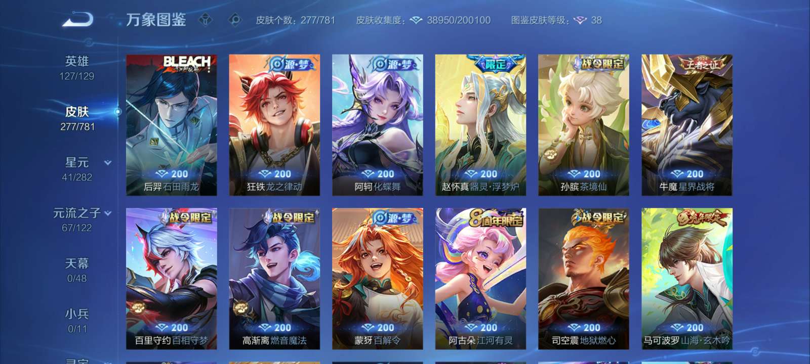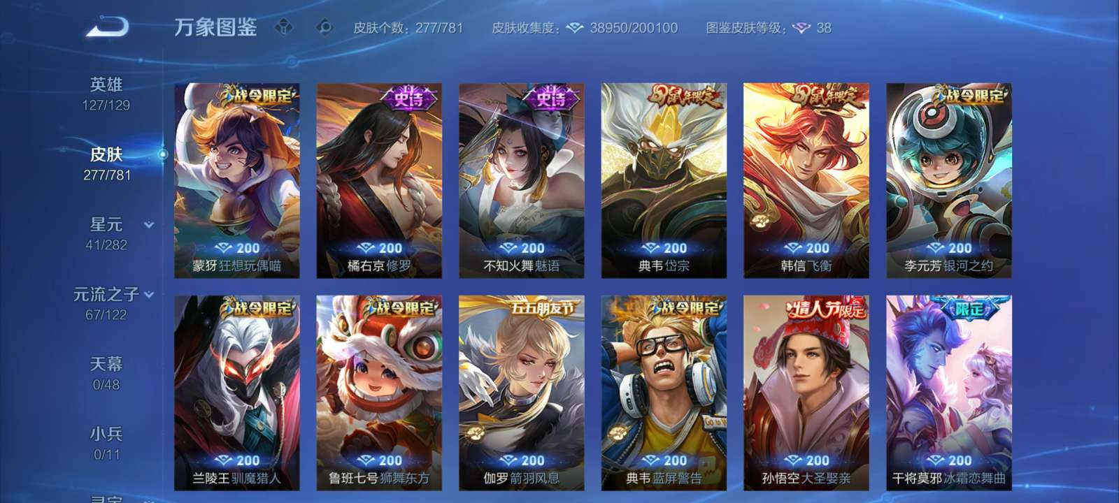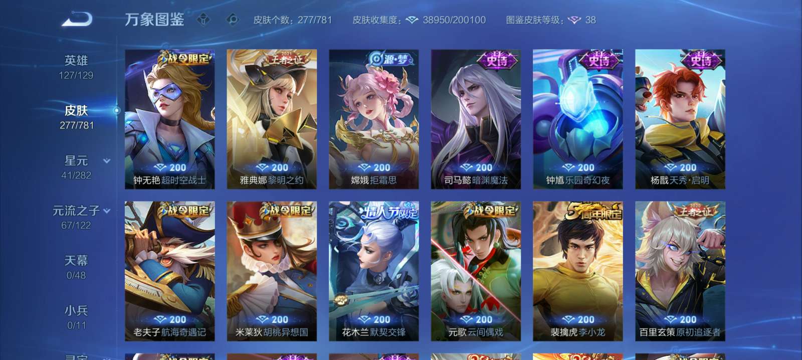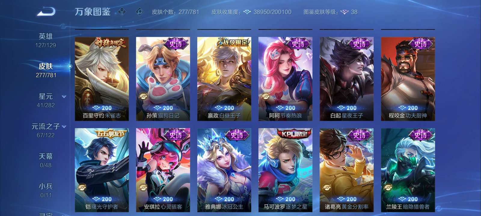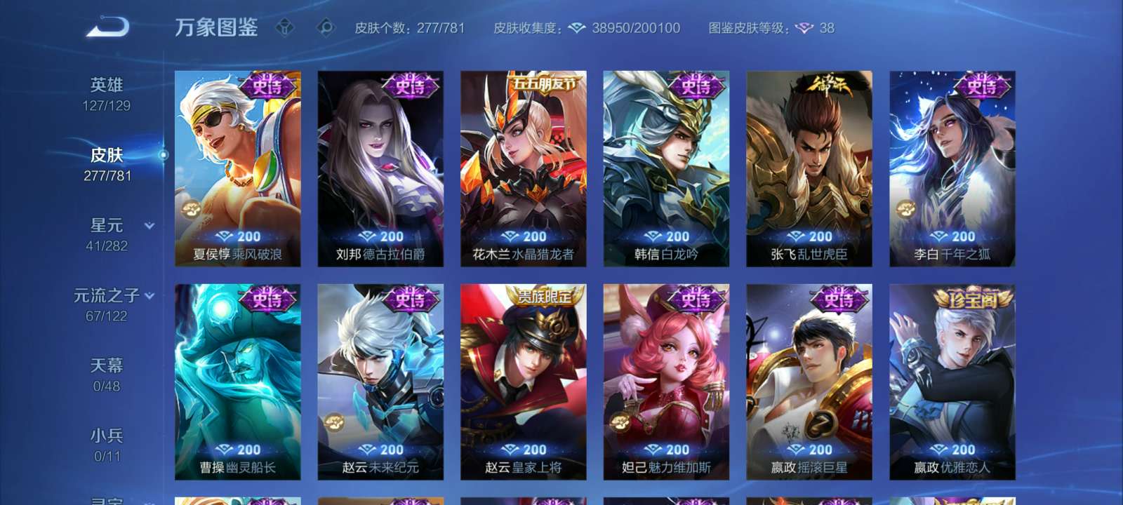 V7 皮肤277 英雄127 至尊星耀 荣耀典藏1 星传说2 传说15 其他皮肤265