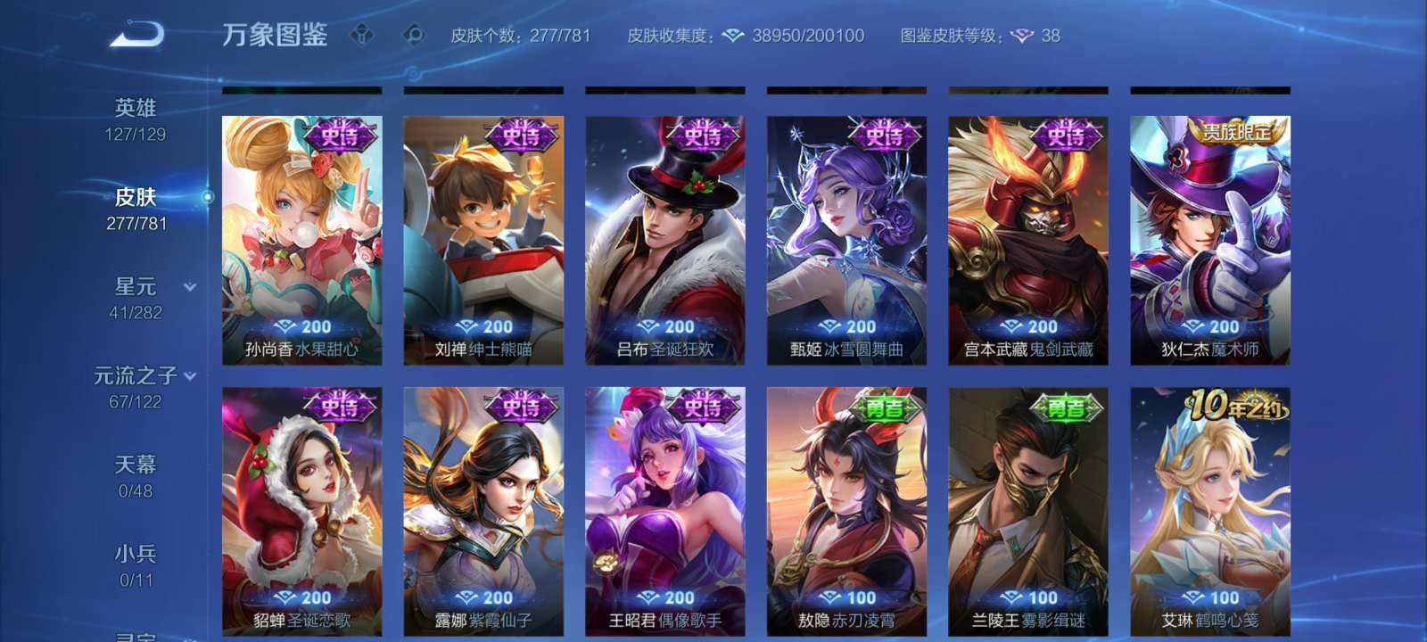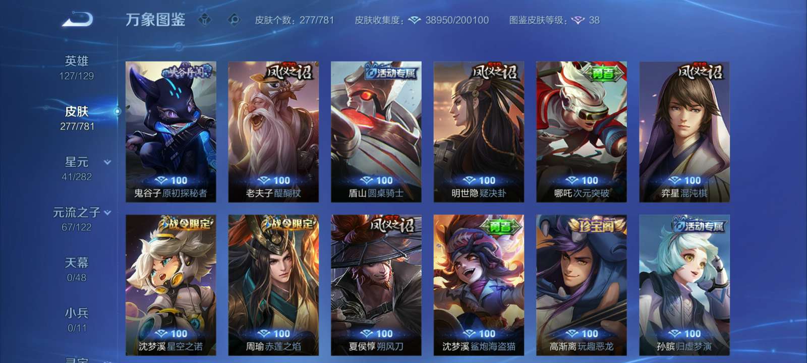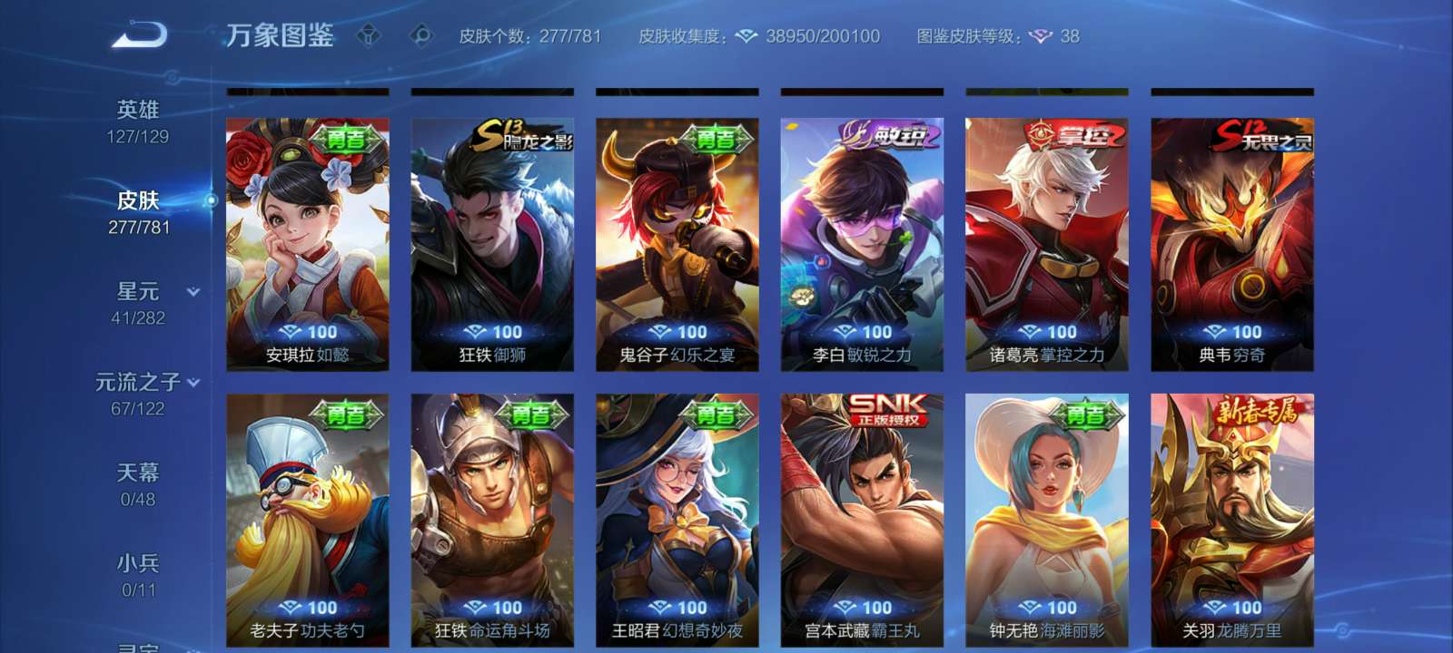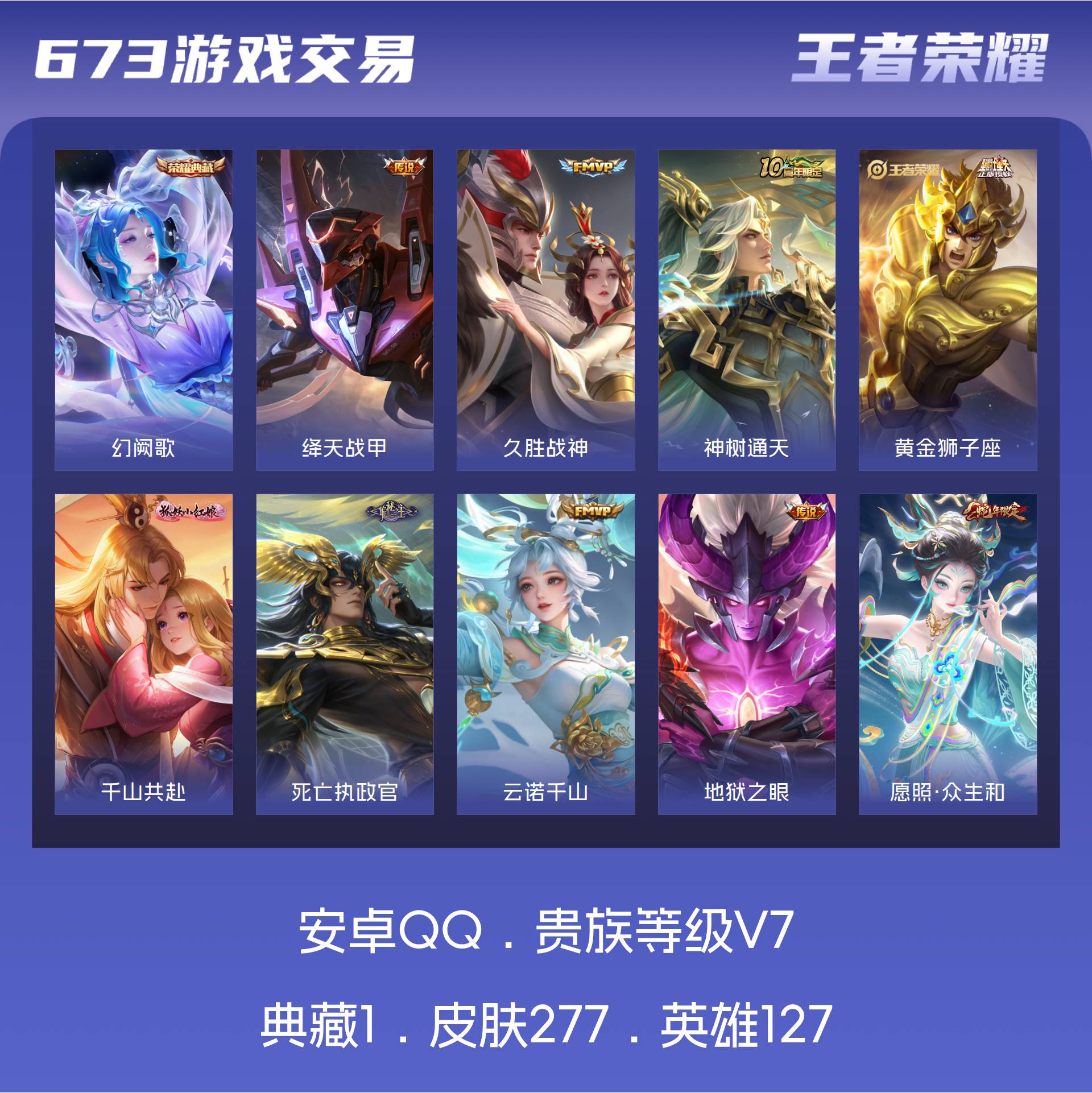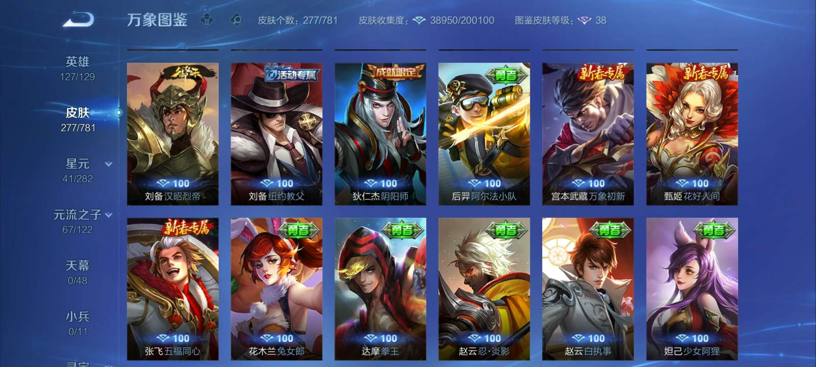 V7 皮肤277 英雄127 至尊星耀 荣耀典藏1 星传说2 传说15 其他皮肤265