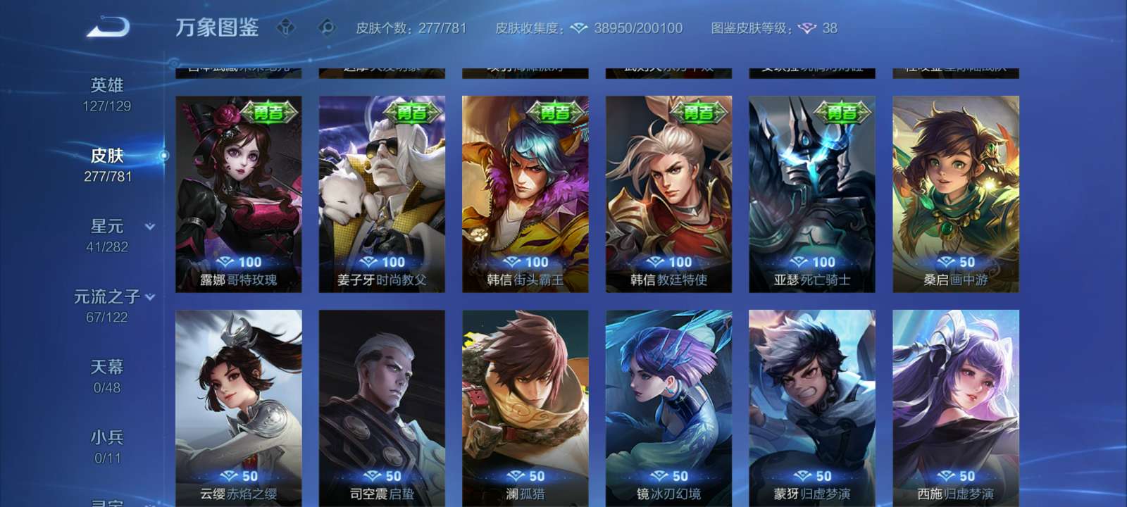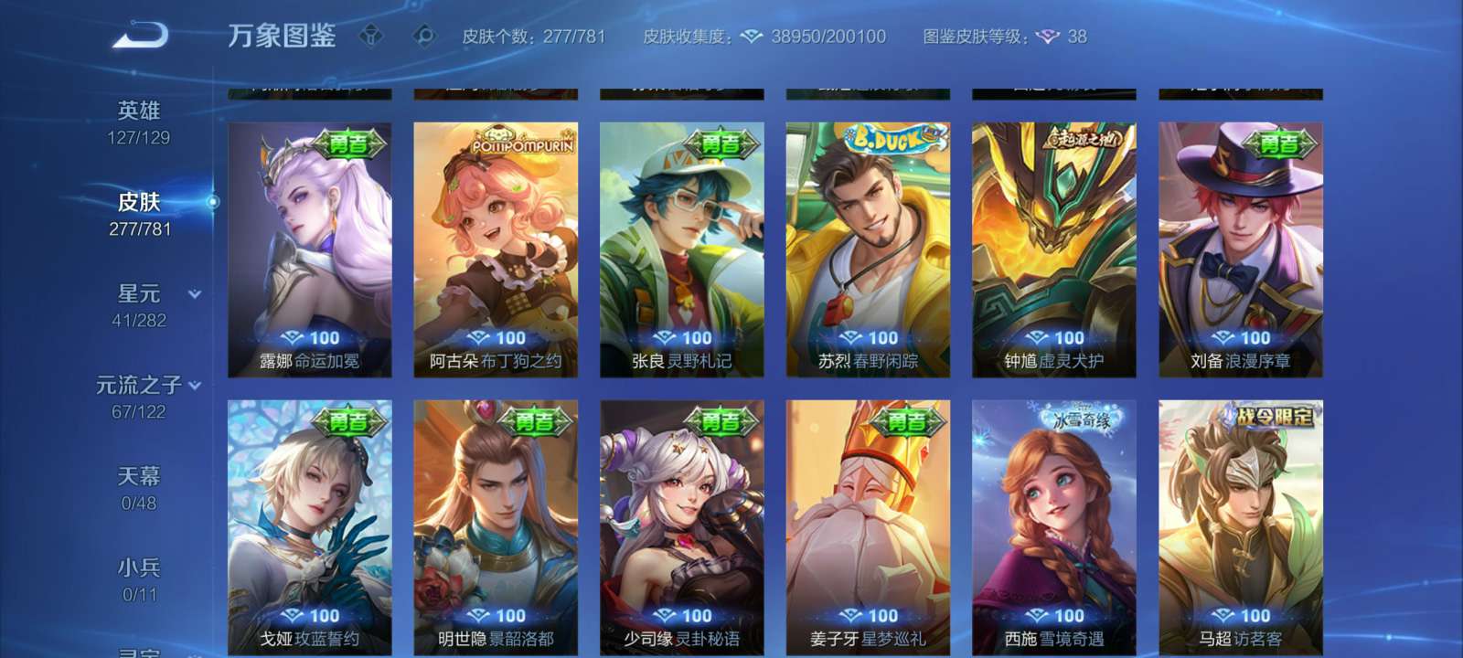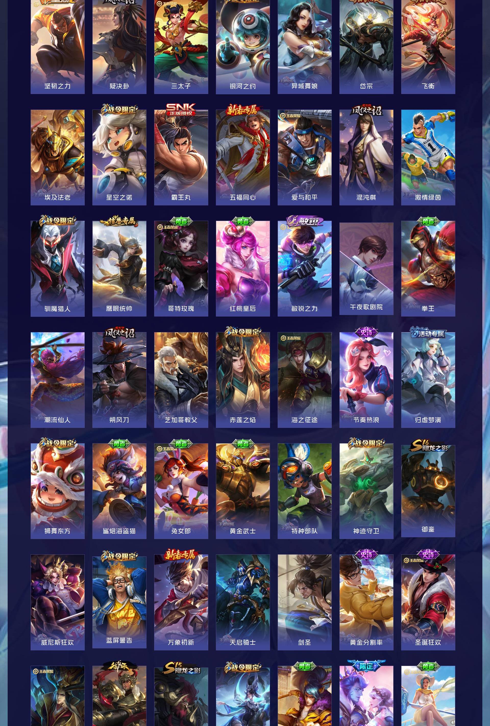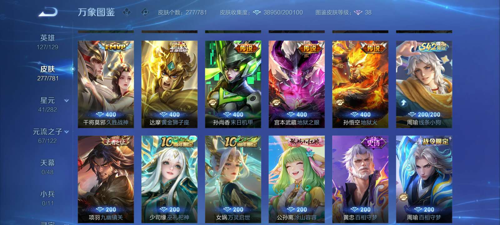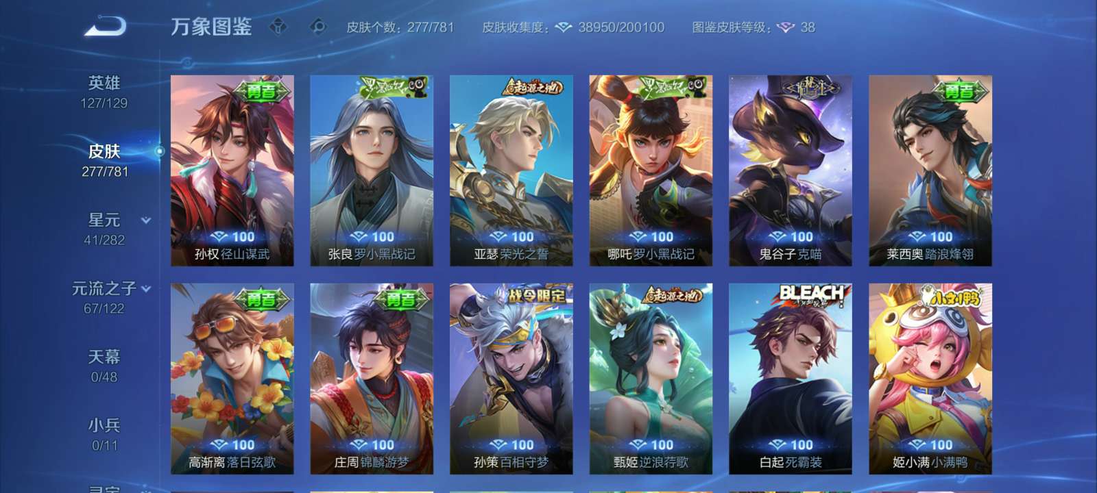V7 皮肤277 英雄127 至尊星耀 荣耀典藏1 星传说2 传说15 其他皮肤265