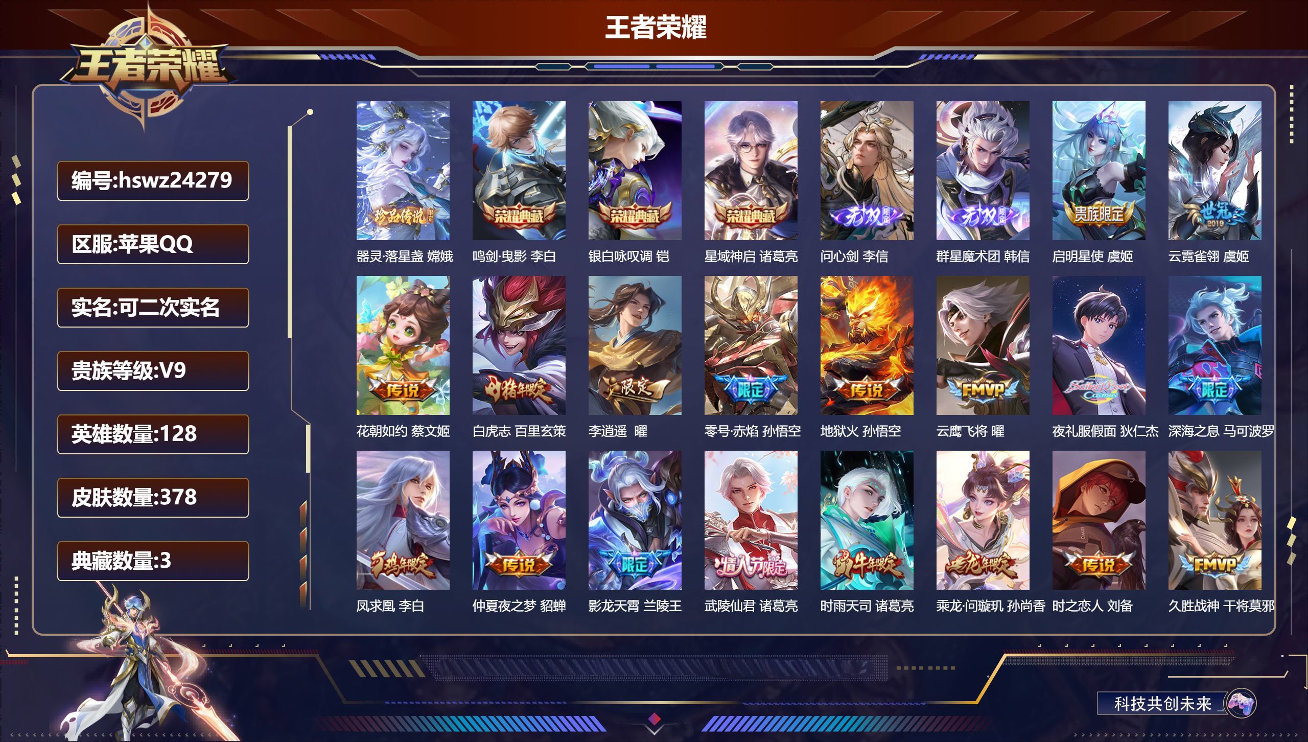 苹果QQ/荣耀黄金/378皮肤/128英雄/3典藏/0珍品无双/2无双/1珍品传说/29传说/112