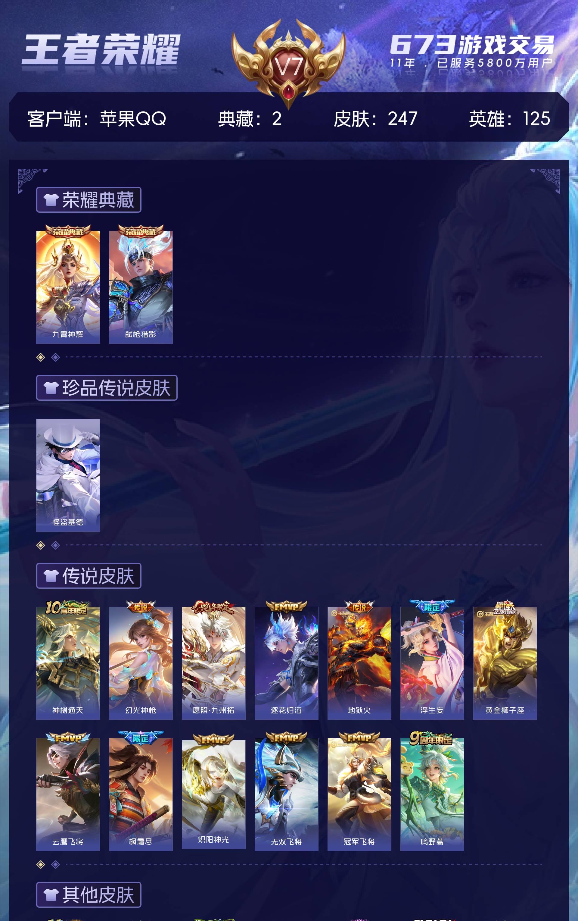 V7 皮肤247 英雄125 永恒钻石 荣耀典藏2 珍品传说1 传说13 其他皮肤237