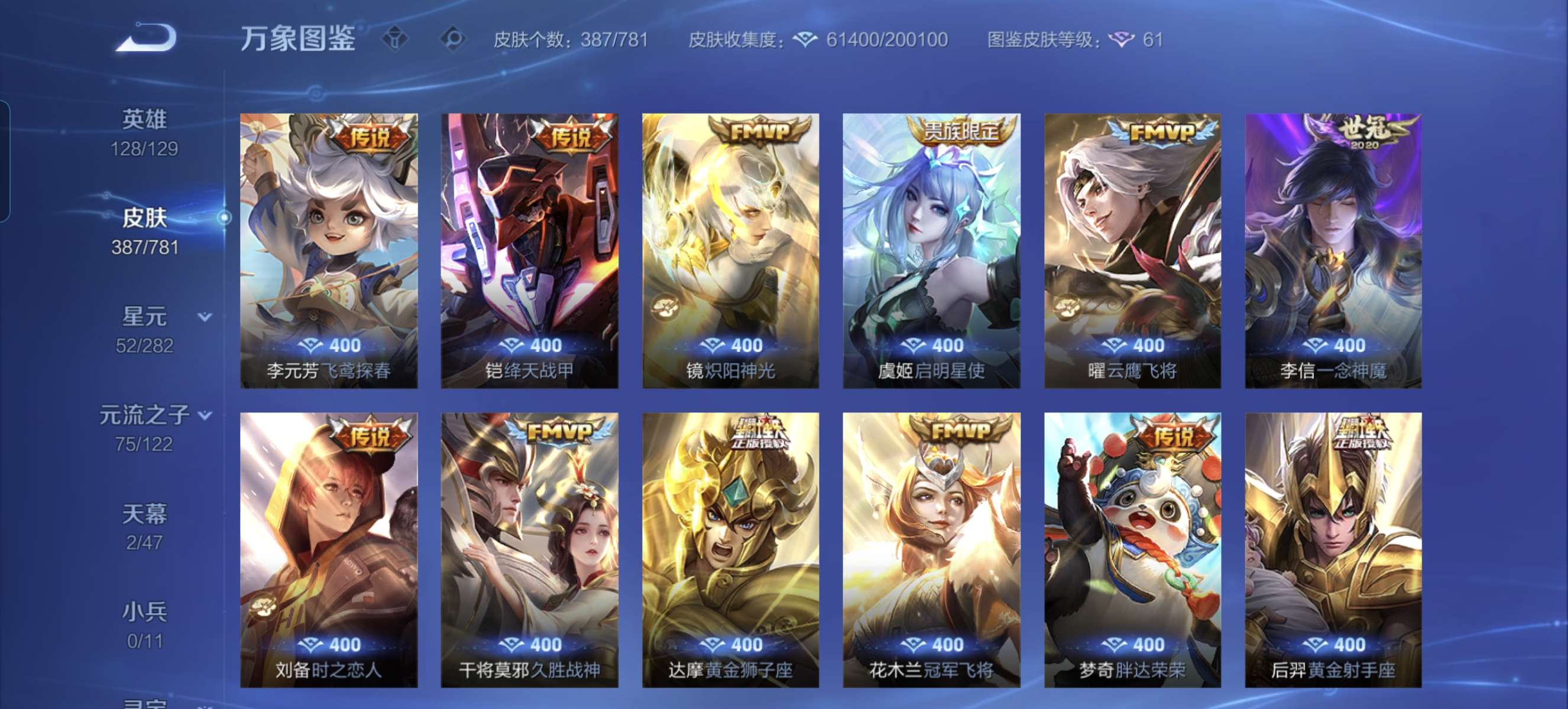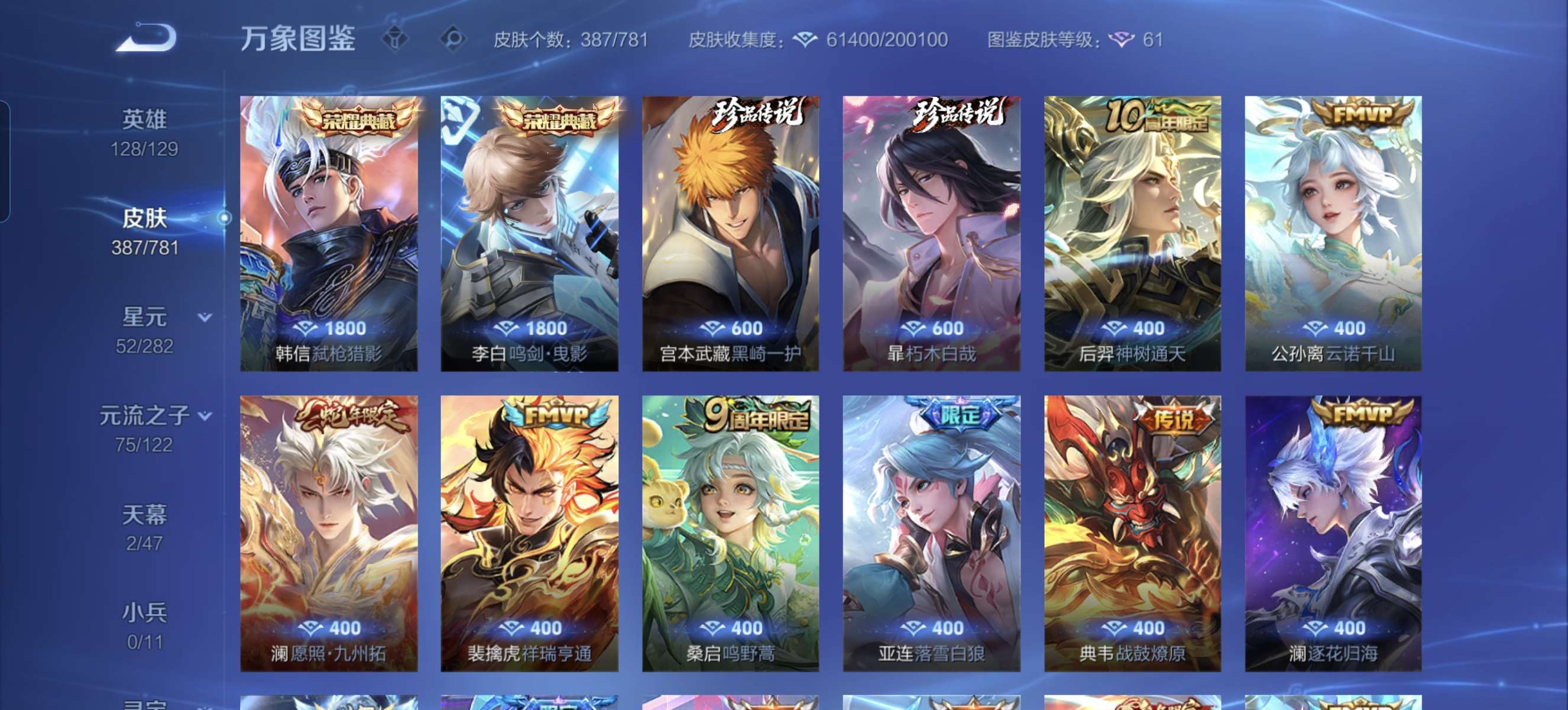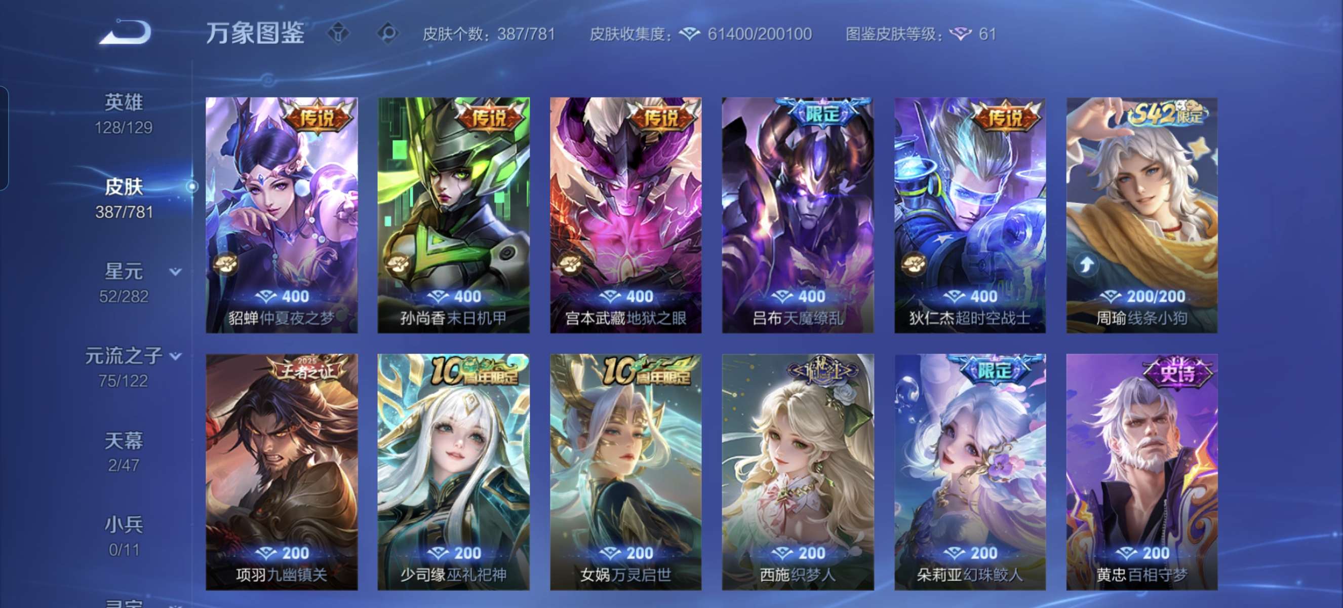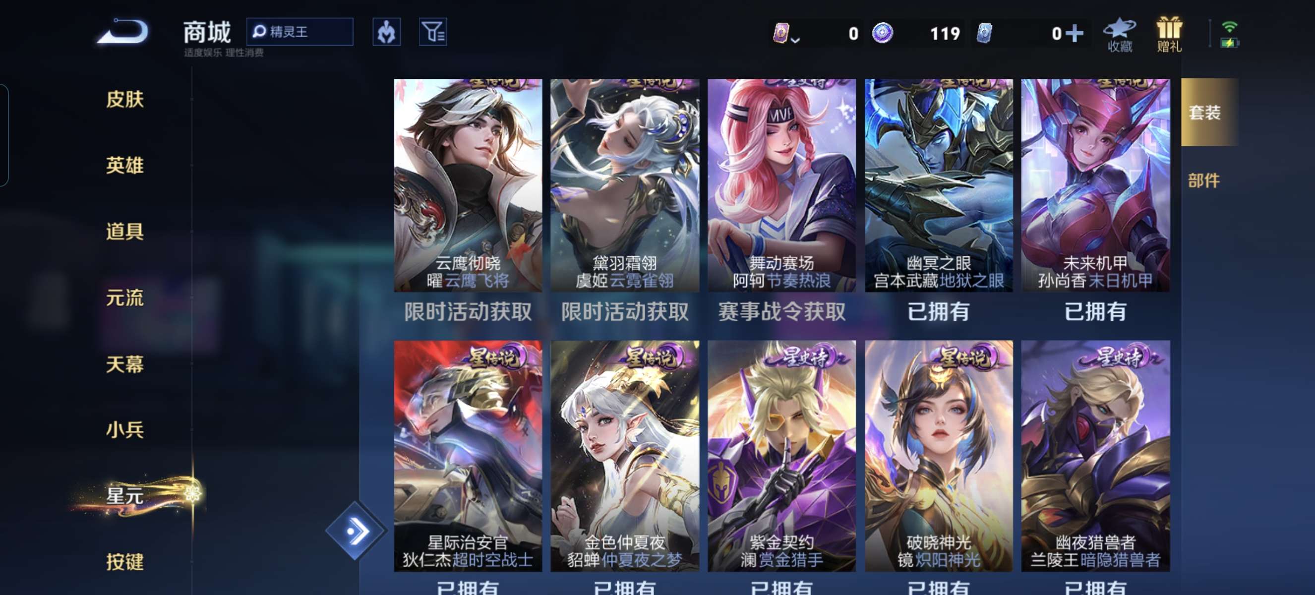 至尊宝蓝全皮肤还有一些零零散散星元皮该有的都有一些玩的挺舒服的