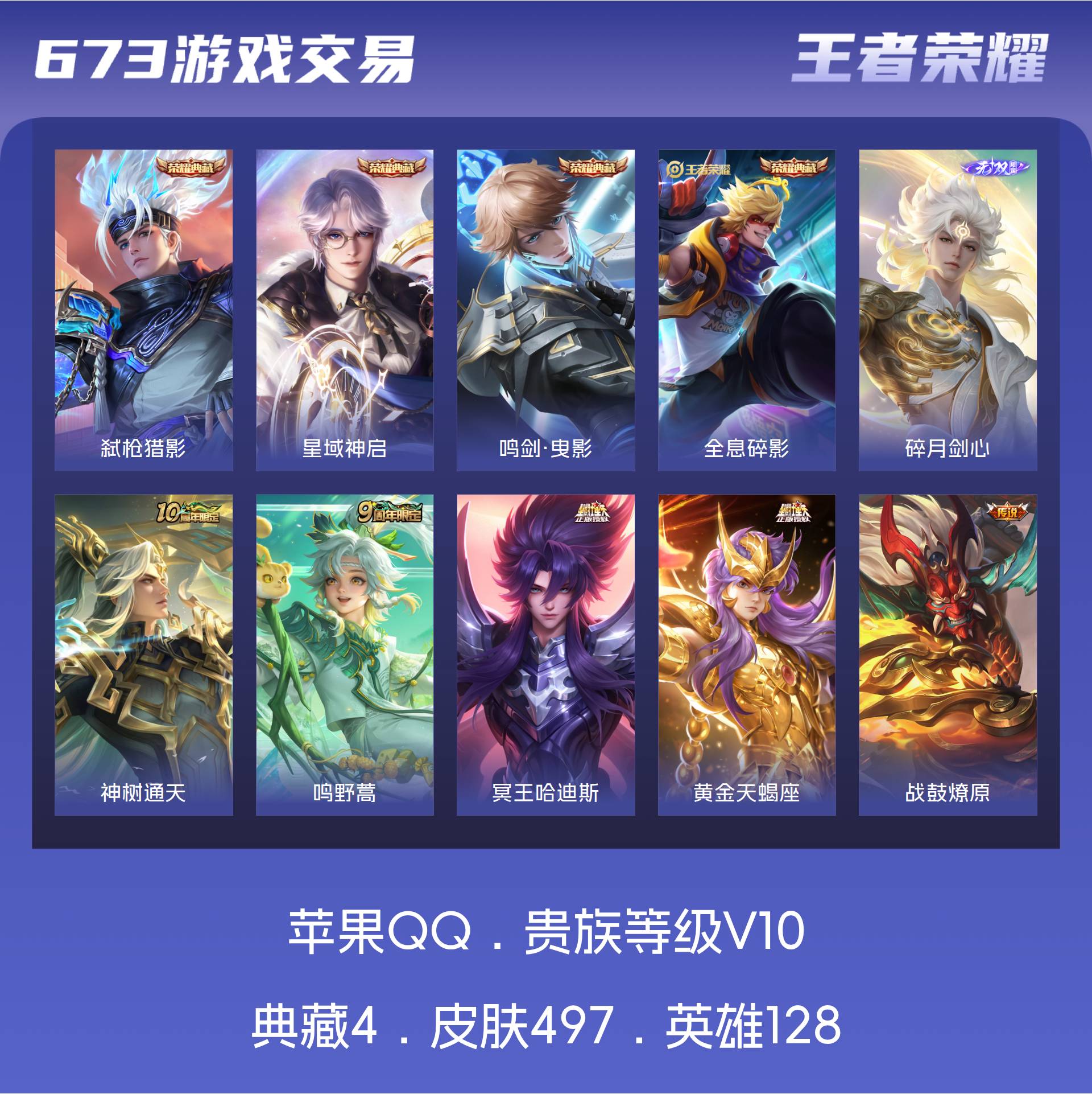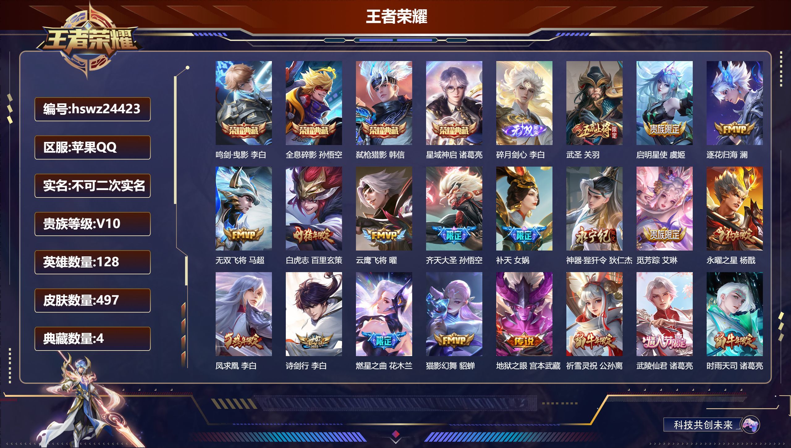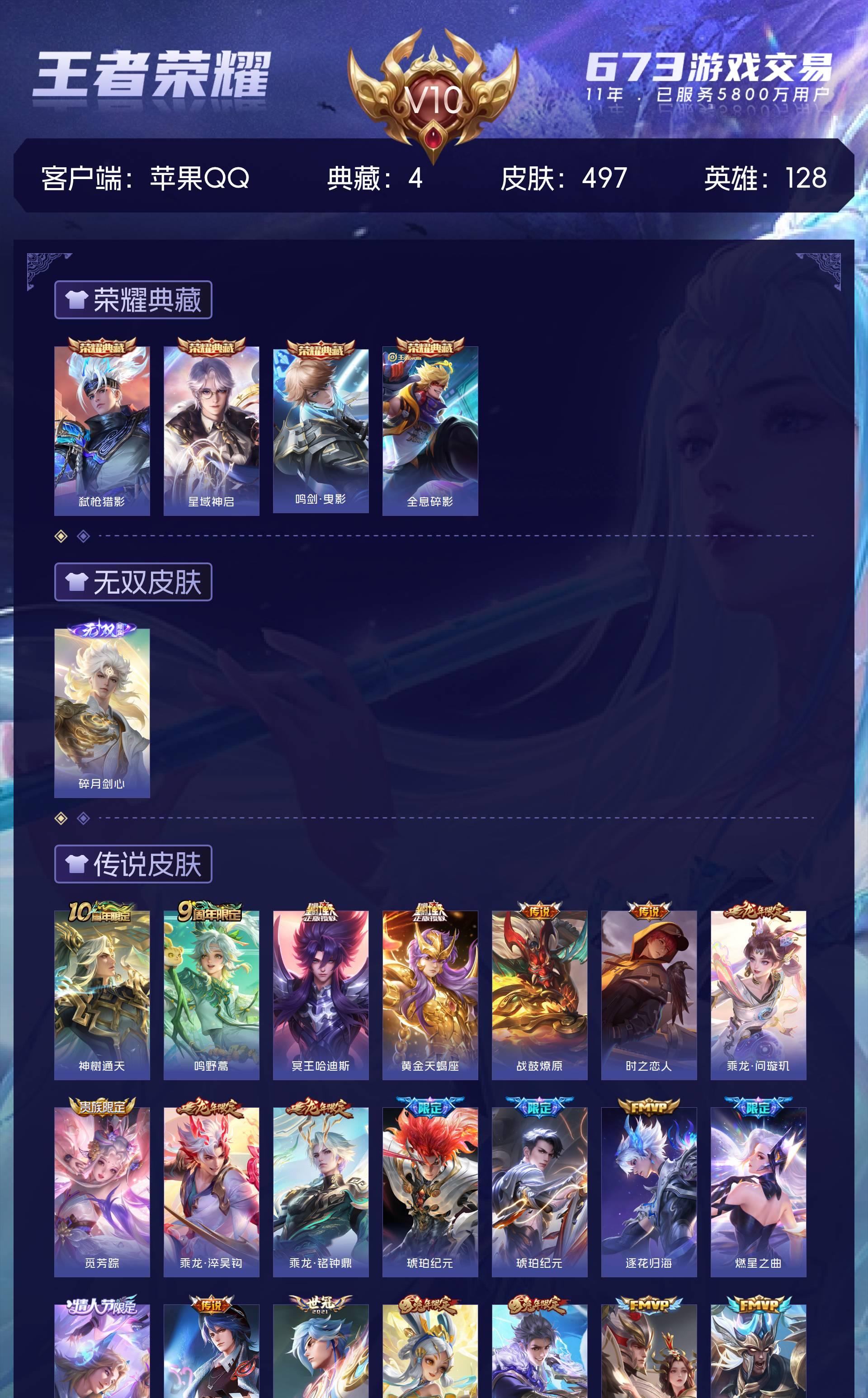 苹果QQ/最强王者/497皮肤/128英雄/4典藏/0珍品无双/1无双/0珍品传说/53传说/162