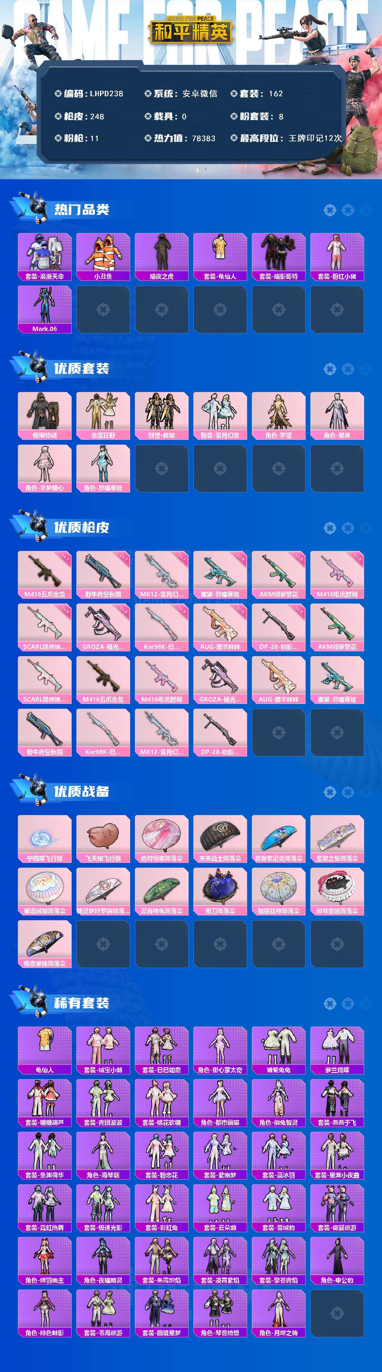【特价出售/店主推荐】安卓 微信-8粉装-11特效枪-0载具-3粉色飞行器-78383热力值-12王牌印记-162套装-248枪皮【热门品类】:套装-浪漫天命,套装-小丑鱼,套装-暗夜之虎,套装-龟仙人,套装-暗影哥特,套装-粉红小猪,角色-Mark.06【粉色套装】:粉装-极限特训,粉装-金属狂野,套装-创世·救赎,粉装-雪月幻音,角色-罗征,角色-星渊,角色-羊梦糖心,角色-异瞳寒姬【粉色枪