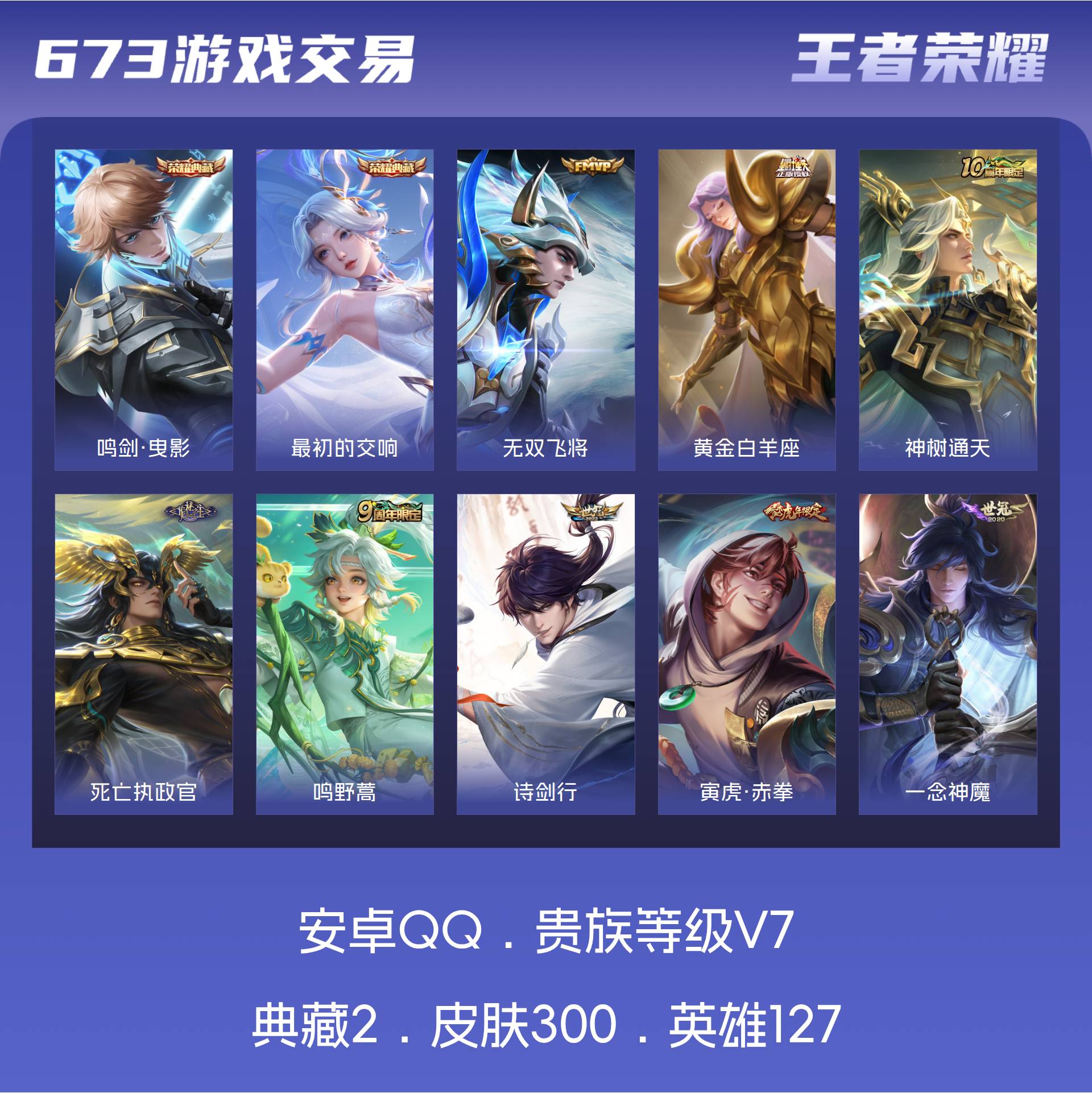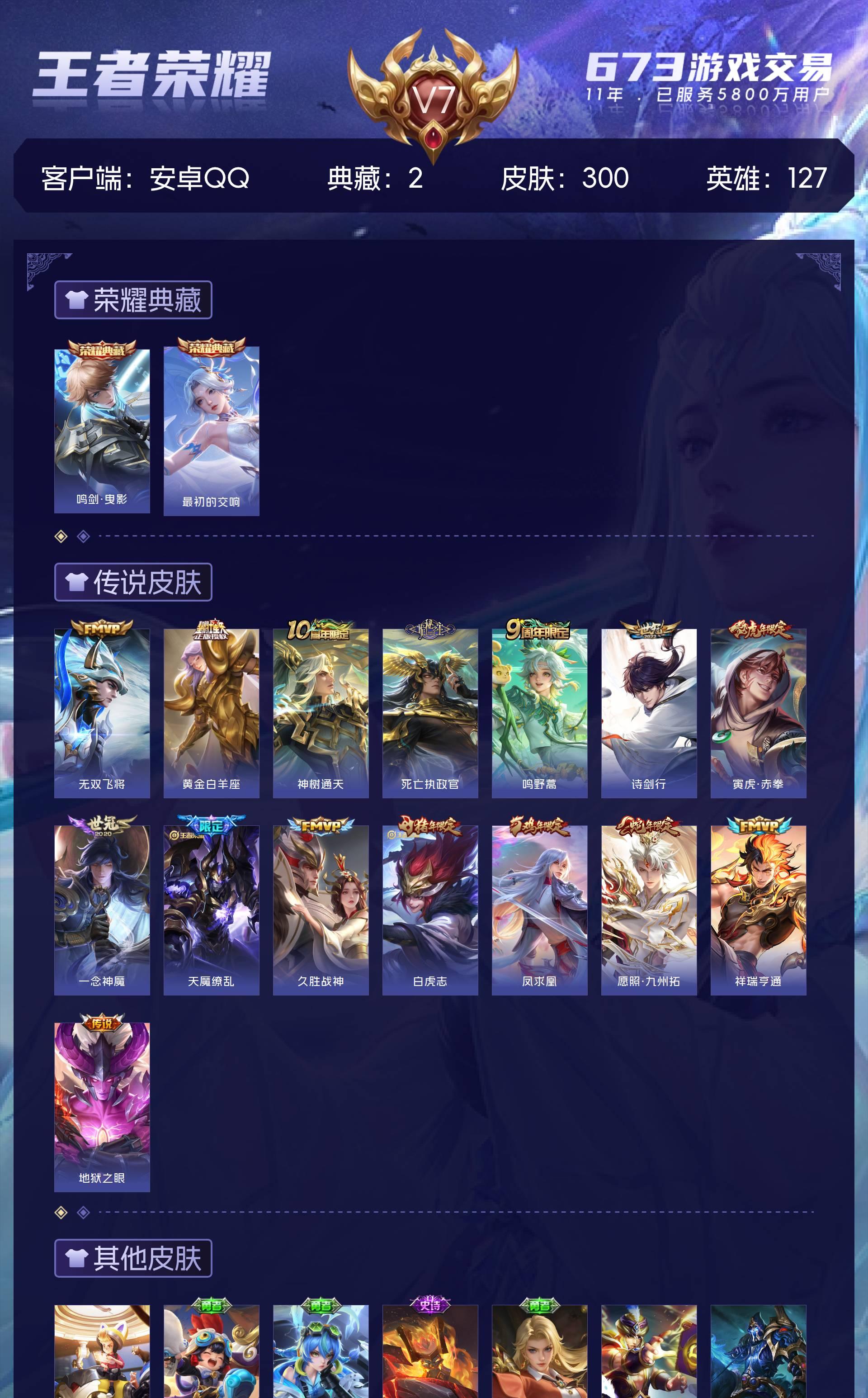 安卓QQ/无双王者/300皮肤/127英雄/2典藏/0珍品无双/0无双/0珍品传说/15传说/66史