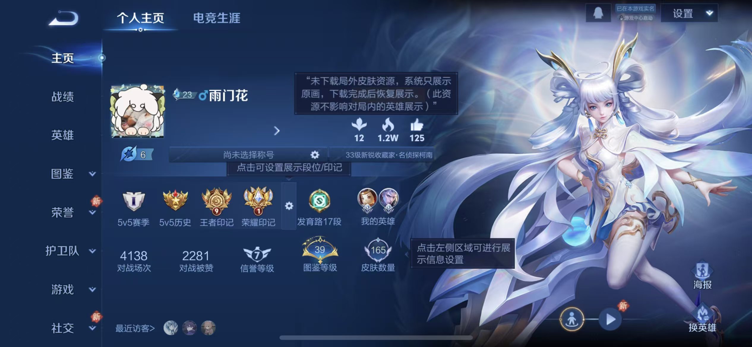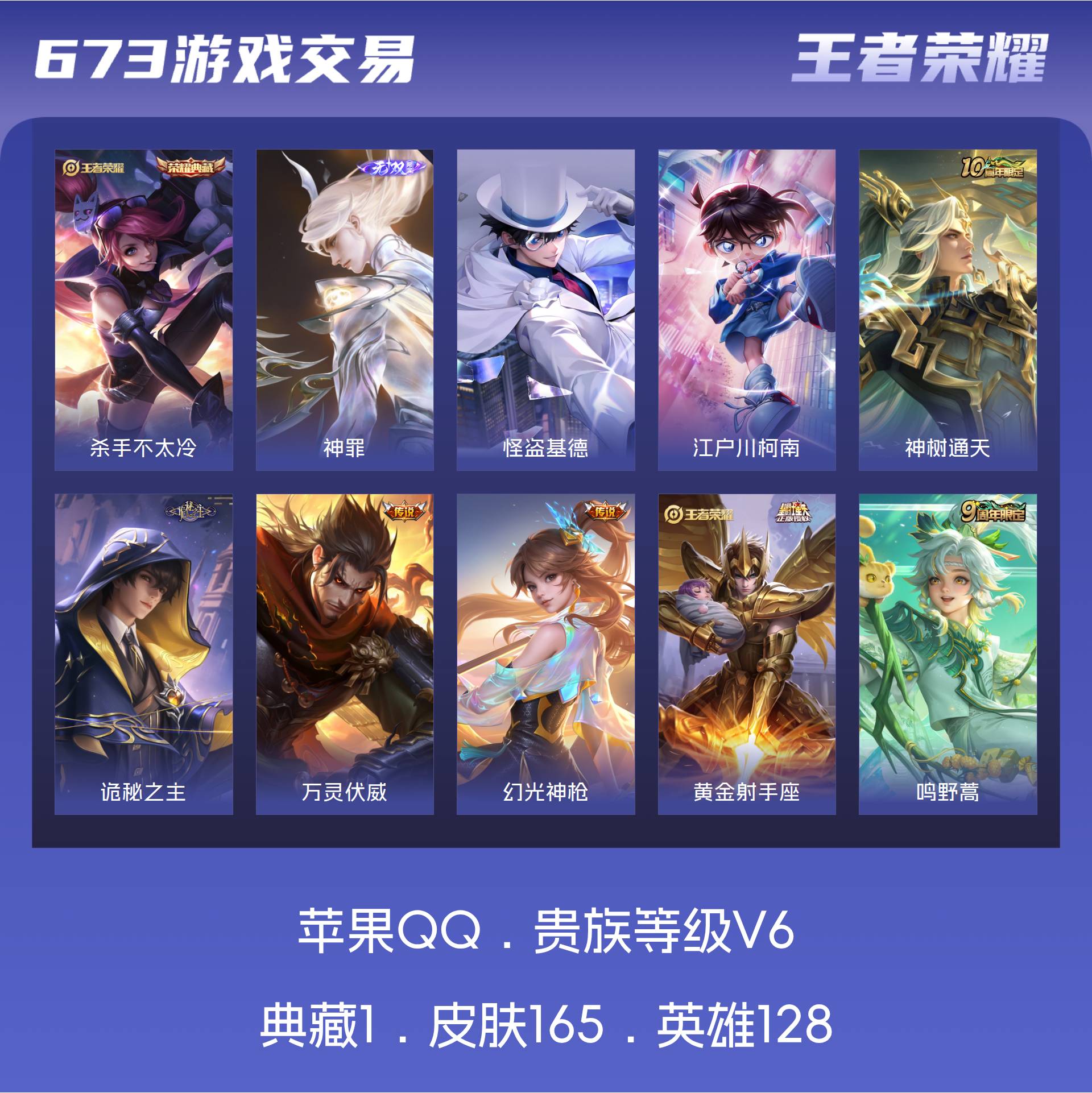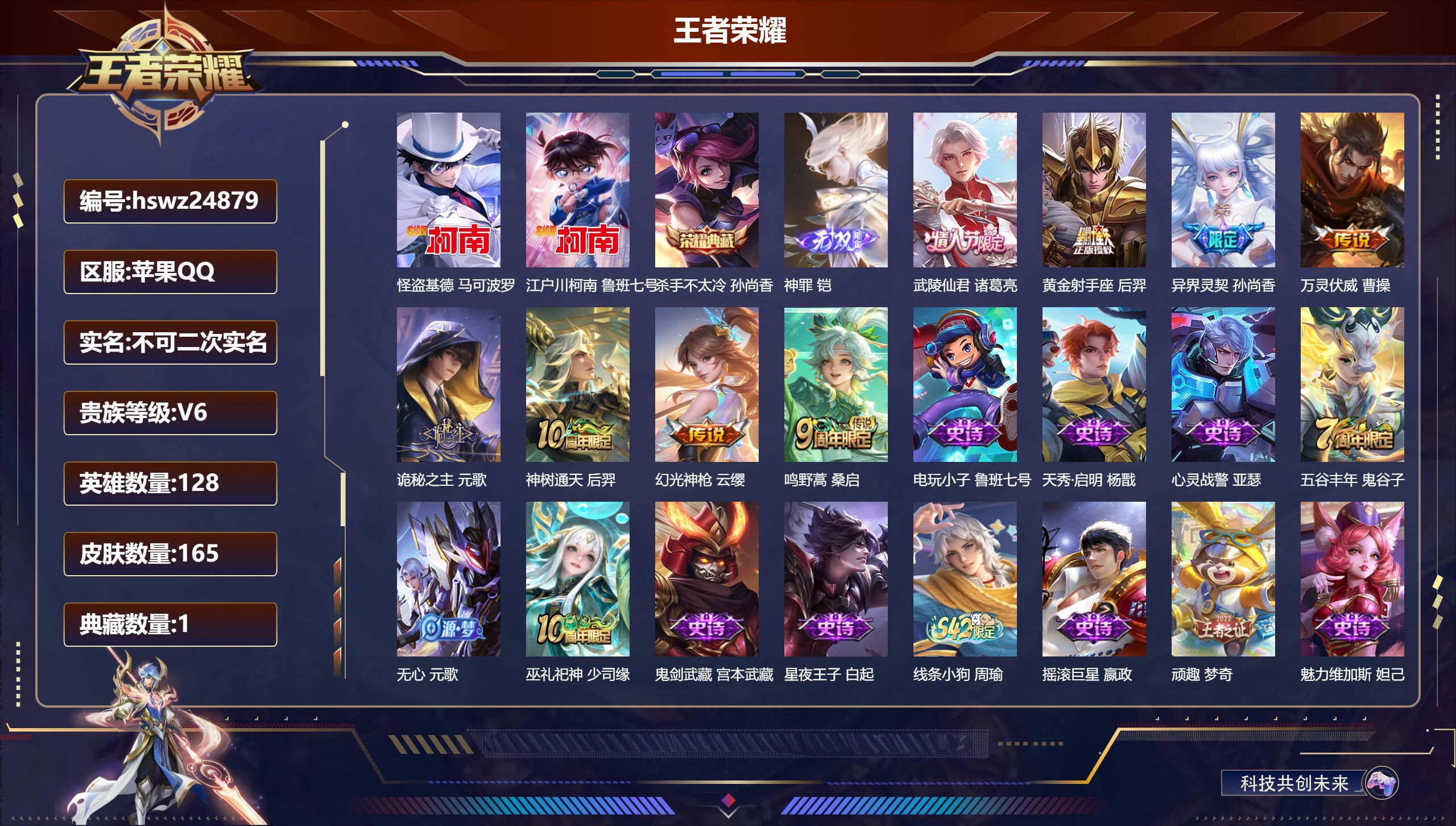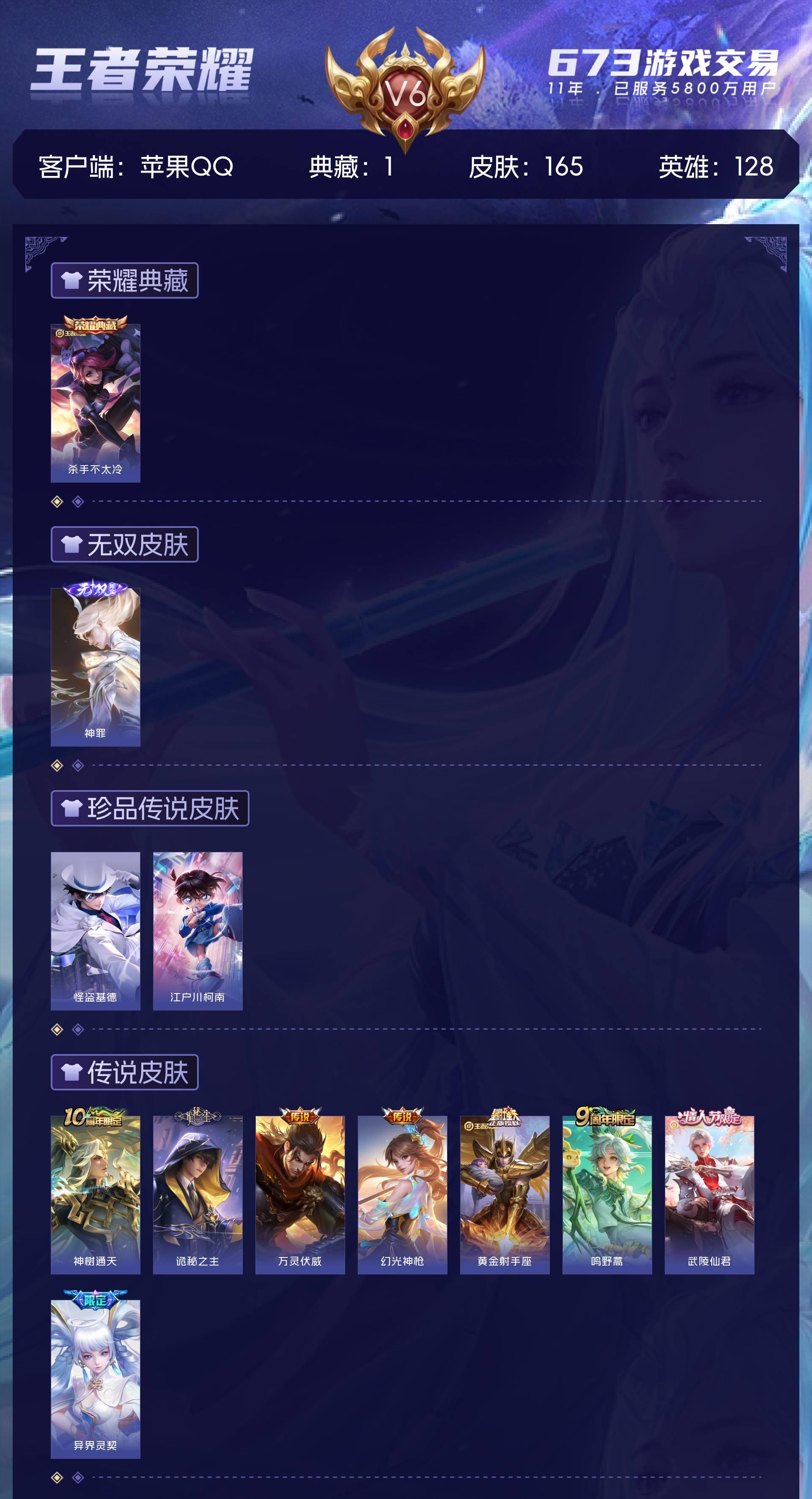 苹果QQ/永恒钻石/165皮肤/128英雄/1典藏/0珍品无双/1无双/2珍品传说/8传说/35史诗