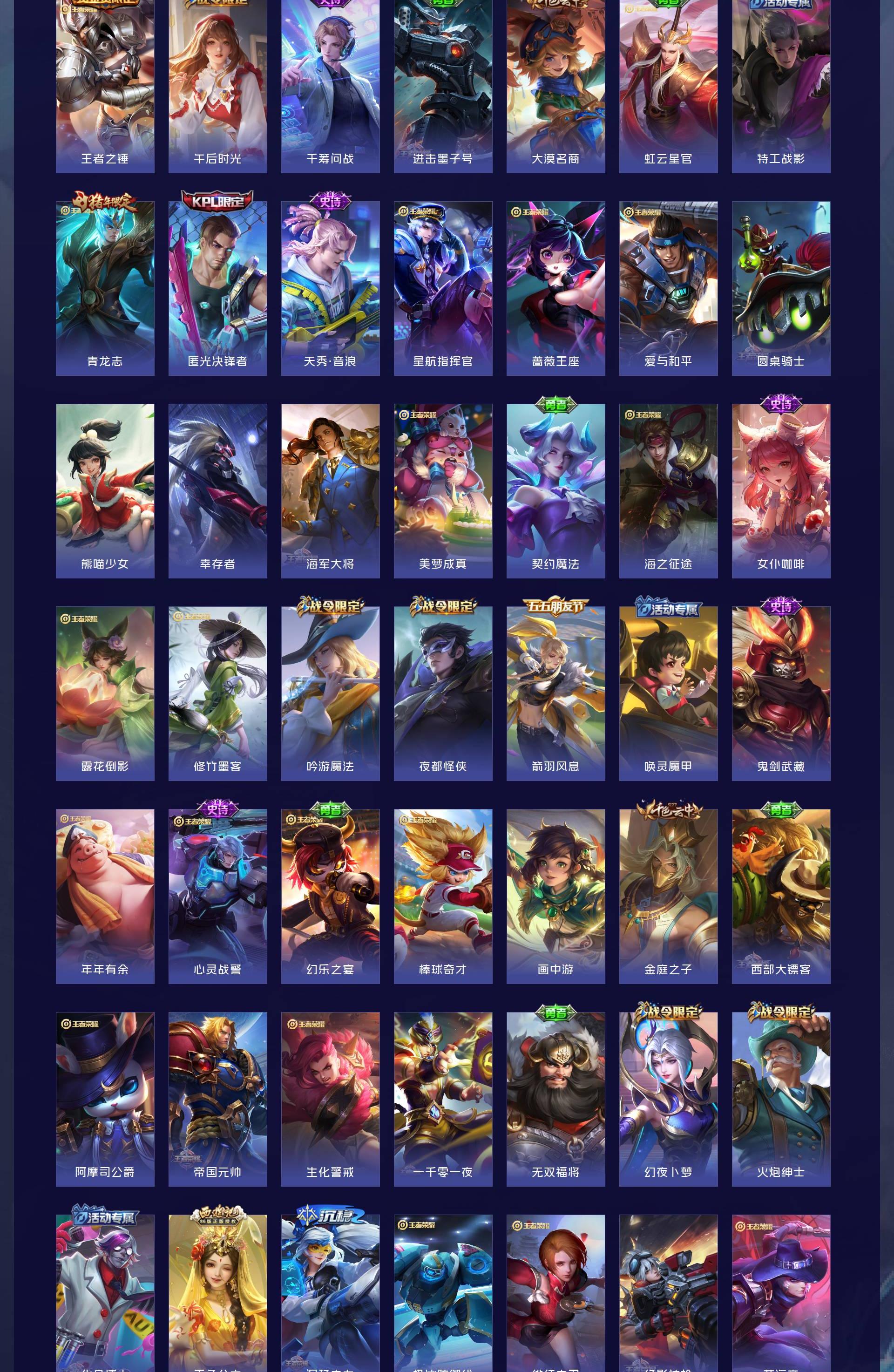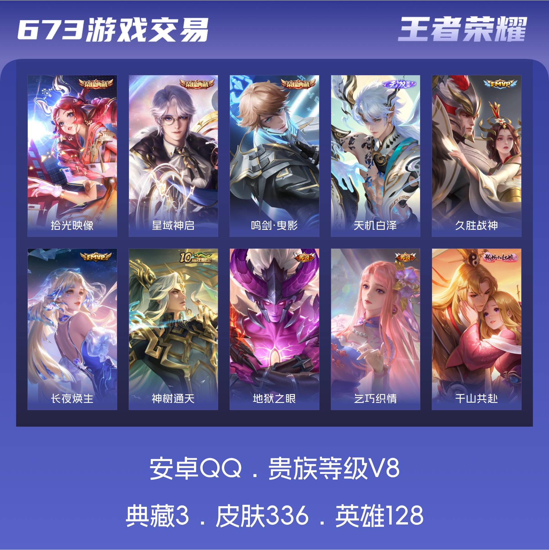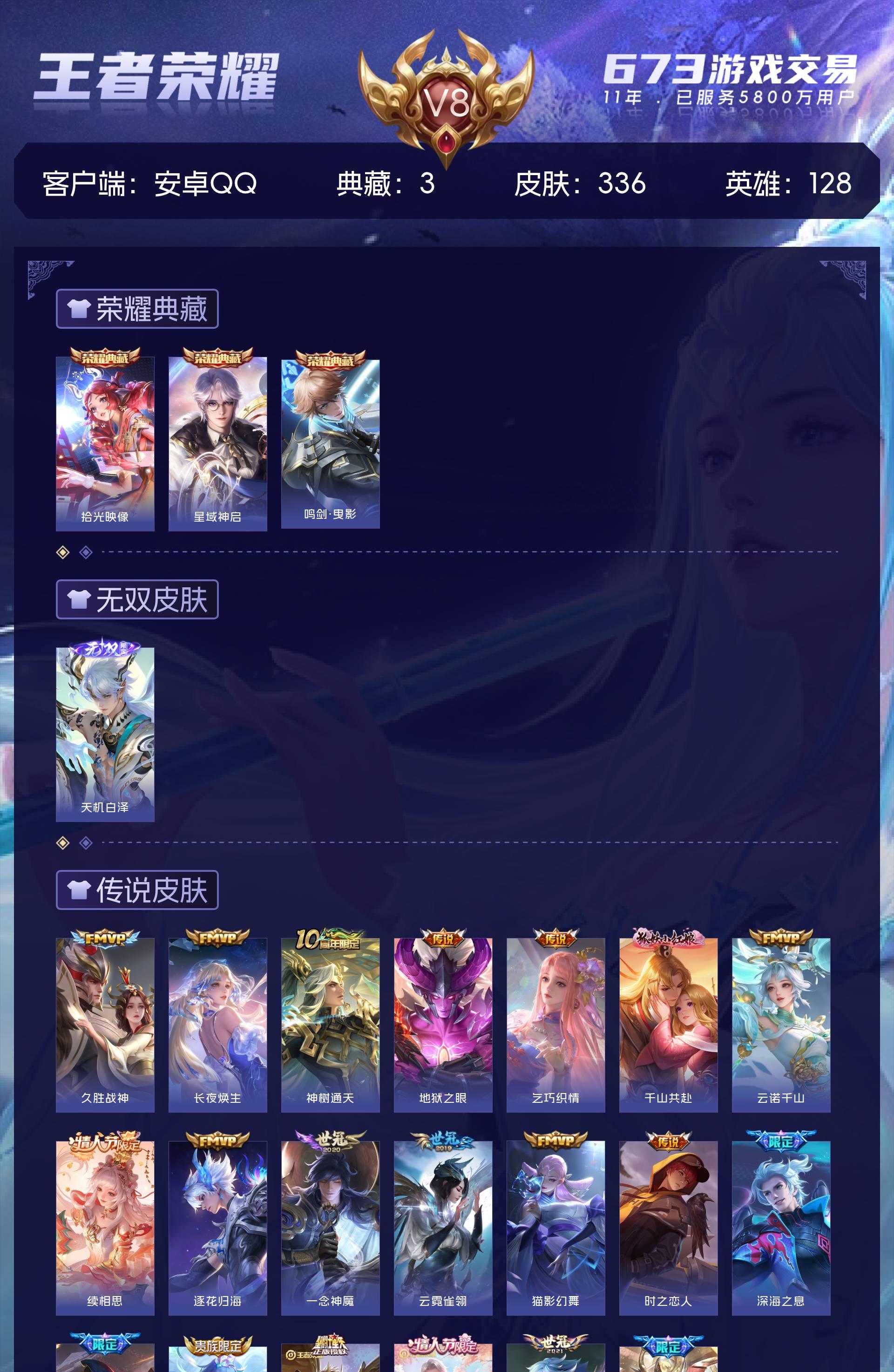 V8 皮肤336 英雄128 非凡王者 荣耀典藏3 无双皮肤1 传说20 其他皮肤314