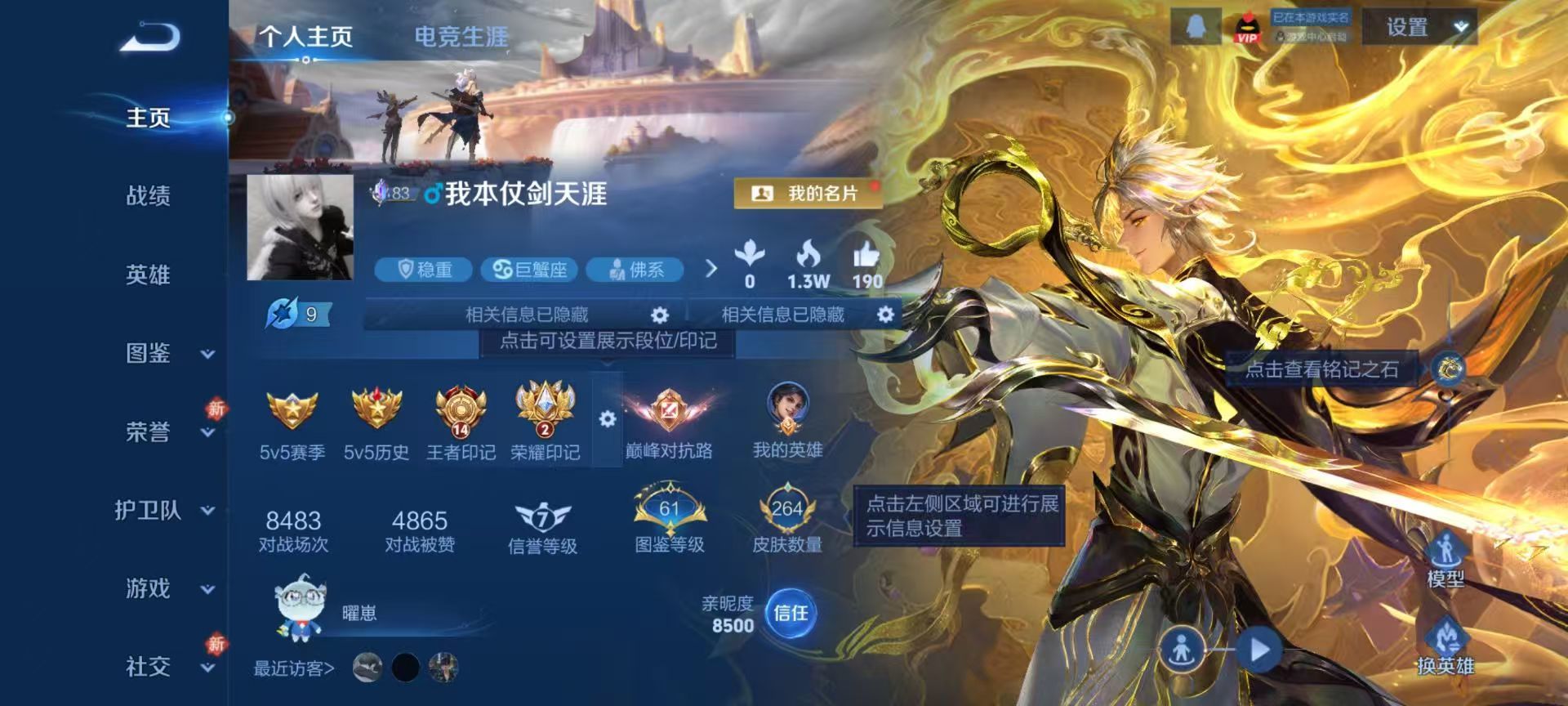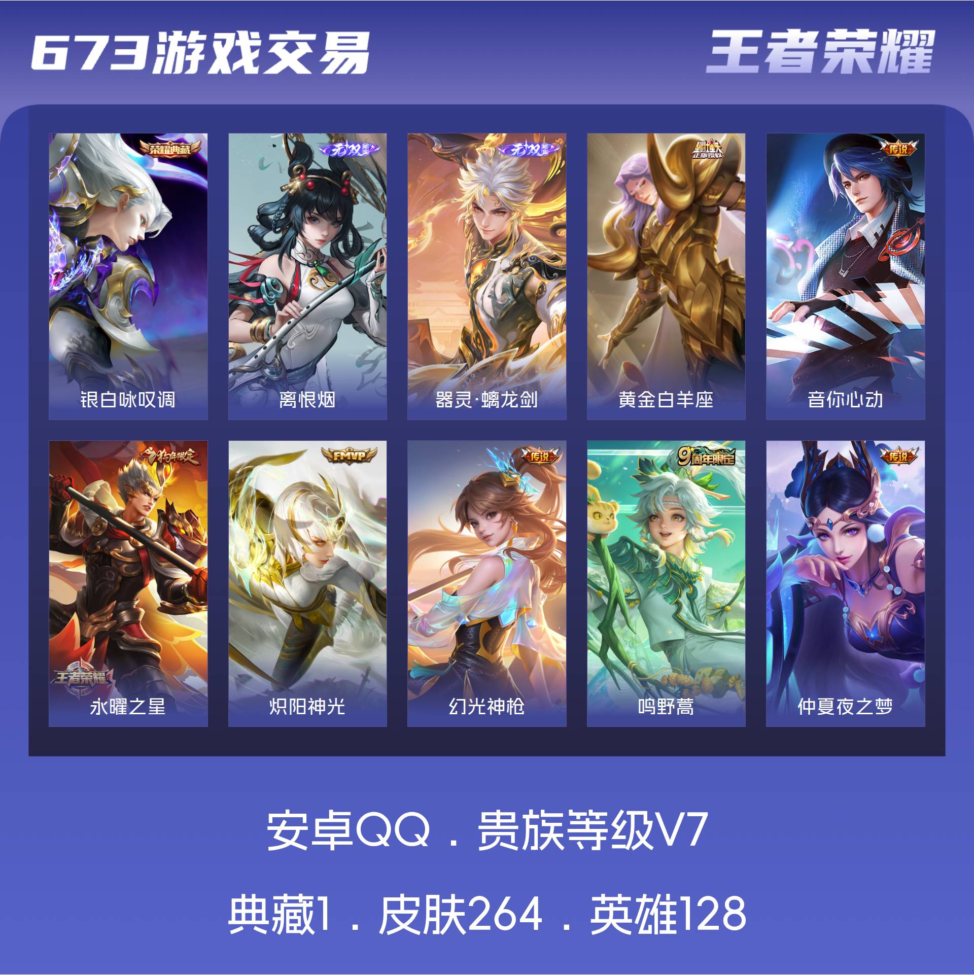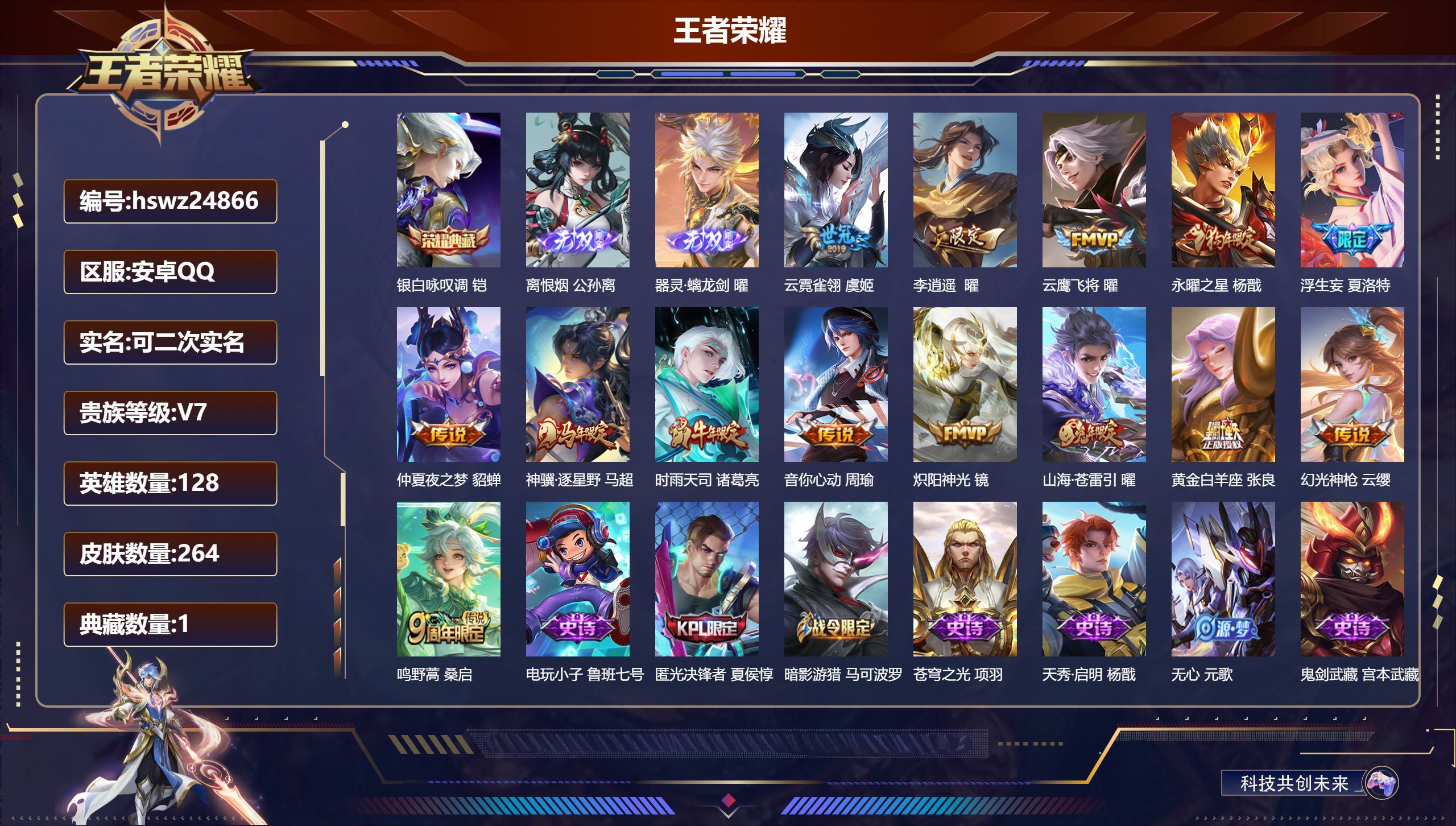 安卓QQ/最强王者/264皮肤/128英雄/1典藏/0珍品无双/2无双/0珍品传说/14传说/64史