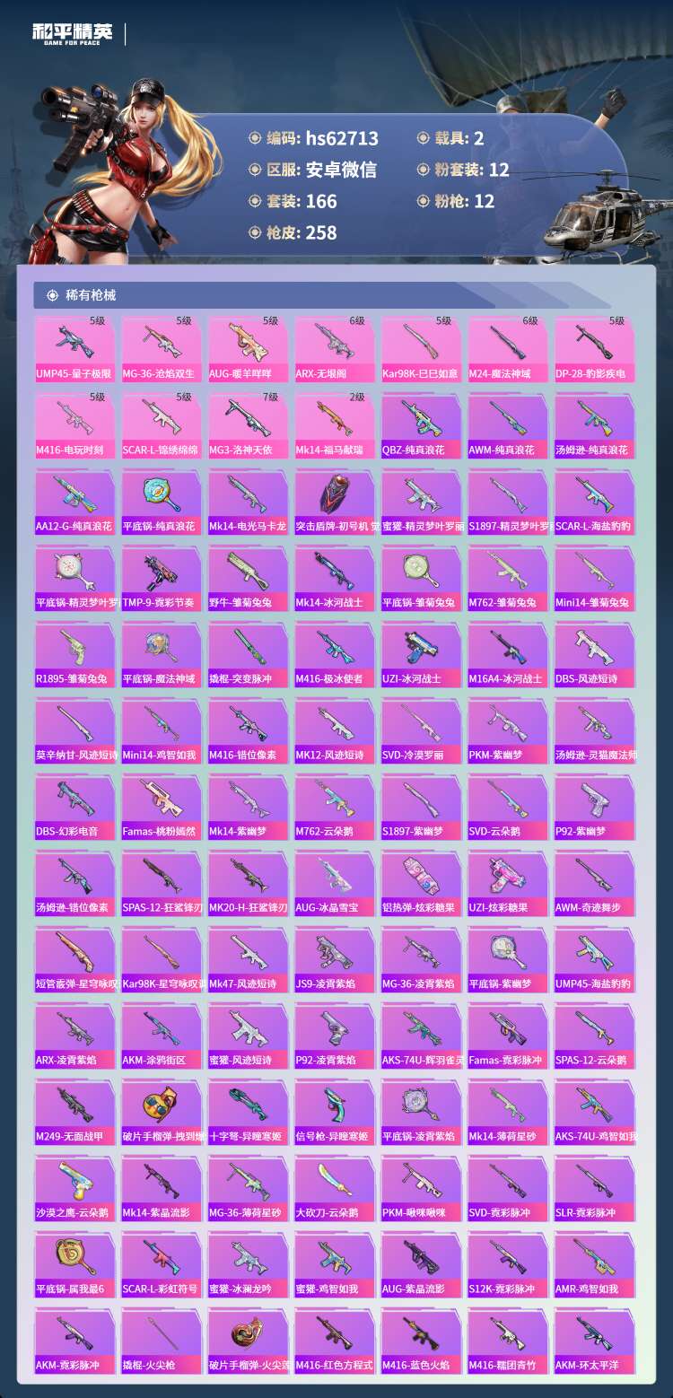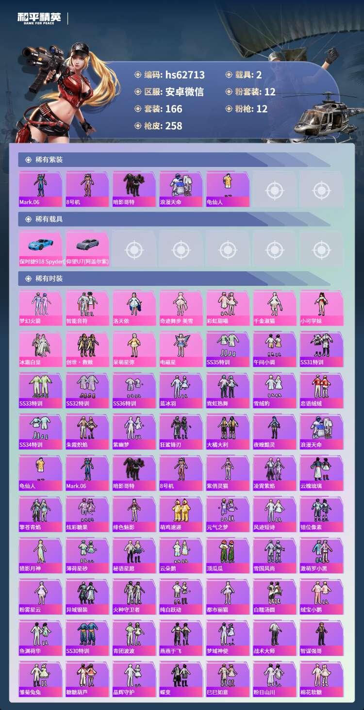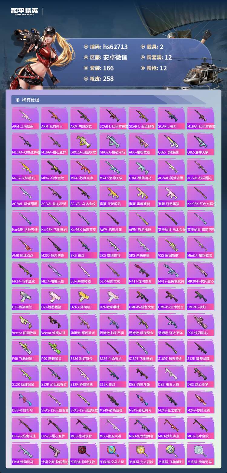 hs62713 安卓微-7王牌印记-12粉装-12特效枪-2载具-80110热力值-166套装-2
