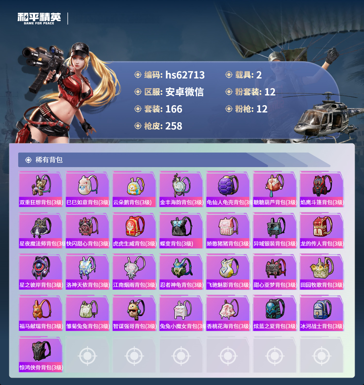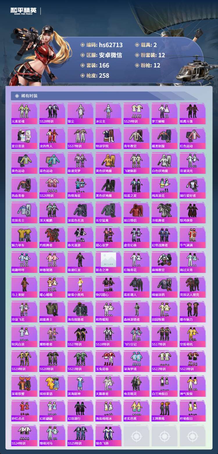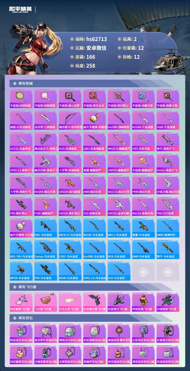 hs62713 安卓微-7王牌印记-12粉装-12特效枪-2载具-80110热力值-166套装-2