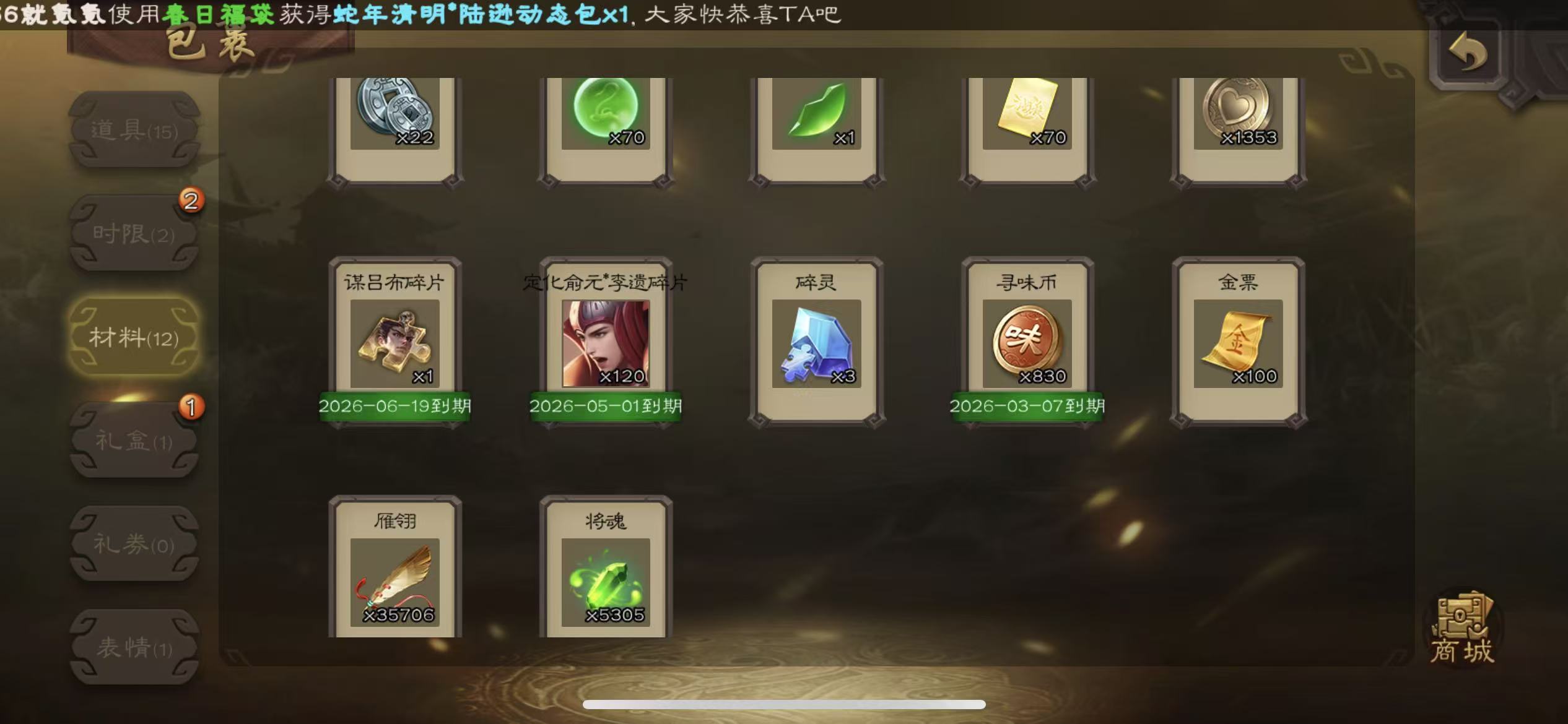 士兵70宝珠(可换火龙果势魏延)5300将魂3.5万羽毛67招募令三卡
