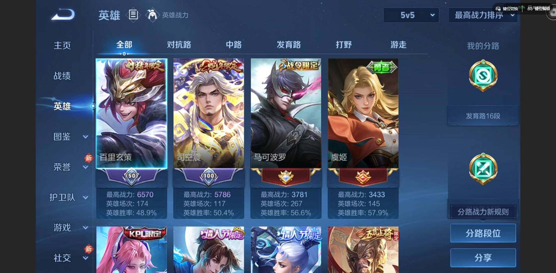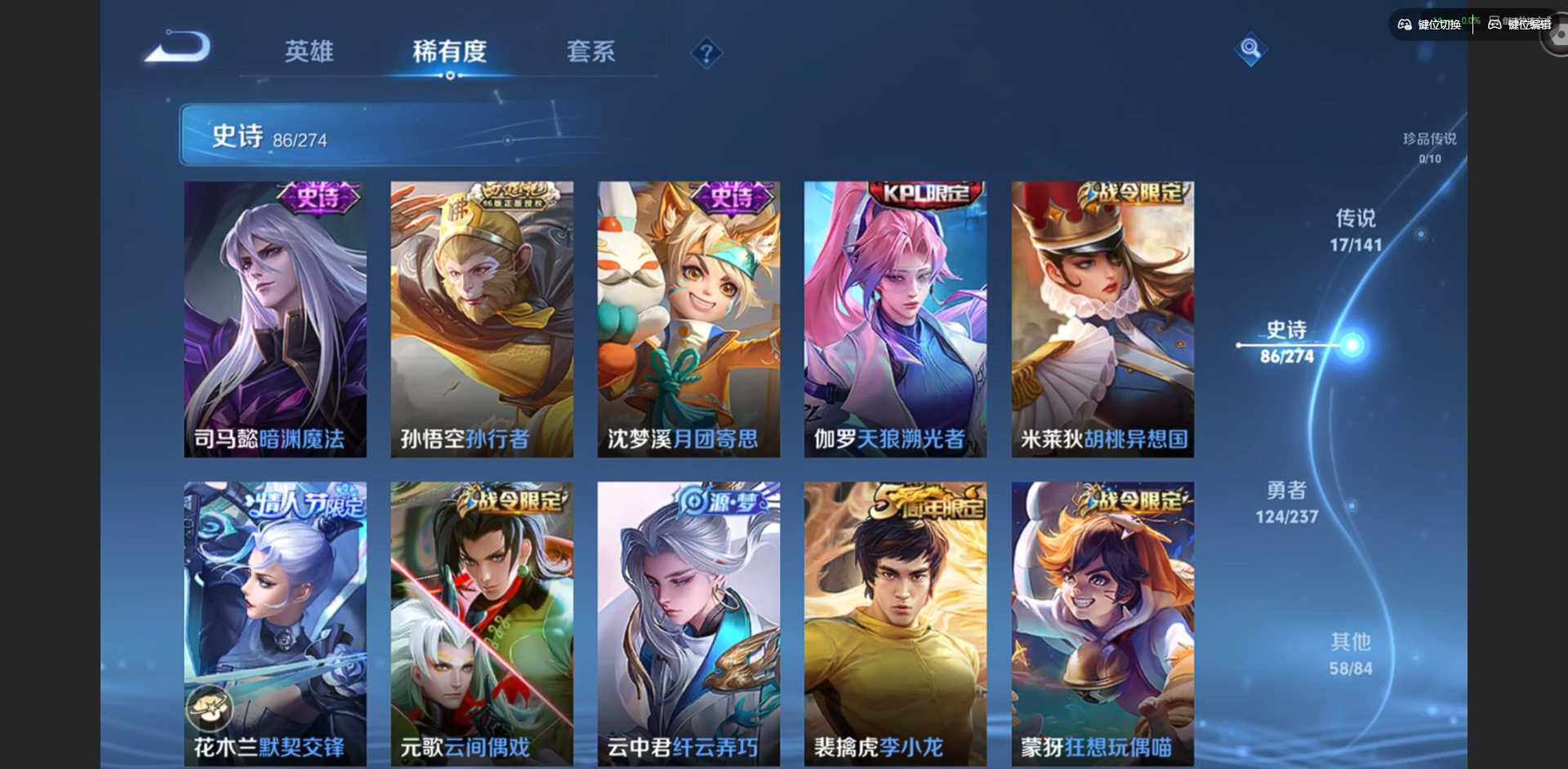 实名: 可修改 贵族等级: V8 英雄数: 127 皮肤数: 286 荣耀水晶: 神鉴启示录 传说皮: 一念神魔,地狱火,零号·赤焰,地狱之眼,胖达荣荣,李逍遥,鹤羽星尊,神树通天 限定皮: 冰锋战神,李小龙,梁祝,时雨天司,武圣,烈魂,辉光之辰,岱宗,天狼溯光者,神威,永曜之星,飞衡,凤求凰,白虎志,青龙志,瑞麟志,朱雀志,至尊宝,武陵仙君,如梦令-后羿,大圣娶亲
