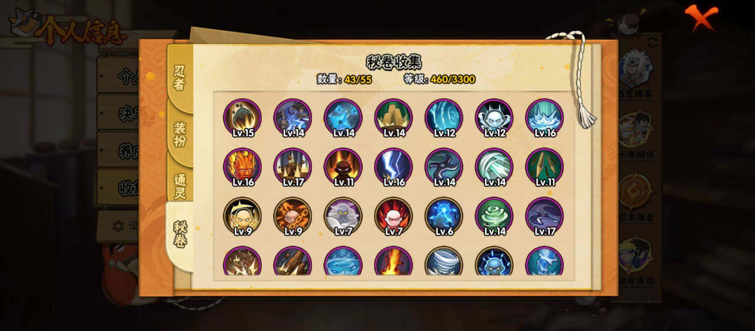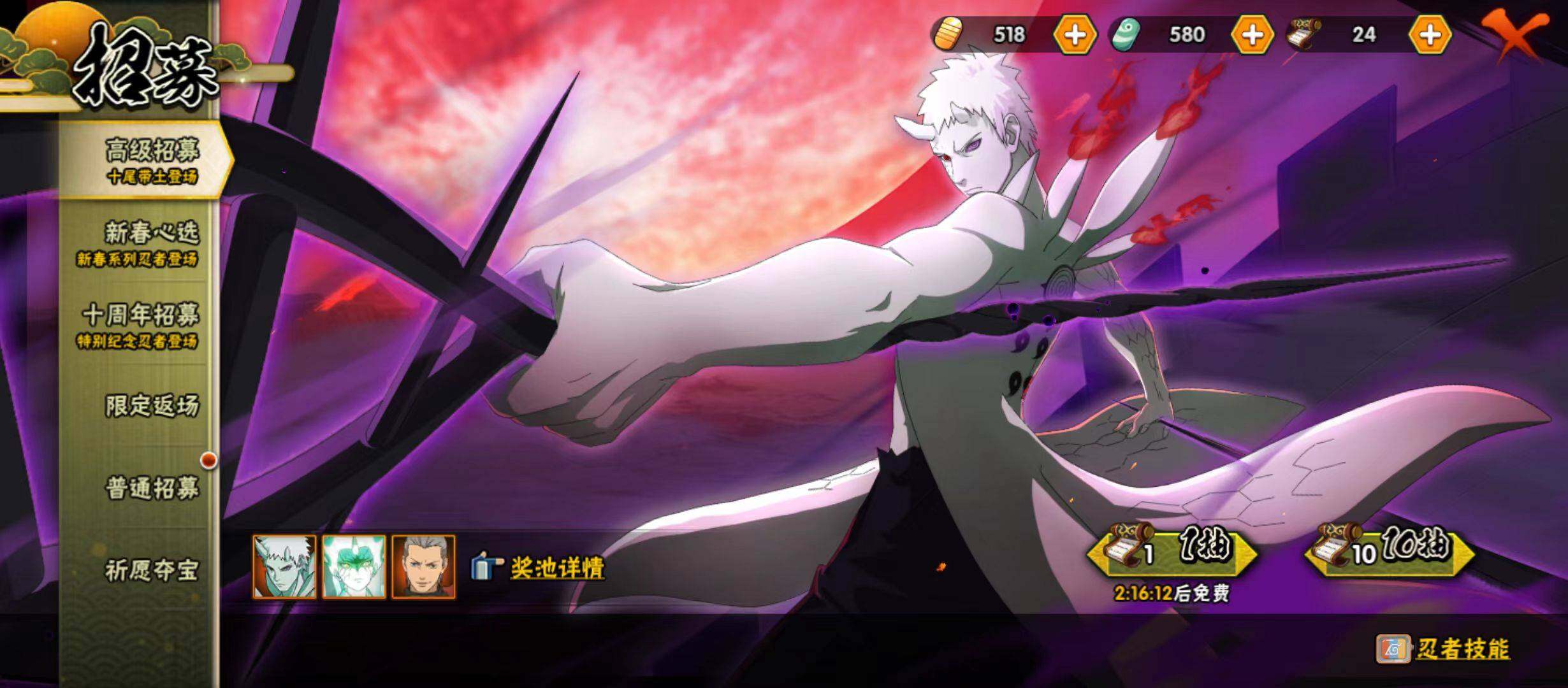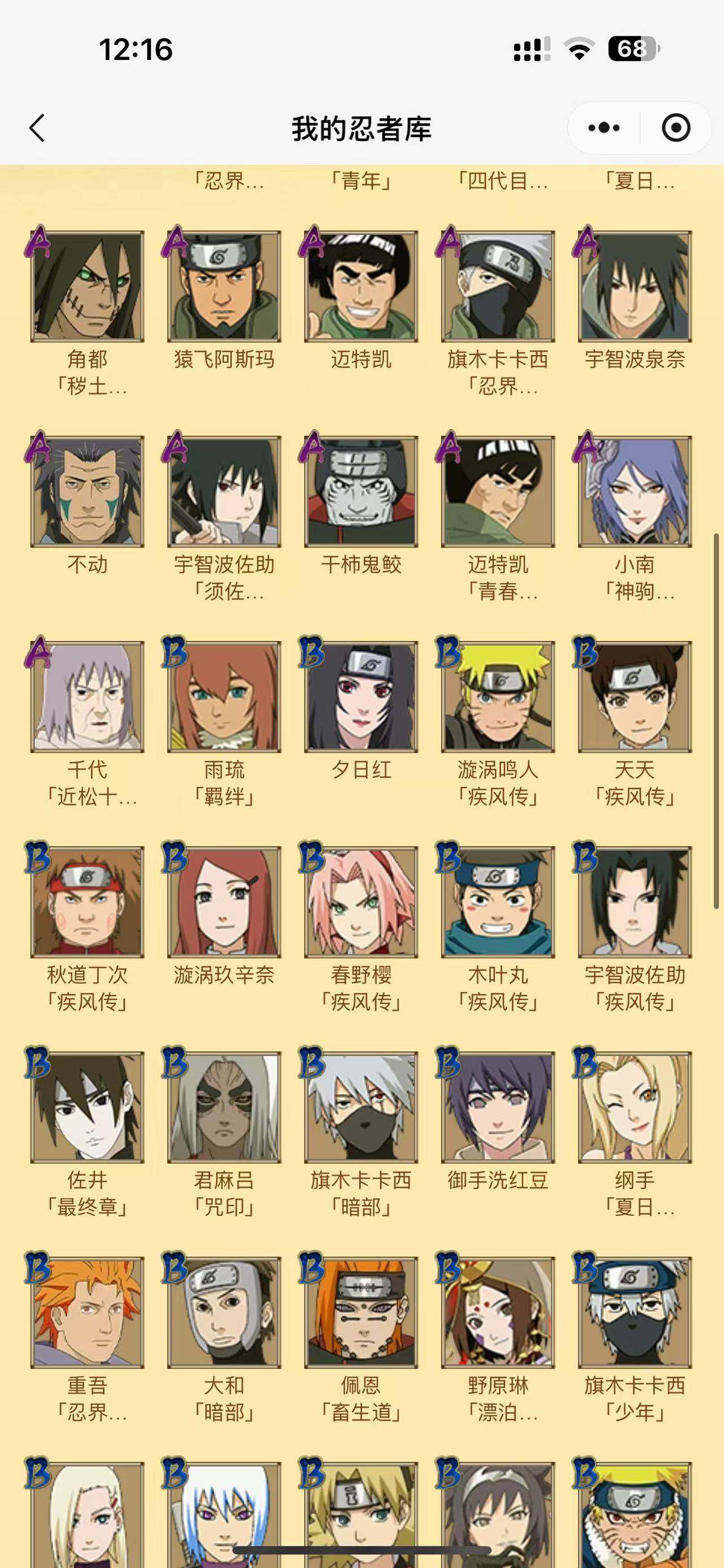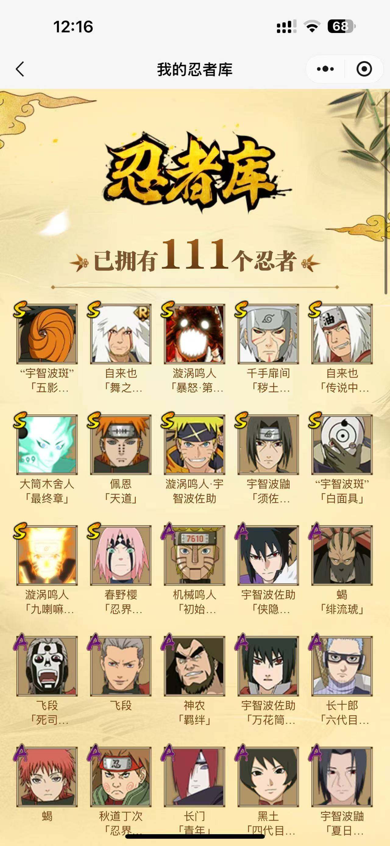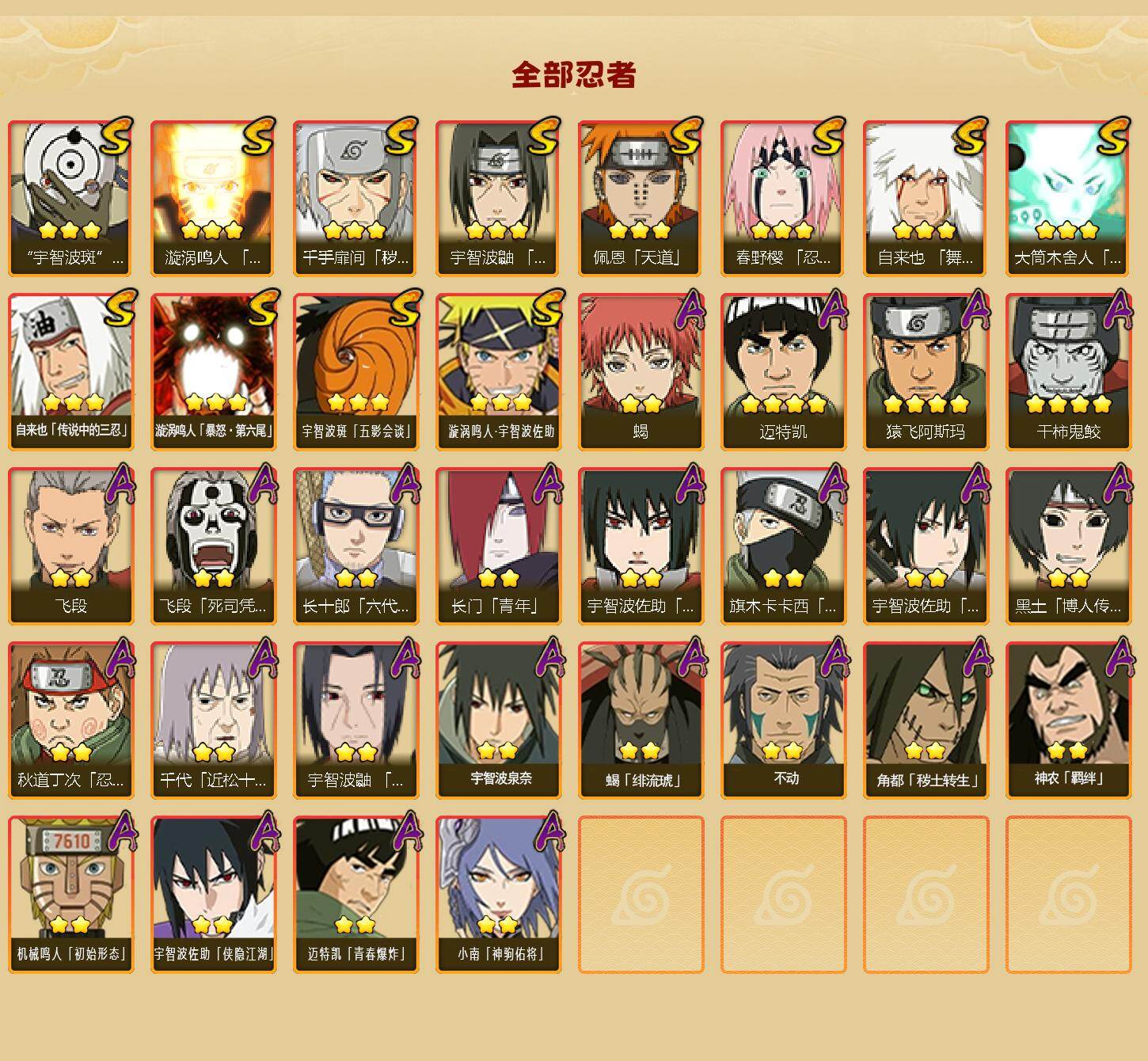 【S级忍者】:千手扉间「秽土转生」(3星),春野樱「忍界大战」(3星),宇智波鼬「须佐能乎」(3星),自来也「舞之豪杰」(3星),自来也「传说中的三忍」(3星),漩涡鸣人「九喇嘛连结」(3星),佩恩「天道」(3星),宇智波斑 「白面具」(3星宇智波斑「白面具」),大筒木舍人「最终章」(3星),漩涡鸣人「暴怒·第六尾」(3星),宇智波斑「五影会谈」(3星),漩涡鸣人