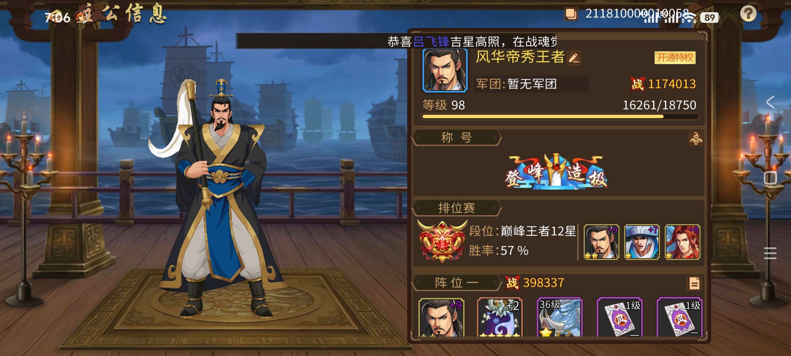 巅峰王者排位号,七星法正带皮肤,每周排位上巅峰,经常霸榜第一名!上分如喝水!