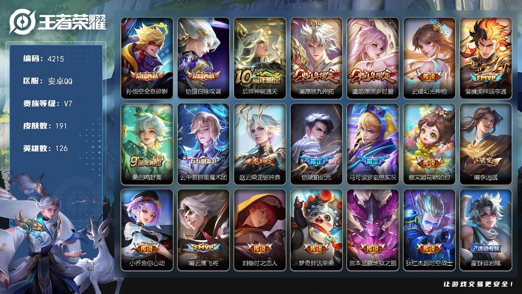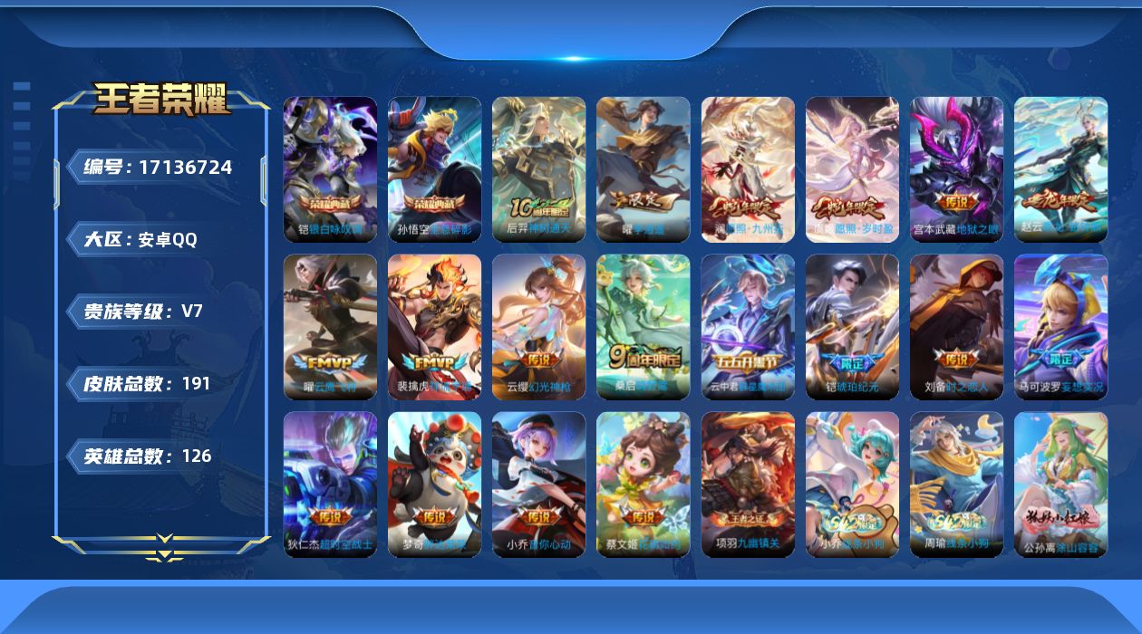 652-[17136724]贵族7-贵族积分30882-191皮2典藏18传说 安卓手Q412区191皮2典藏18传说0无双V7 营地ID1790763550至尊星耀II【荣耀典藏】:全息碎影,银白咏叹调【传说皮肤】:神树通天,地狱之眼,胖达荣荣,愿照·岁时盈,愿照·九州拓,祥瑞亨通,幻光神枪,音你心动,花朝如约,云鹰飞将,鸣野蒿,妄想实况,时之恋人,群星魔术团,李逍遥 ,乘龙·铭钟鼎,琥珀纪元,超时空战士【史诗皮肤】:线条小狗,无心,九幽镇关,蔷薇恋人,晚萤,涂山容容,乱世虎臣,百相守梦,