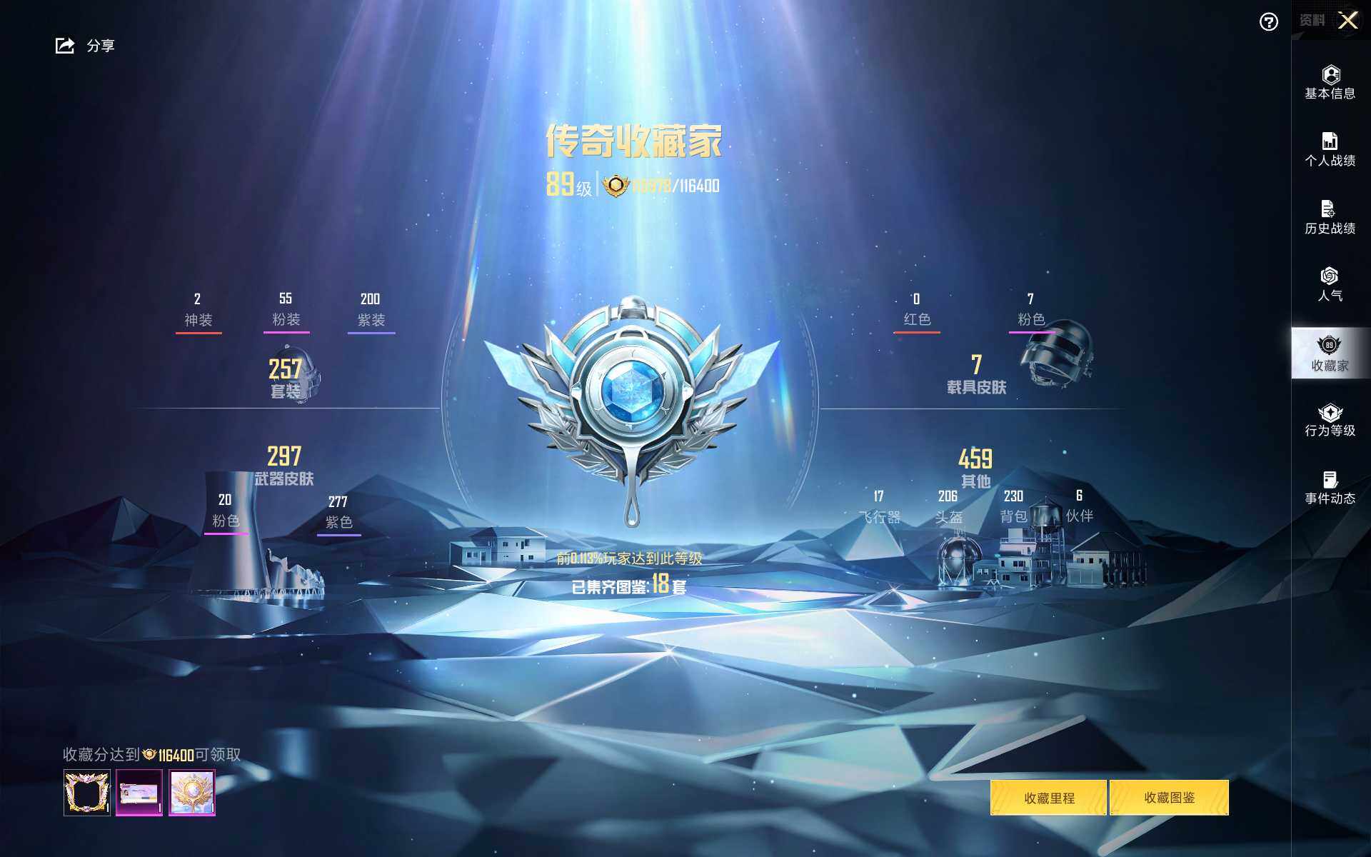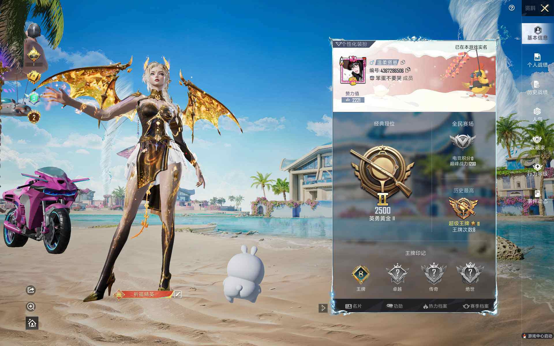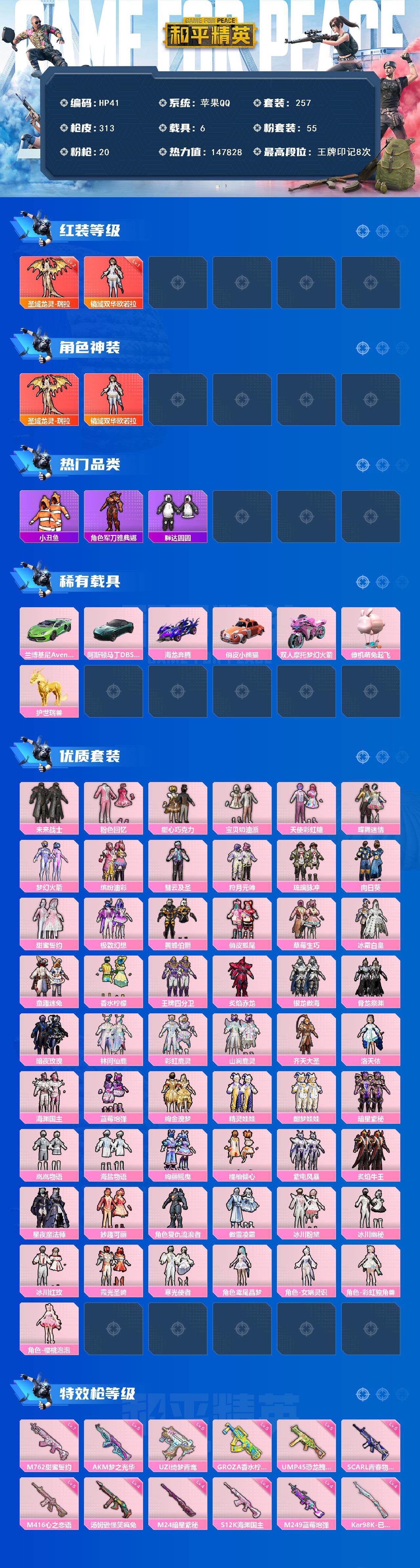 苹果 手Q-2神装-55粉装-20特效枪-6载具-17粉色飞行器-147828热力值-8王牌印记-257套装-313枪皮