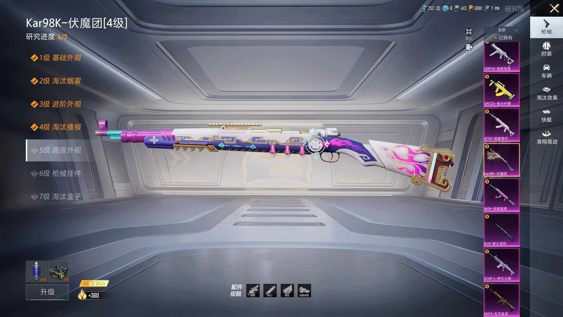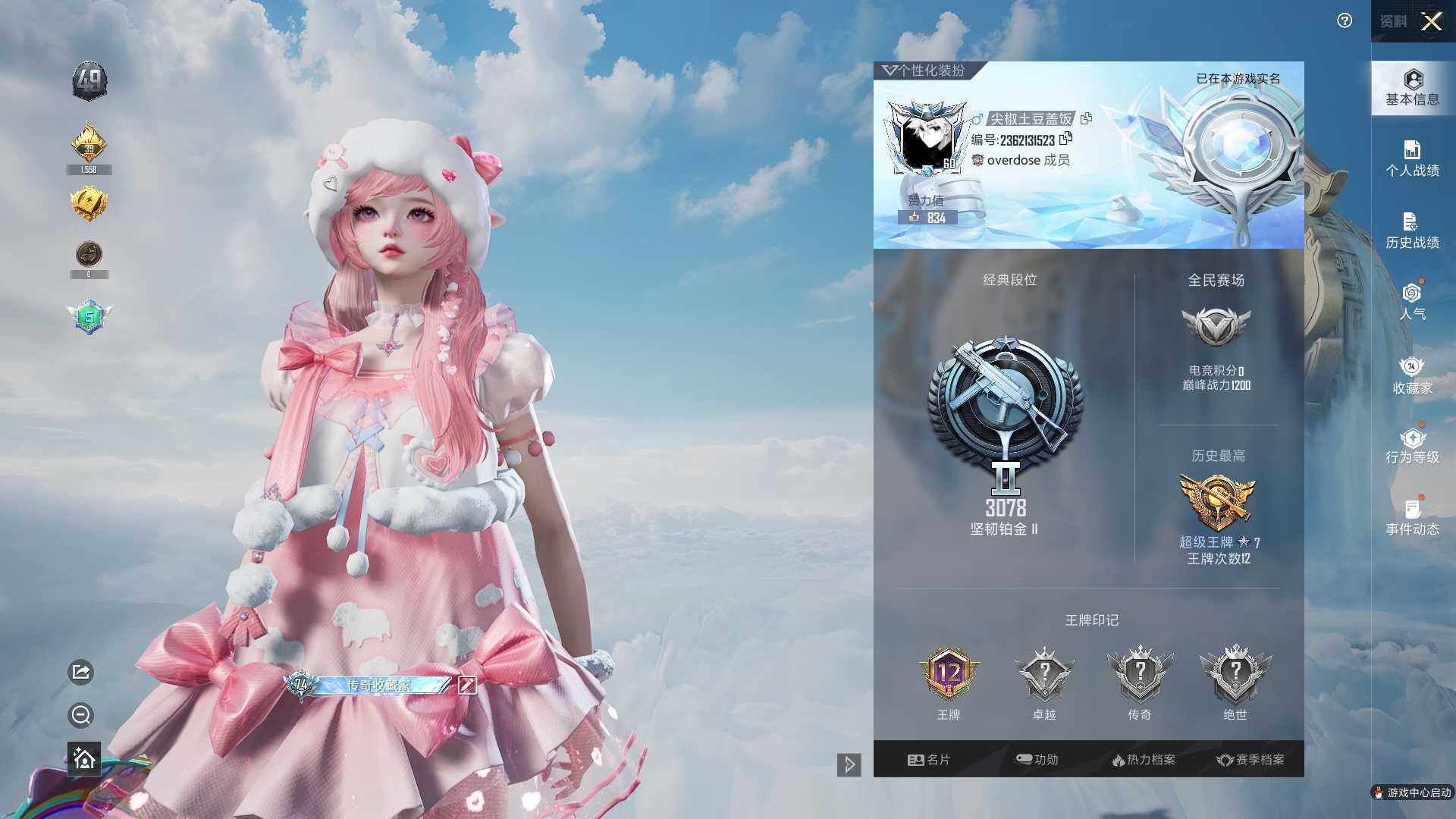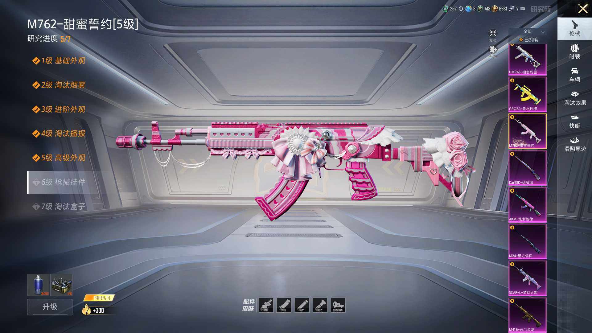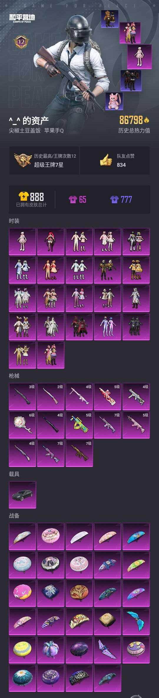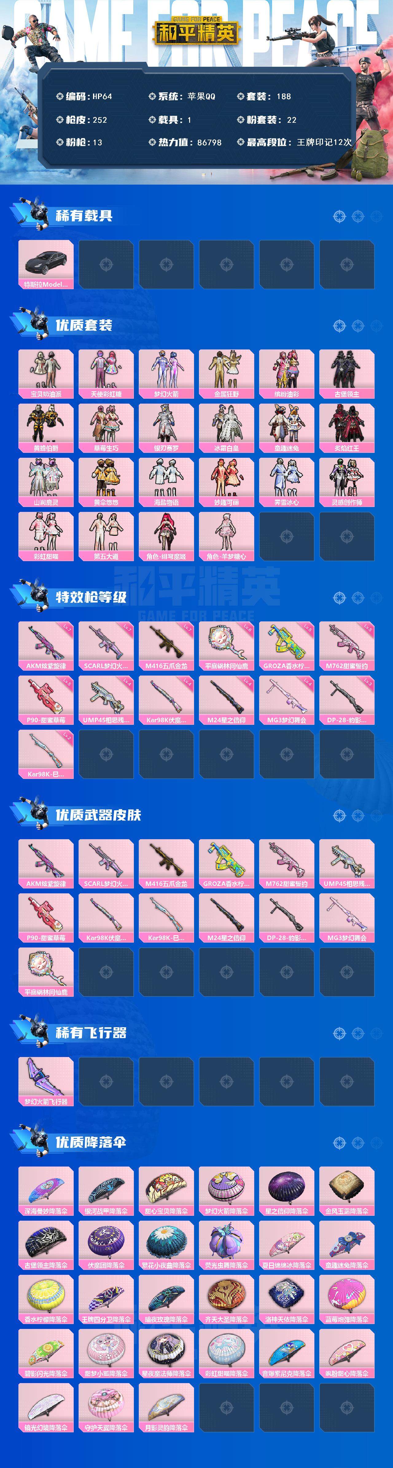 苹果 手Q-22粉装-13特效枪-1载具-2粉色飞行器-86798热力值-12王牌印记-188套装-252枪皮