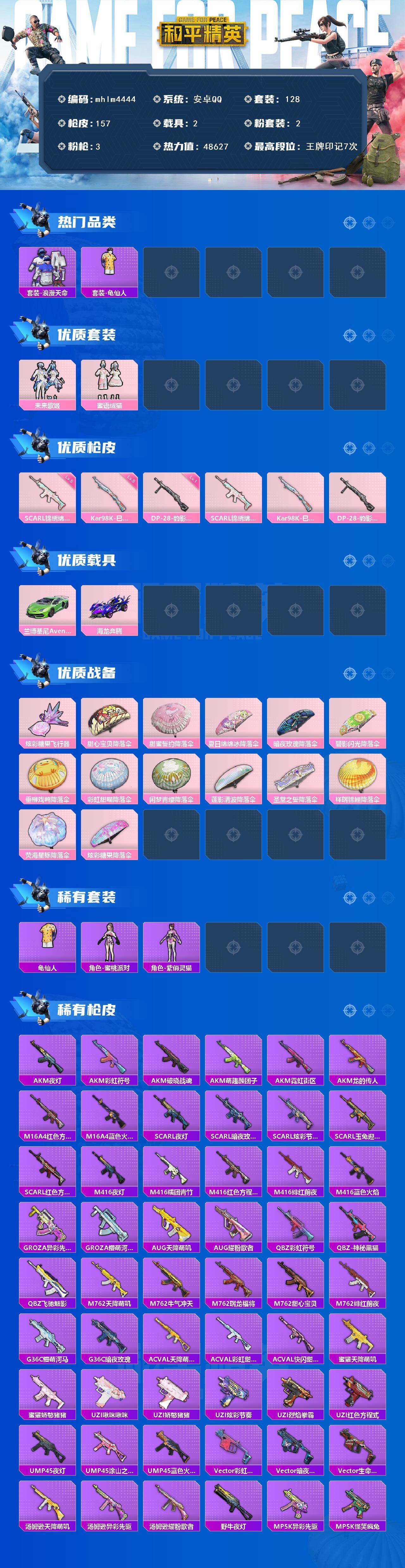【mhlm4444】安卓 手Q-2粉装-3特效枪-2载具-1粉色飞行器-48627热力值-7王牌印记-128套装-157枪皮