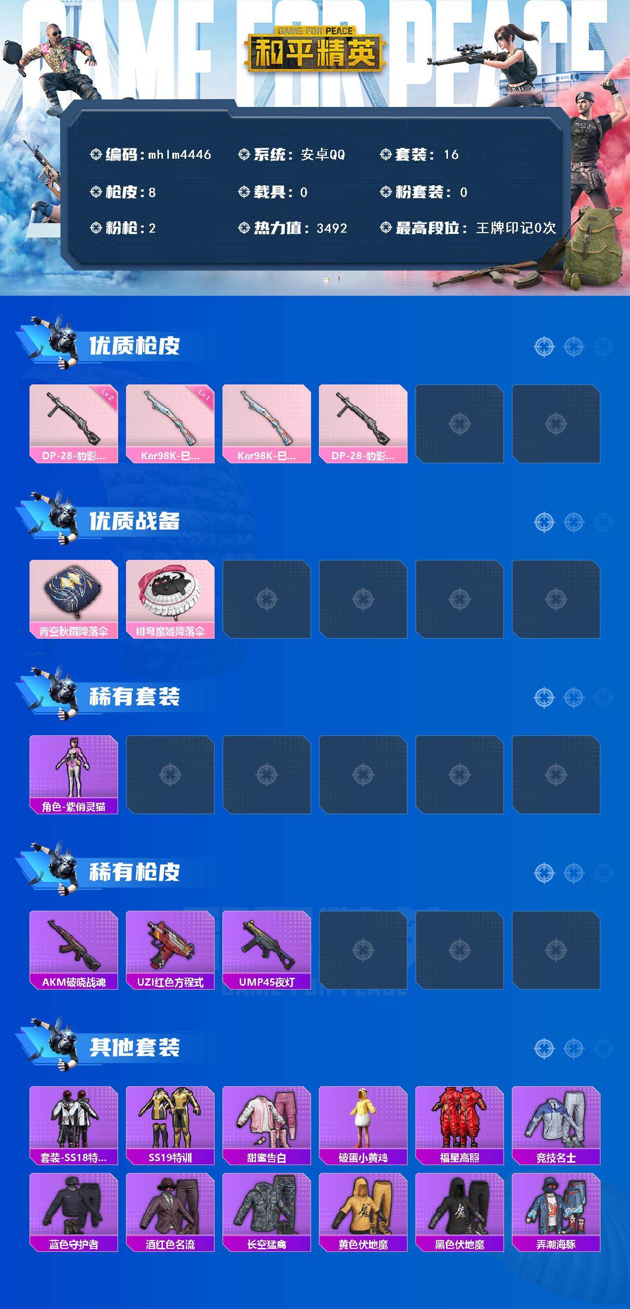 【mhlm4446】安卓 手Q-0粉装-2特效枪-0载具-0粉色飞行器-3492热力值-2王牌印记-16套装-8枪皮