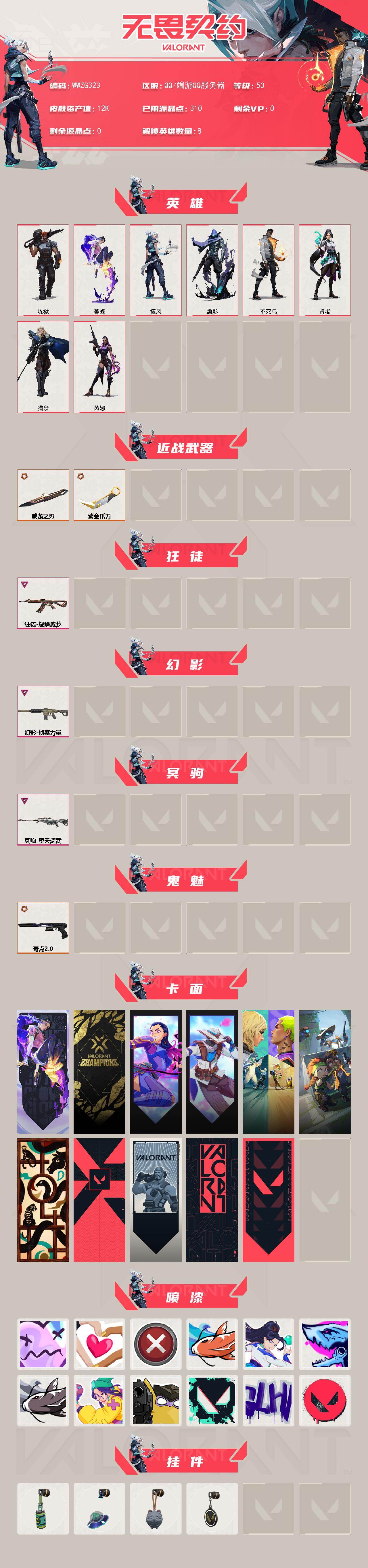 【WWZG323】终极*6/卓越*3/皮肤*31/等级*53/段位:白银/炼狱/暮蝶/捷风/幽影/不死鸟/贤者/猎枭/芮娜/近战武器-紫金爪刀/近战武器-威龙之刃/狂徒-耀鳞威龙/幻影-侦察力量/冥驹-堕天遗武/鬼魅-奇点//2.0/无畏契约:暮蝶 卡面/艺无止境//全球冠军赛 卡面/无畏契约GO!第一卷:芮娜 卡面/无畏契约GO!第一卷:零 卡面/钢锁vs盖可 卡面/别冒尖 卡面/萌彩剪影 卡面/代号红色 卡面/新兵报到 卡面/V契约 卡面/无畏契约 卡面/伤心心 喷漆/双人比心 喷漆/买装还