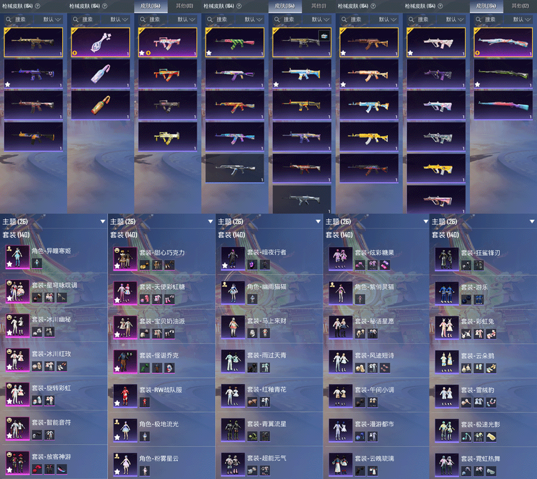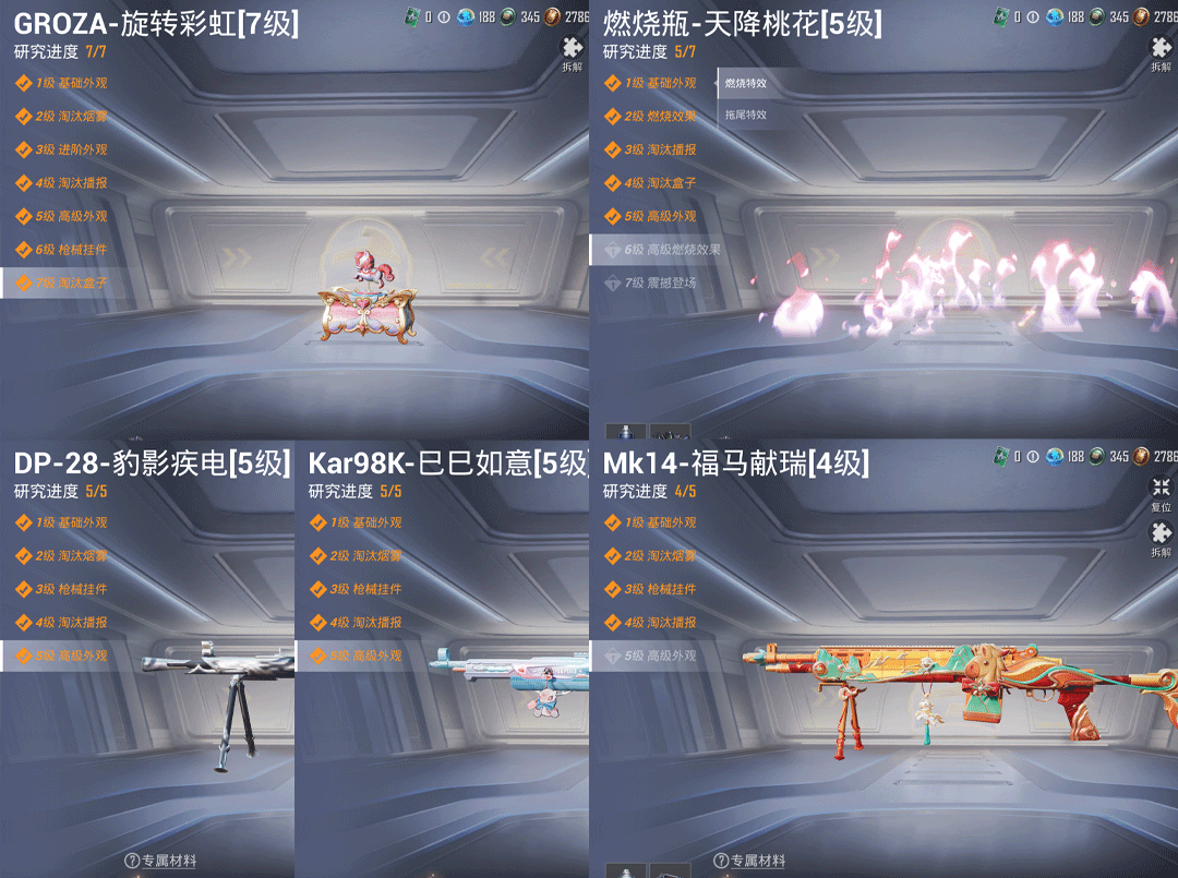 特效枪5:GROZA-旋转彩虹7级,燃烧瓶-天降桃花5级,MK-14-福马献瑞4级,DP-28-豹影疾电5级,kar98k-巳巳如意5级