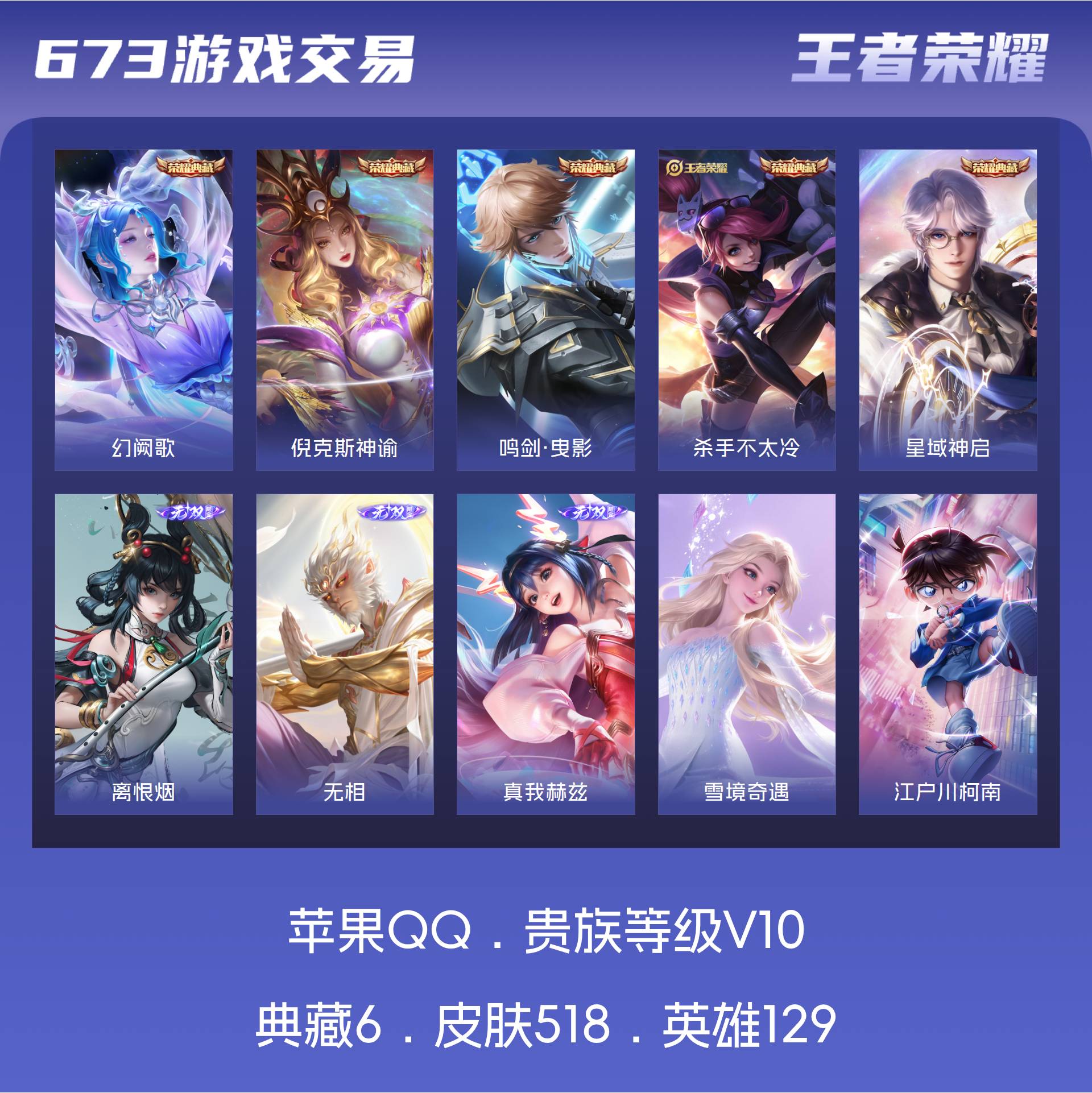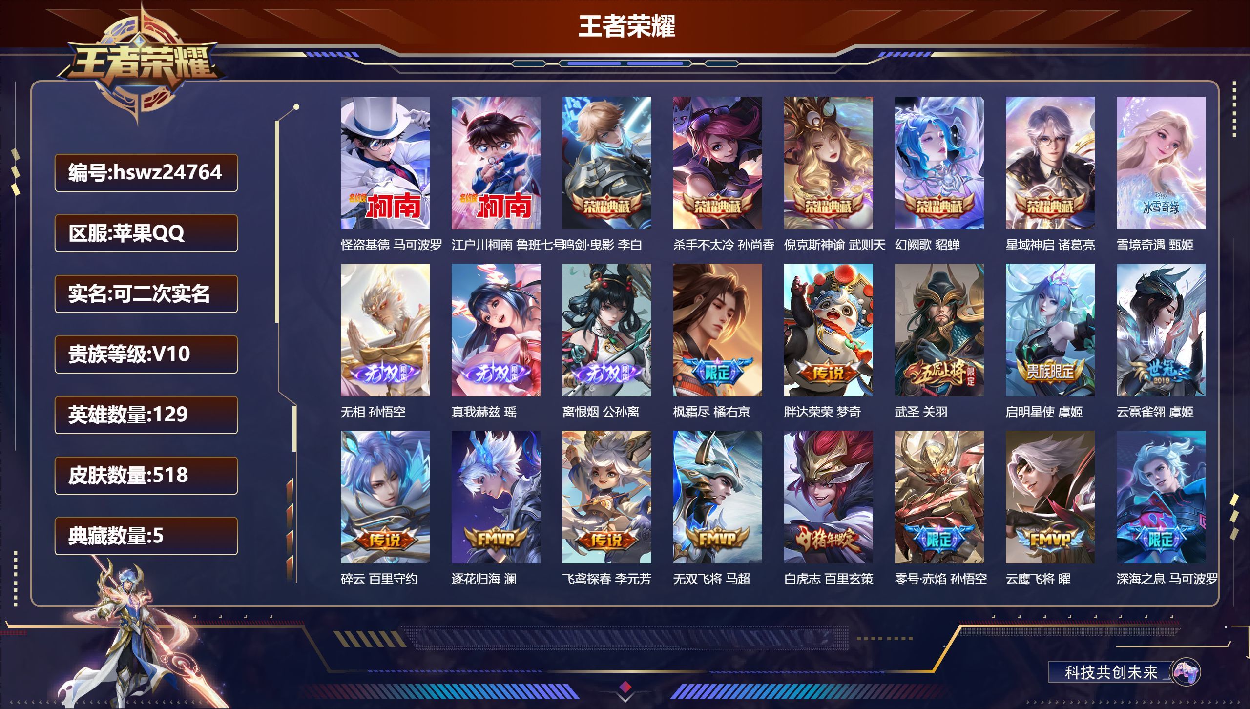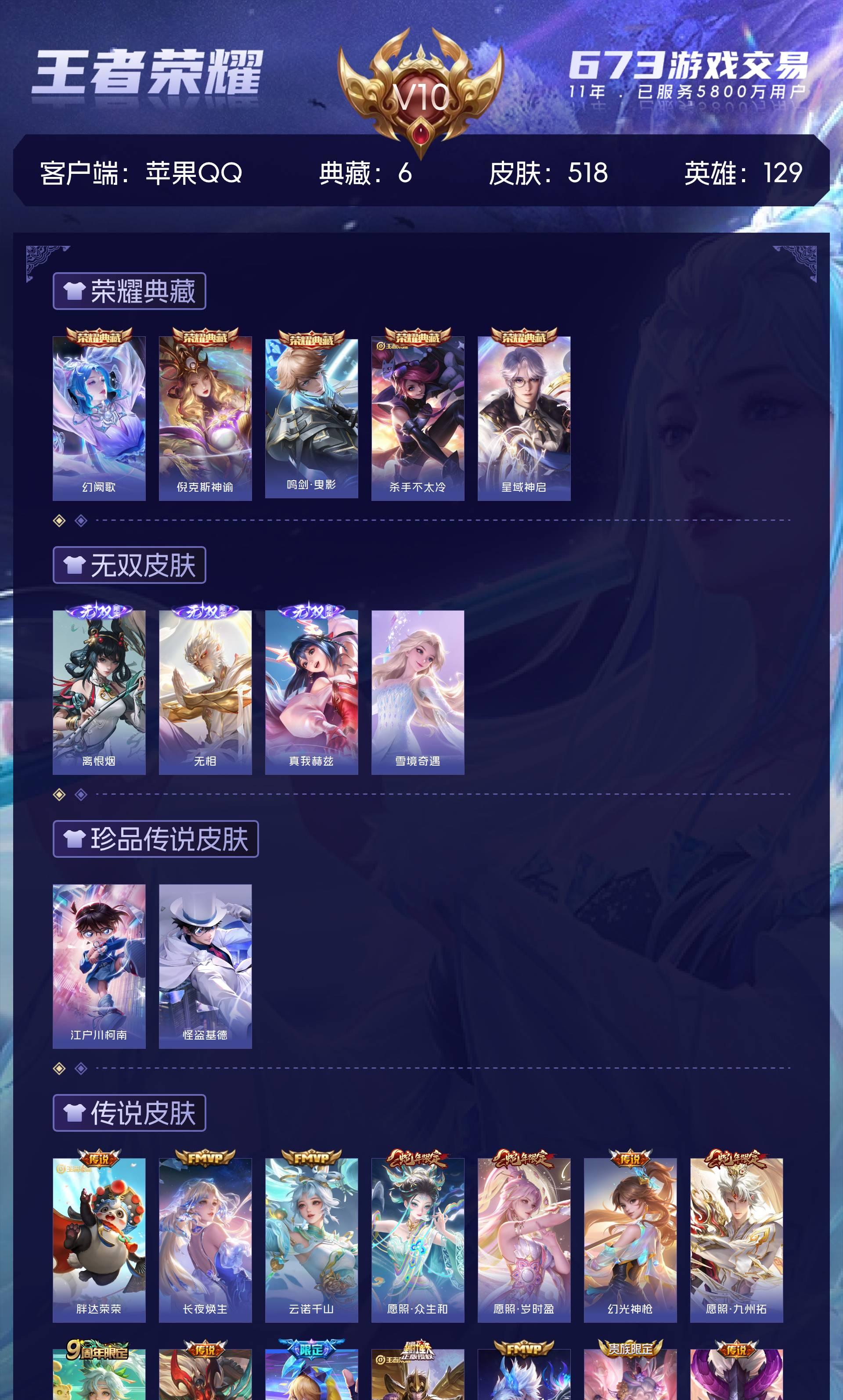 苹果QQ/至圣王者/518皮肤/129英雄/5典藏/0珍品无双/4无双/2珍品传说/48传说/177