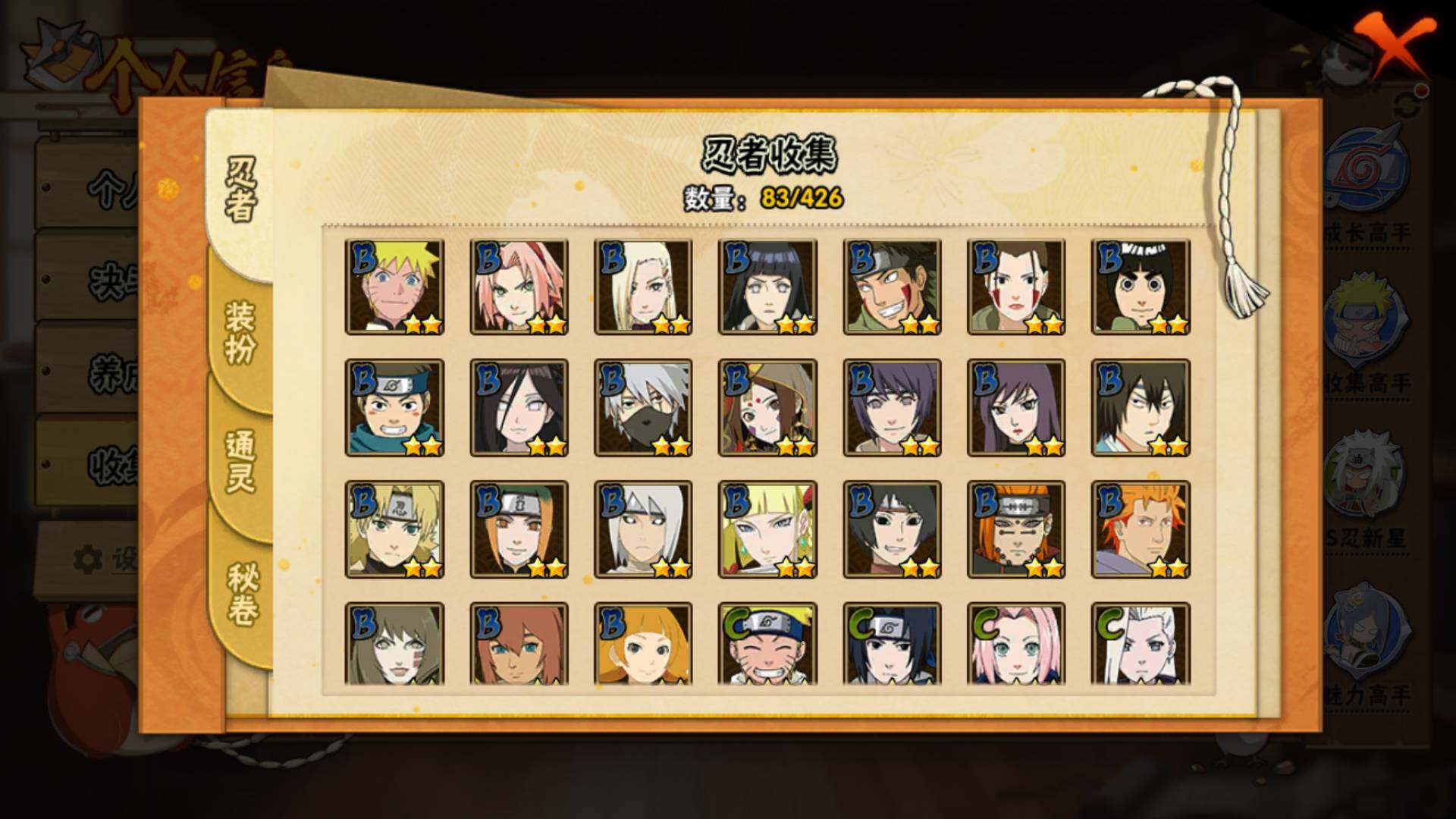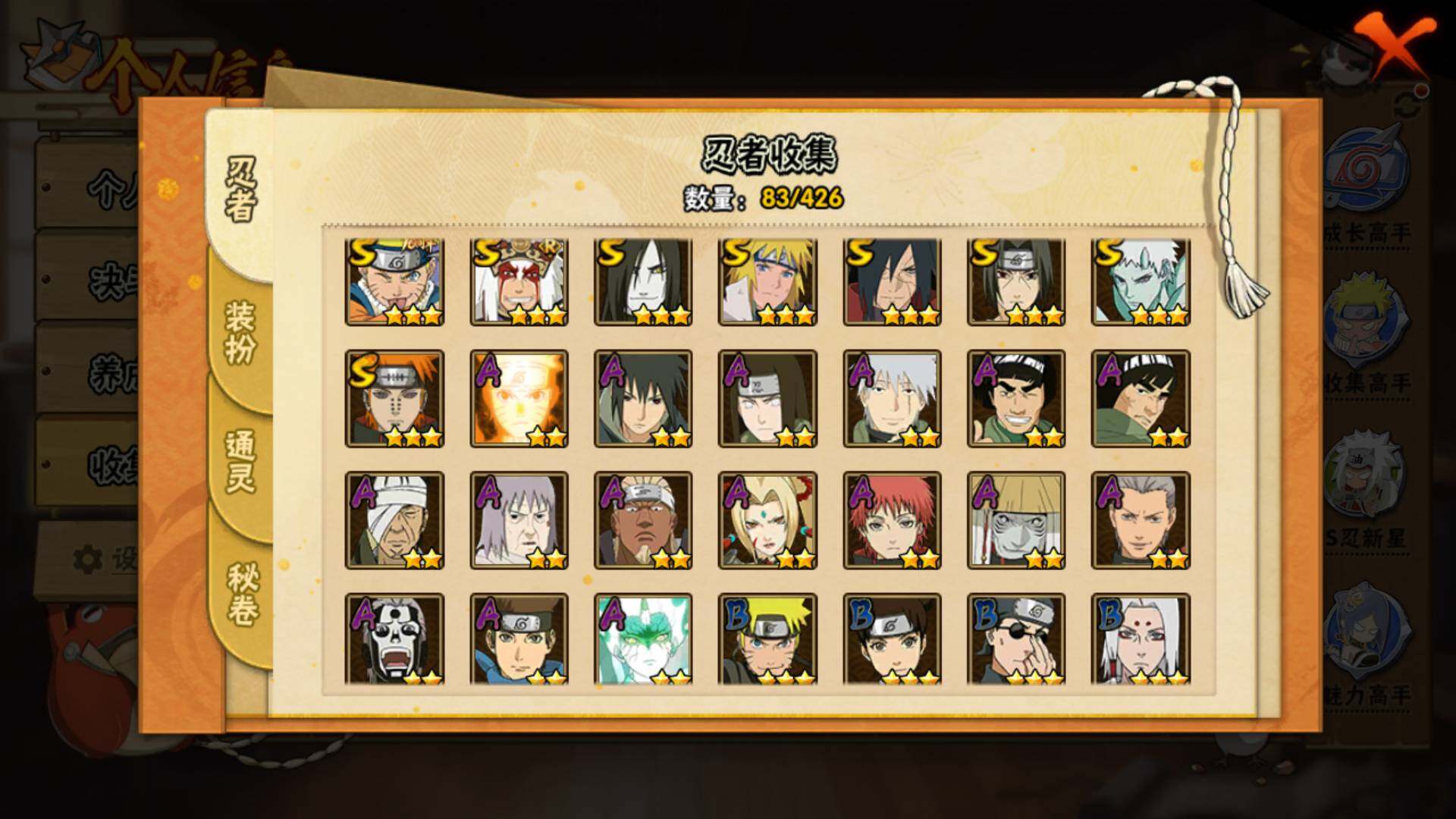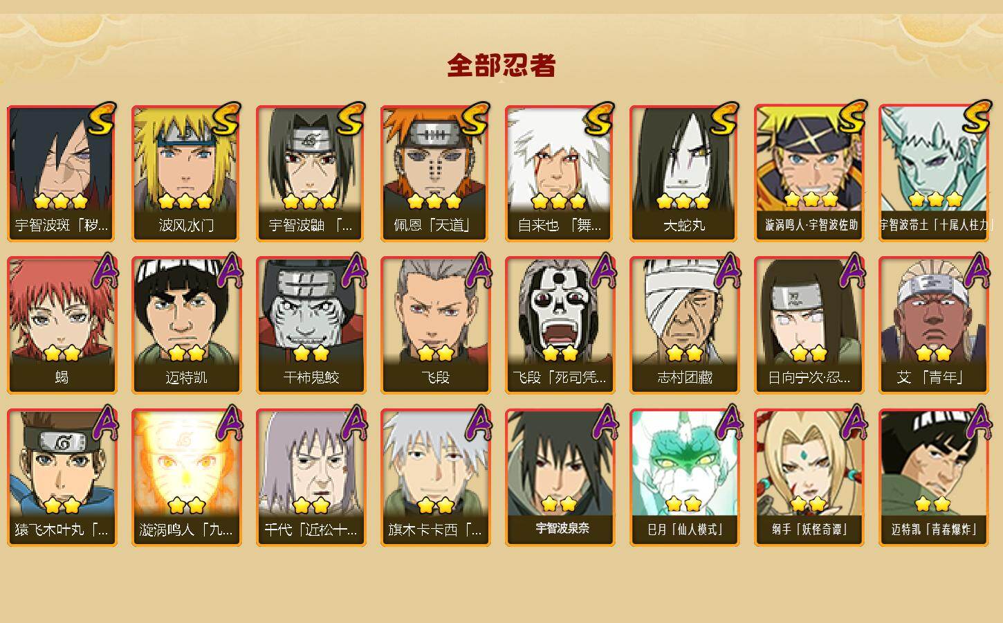 【S级忍者】:宇智波斑「秽土转生·解」(3星),宇智波鼬「须佐能乎」(3星),自来也「舞之豪杰」(3星),大蛇丸(3星),波风水门(3星),佩恩「天道」(3星),漩涡鸣人·宇智波佐助(3星),宇智波带土「十尾人柱力」(3星)