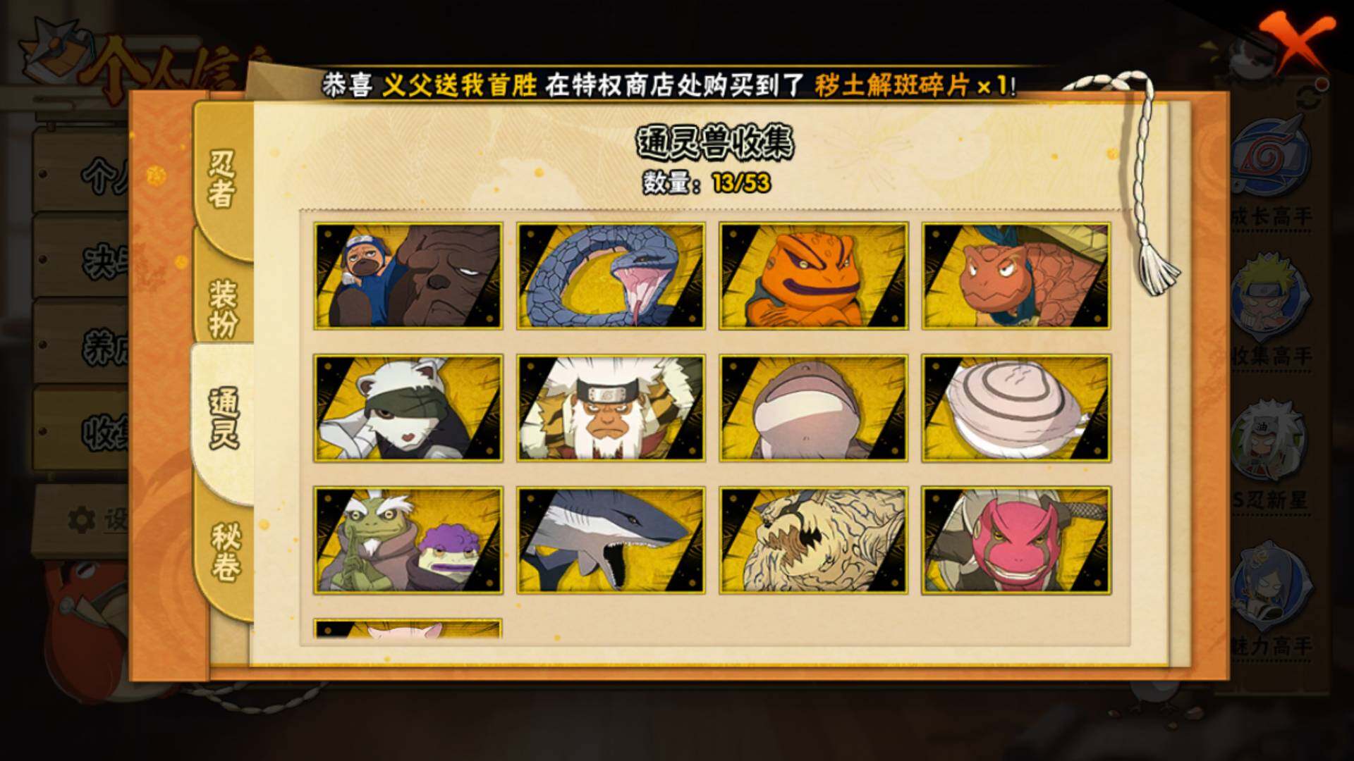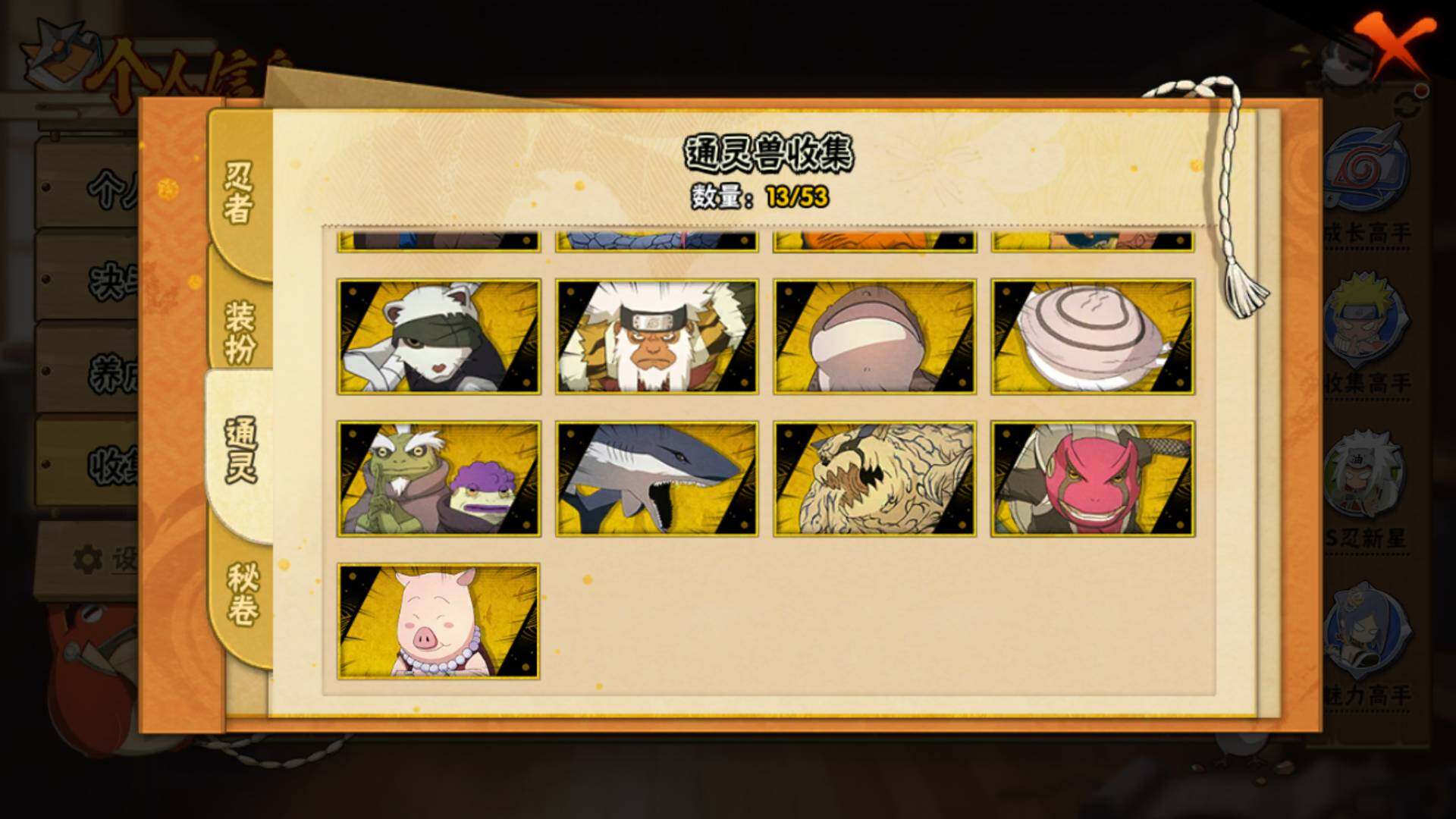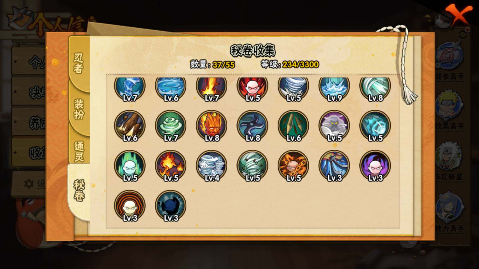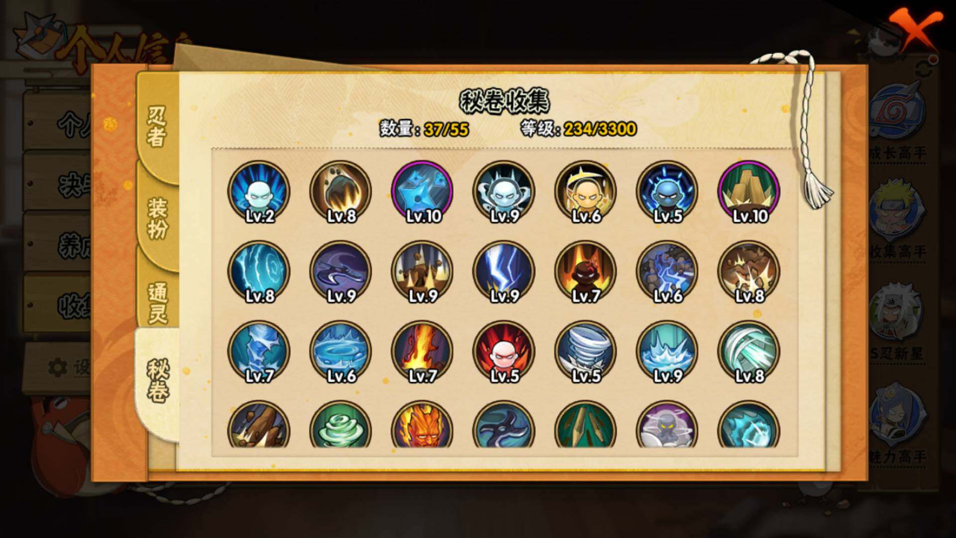 【S级忍者】:宇智波斑「秽土转生·解」(3星),宇智波鼬「须佐能乎」(3星),自来也「舞之豪杰」(3星),大蛇丸(3星),波风水门(3星),佩恩「天道」(3星),漩涡鸣人·宇智波佐助(3星),宇智波带土「十尾人柱力」(3星)